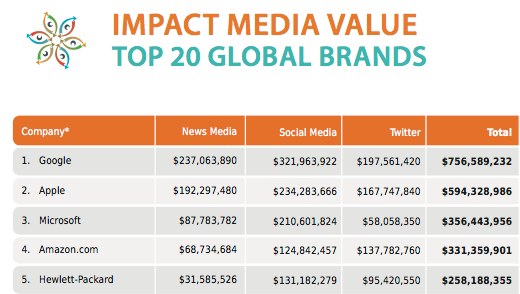 媒体价值是一个粗略的标准,General Sentiment的研究报告试图确定“购买品牌的等同价值,遴选标准是市场看法、曝光频率、新闻媒体曝光率以及社交对话”等各种因素。正面的新闻报道或是社交网络上的正面消息会提高公司的媒体价值,反之亦然。General Sentiment宣称,该公司对5000多万个消息来源进行了分析,才得出报告中的数据。