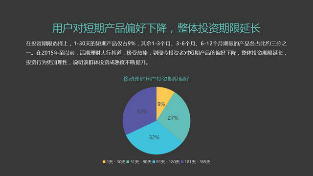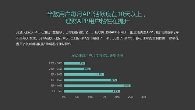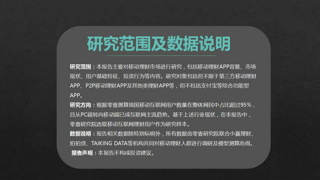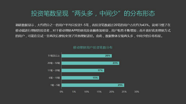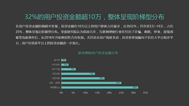 通过数据调研及模型测算,零壹研究院认为具有男性、中青年、高学历、沿海地区居民等标签的人群更愿意通过移动端进行理财。此外,本报告还从投资金额、投资笔数、投资偏好期限、APP使用时长等方面对移动理财用户投资行为进行观测和分析。