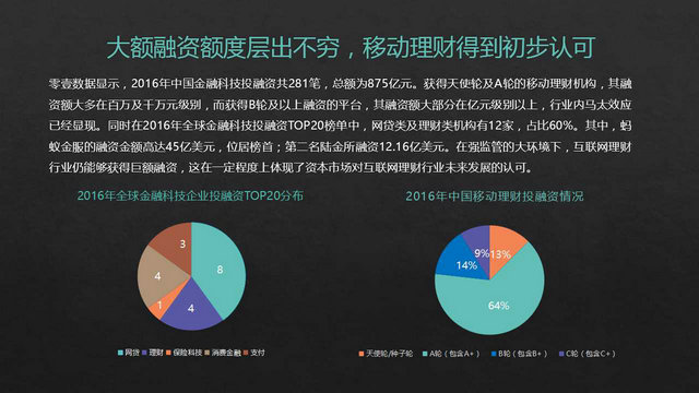 根据零壹数据,在2016年全球金融科技投融资TOP20榜单中,网贷类及理财类机构占比60%,资本市场对互联网理财行业未来发展表示了一定的认可。随着监管趋严,移动理财企业增速放缓,整体行业正在由野蛮增长时期转变为理性发展阶段。