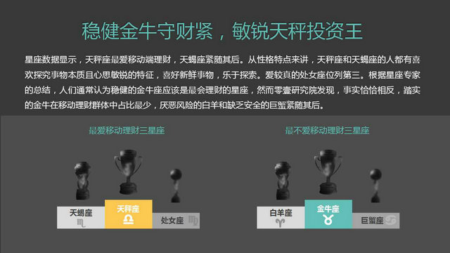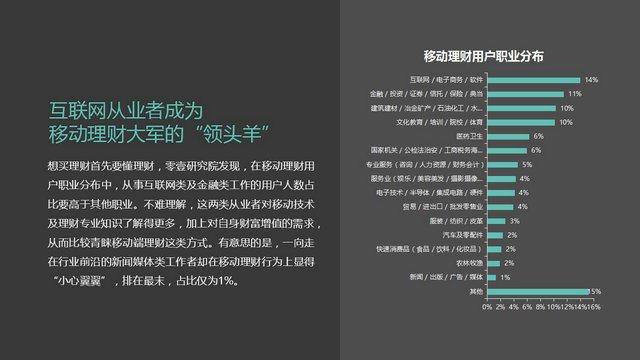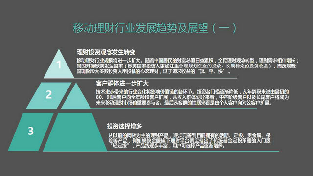 对于移动理财行业未来的发展趋势,零壹研究院认为用户的投资理财观念正在转变,客户群体在扩大,投资选择在增加,同时整个行业呈现交互趣味化、产品场景化、理财社群化等发展趋势特征。