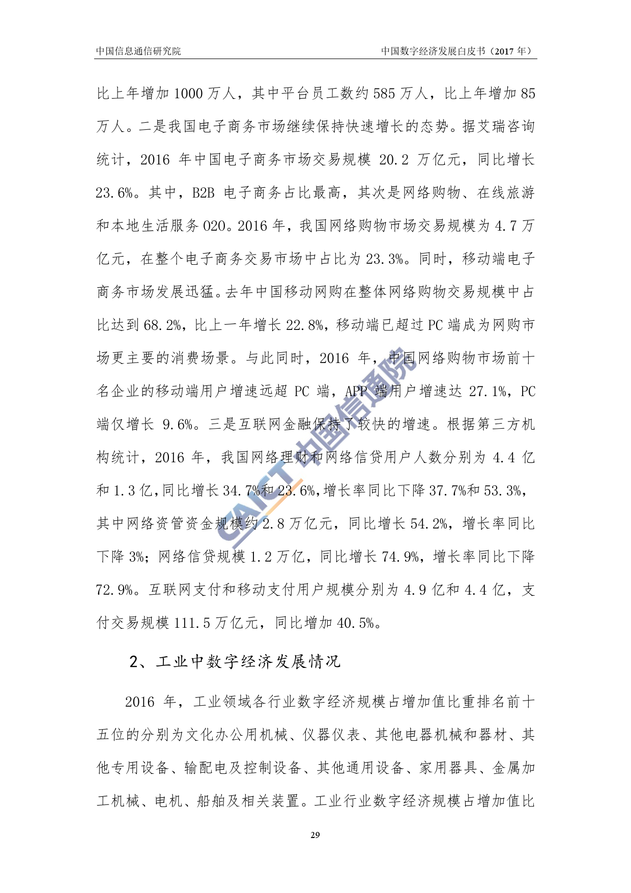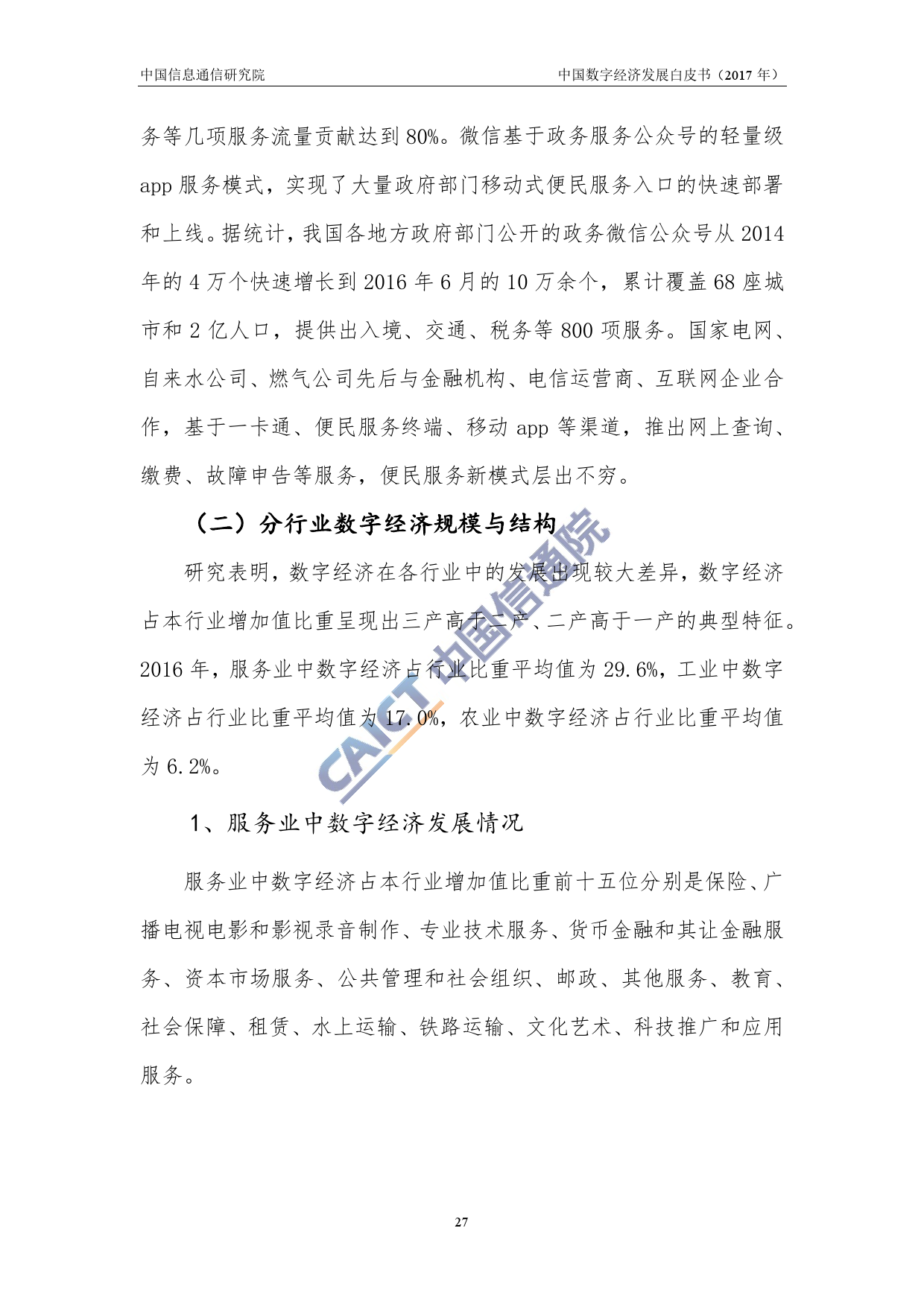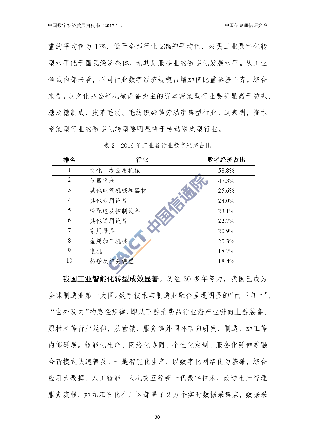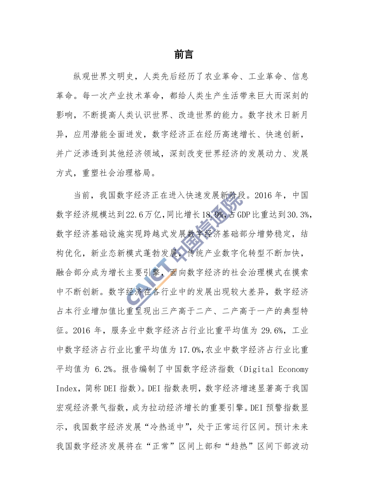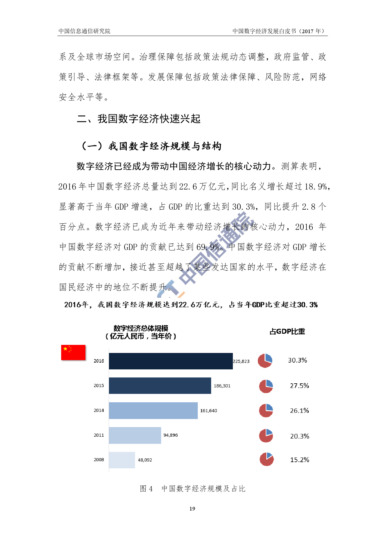 当前,我国数字经济正在进入快速发展新阶段。2016年,中国数字经济规模达到22.6万亿,同比增长18.9%,占GDP比重达到30.3%,数字经济基础设施实现跨越式发展数字经济基础部分增势稳定,结构优化,新业态新模式蓬勃发展,传统产业数字化转型不断加快,融合部分成为增长主要引擎,面向数字经济的社会治理模式在摸索中不断创新。数字经济在各行业中的发展出现较大差异,数字经济占本行业增加值比重呈现出三产高于二产、二产高于一产的典型特征。