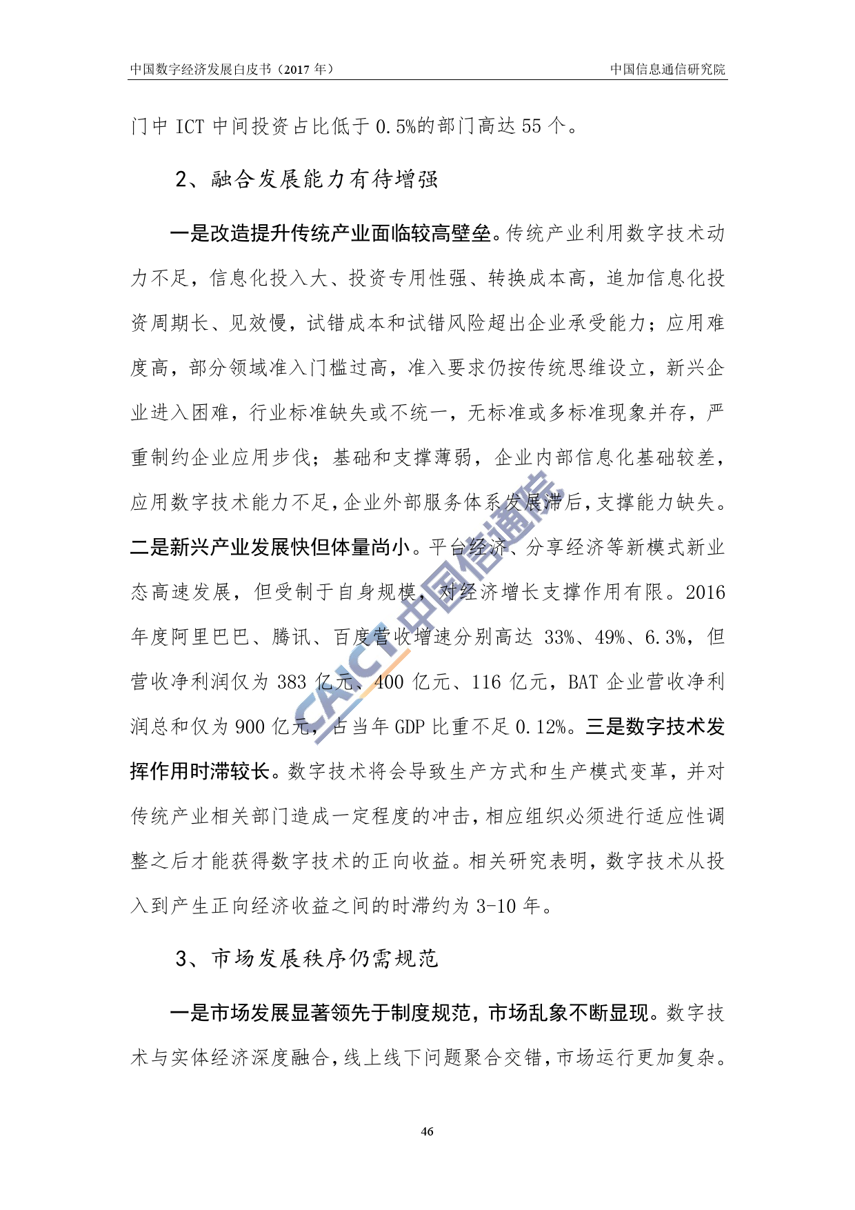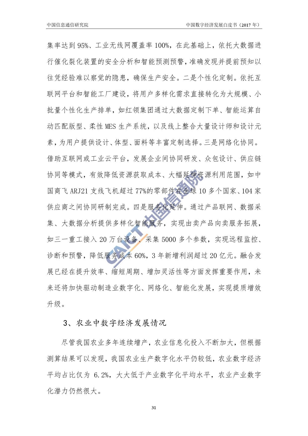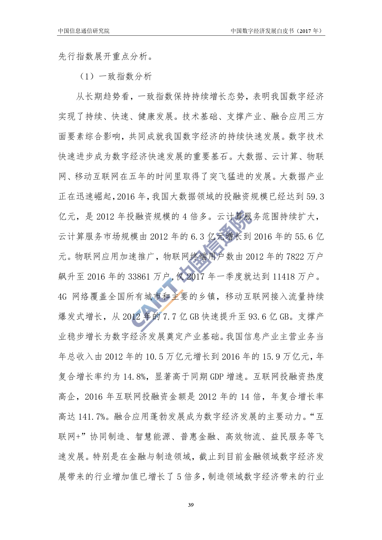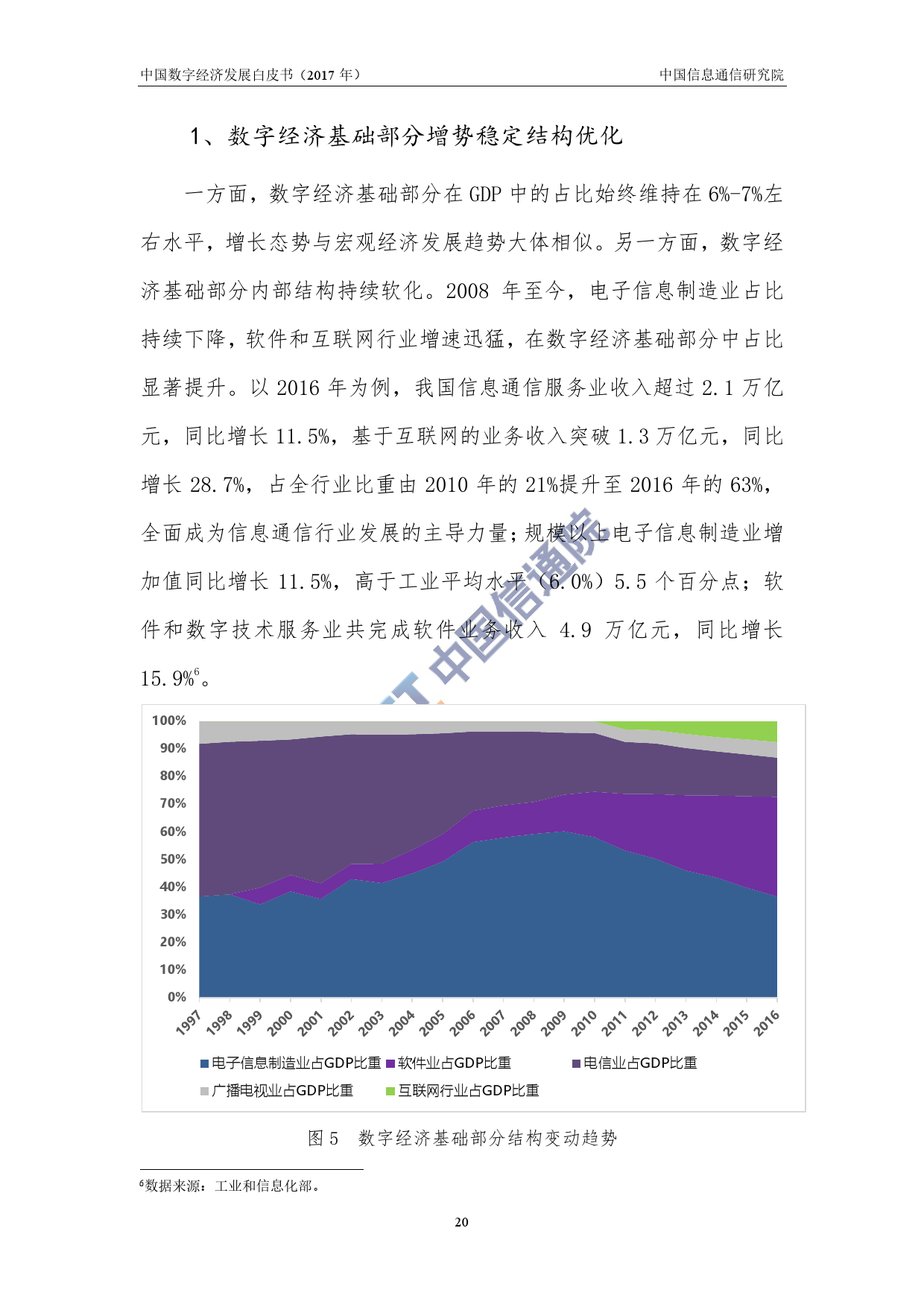 当前,我国数字经济正在进入快速发展新阶段。2016年,中国数字经济规模达到22.6万亿,同比增长18.9%,占GDP比重达到30.3%,数字经济基础设施实现跨越式发展数字经济基础部分增势稳定,结构优化,新业态新模式蓬勃发展,传统产业数字化转型不断加快,融合部分成为增长主要引擎,面向数字经济的社会治理模式在摸索中不断创新。数字经济在各行业中的发展出现较大差异,数字经济占本行业增加值比重呈现出三产高于二产、二产高于一产的典型特征。