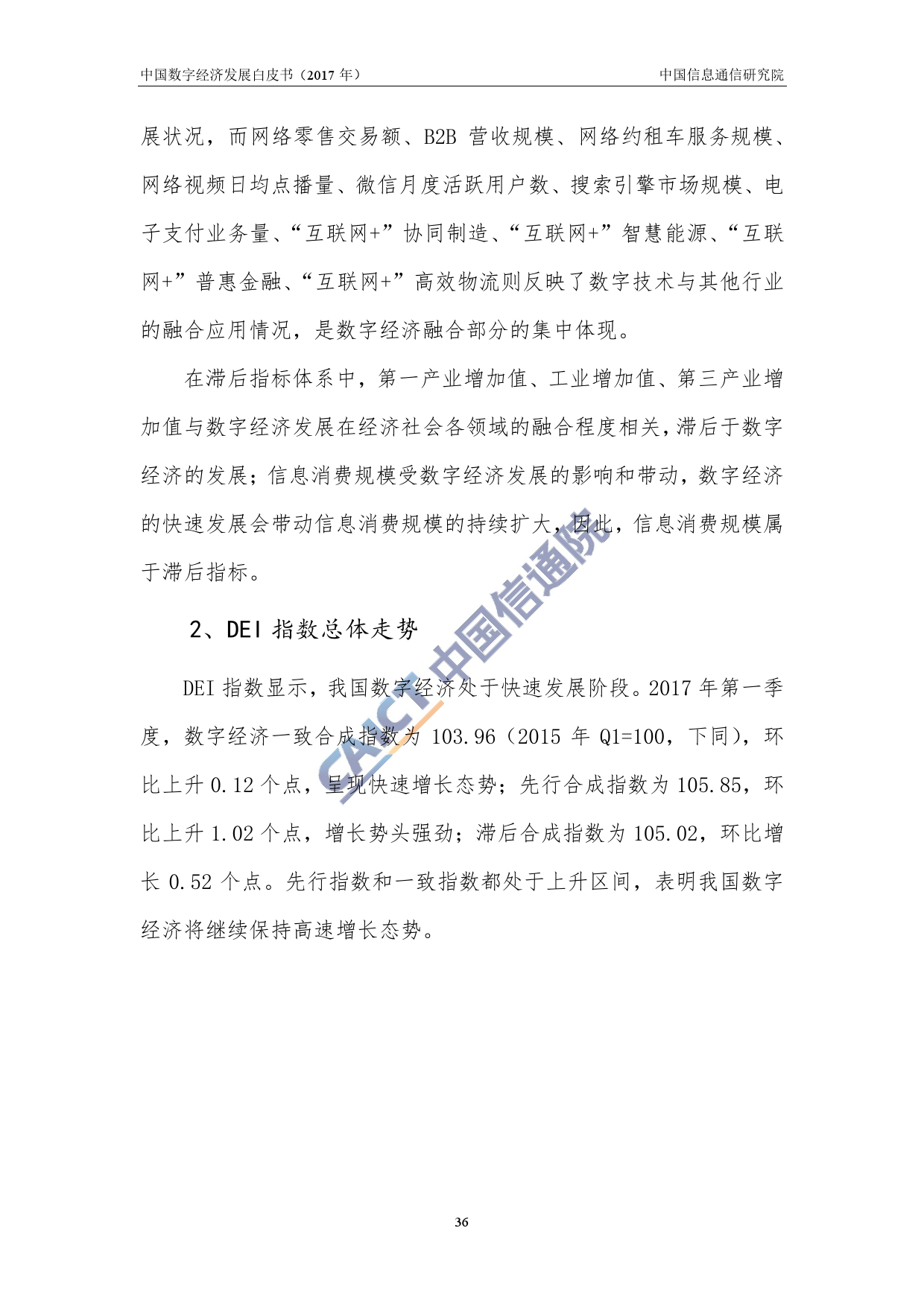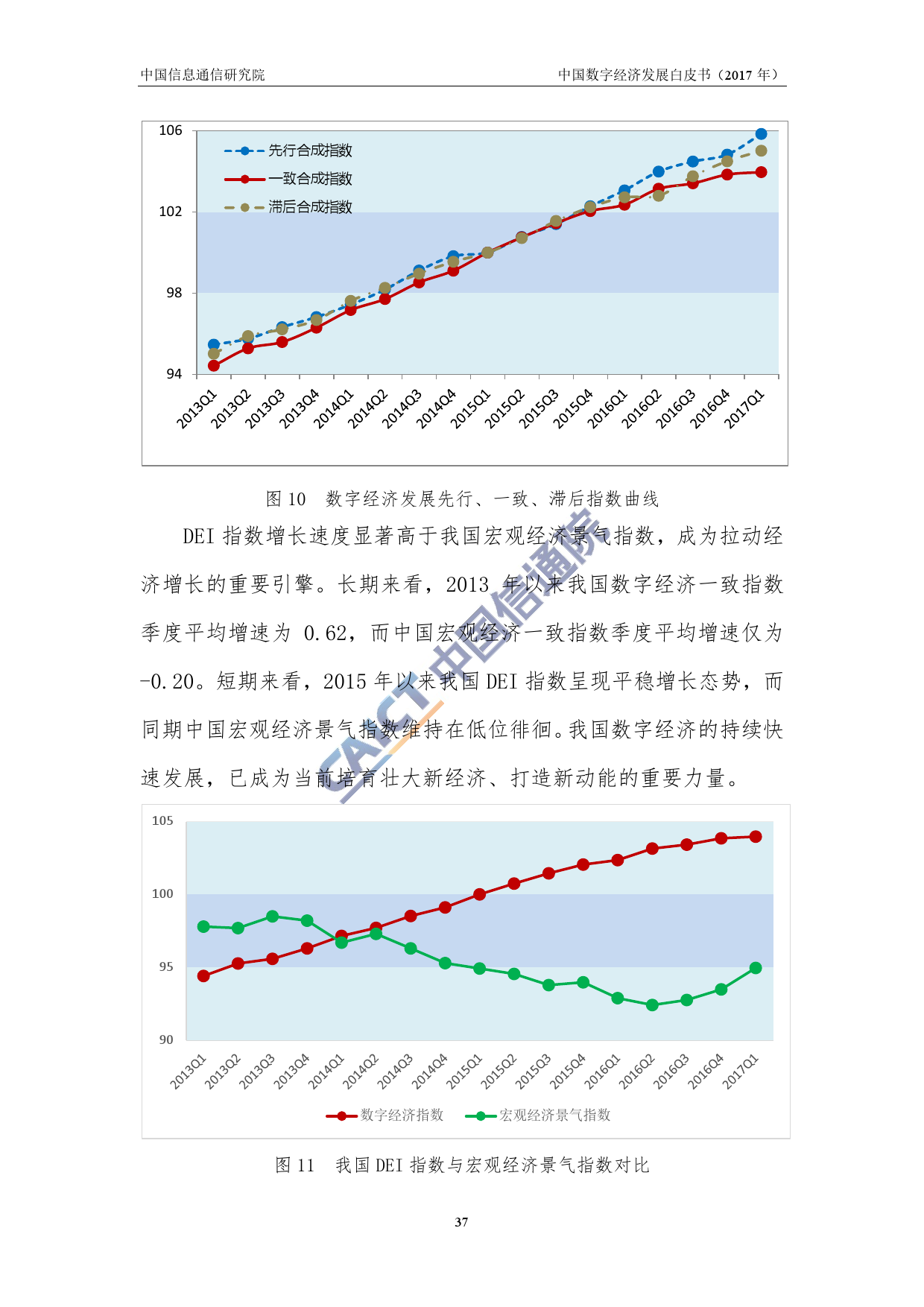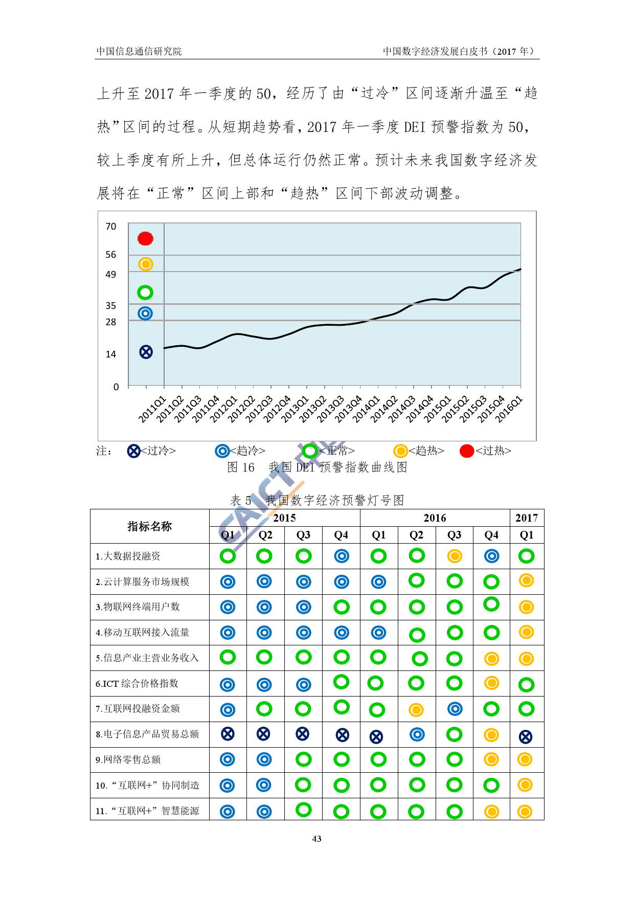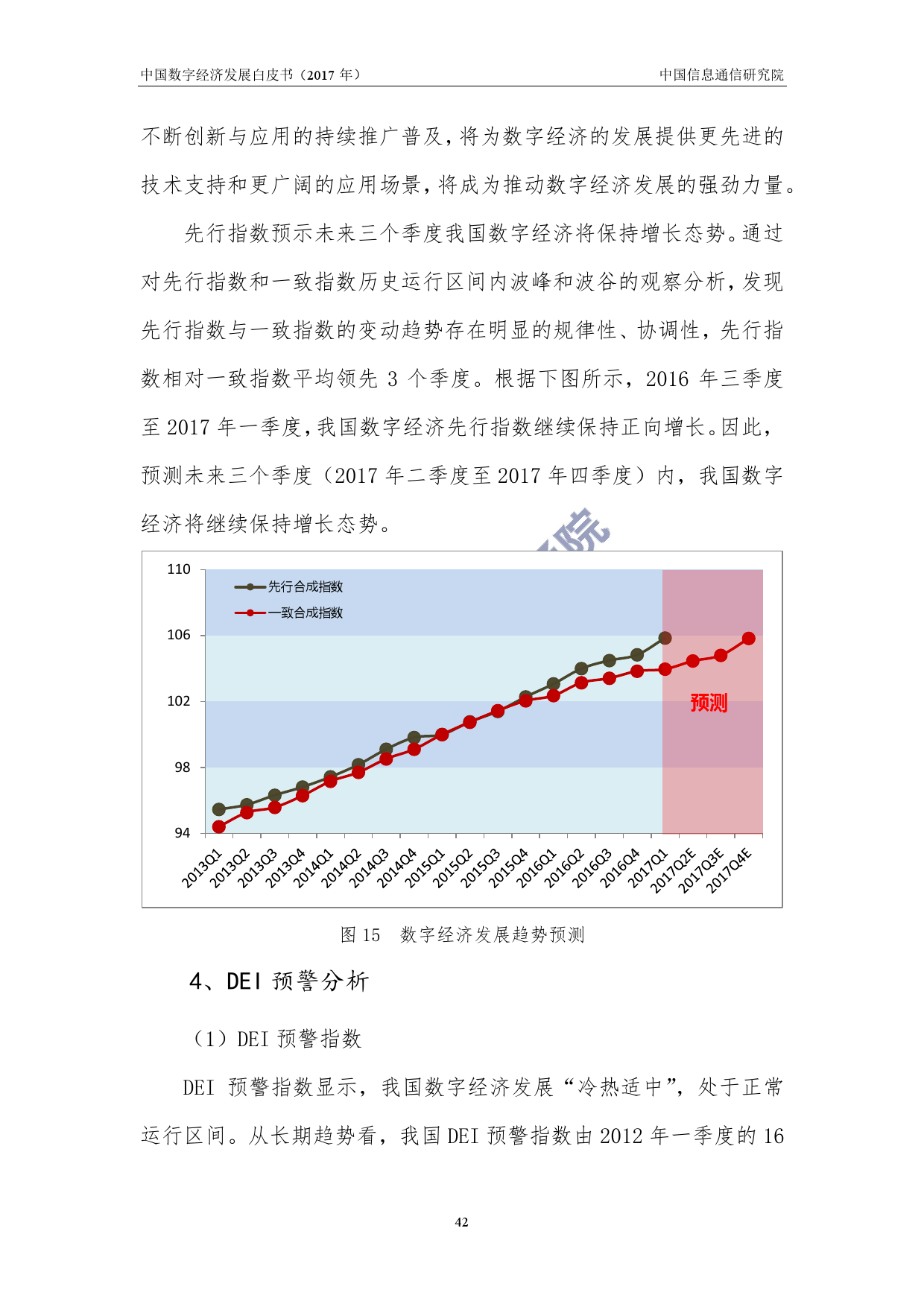 2016年,服务业中数字经济占行业比重平均值为29.6%,工业中数字经济占行业比重平均值为17.0%,农业中数字经济占行业比重平均值为6.2%。报告编制了中国数字经济指数(Digital Economy Index,简称DEI指数)。DEI指数表明,数字经济增速显著高于我国宏观经济景气指数,成为拉动经济增长的重要引擎。DEI预警指数显示,我国数字经济发展“冷热适中”,处于正常运行区间。预计未来我国数字经济发展将在“正常”区间上部和“趋热”区间下部波动调整。