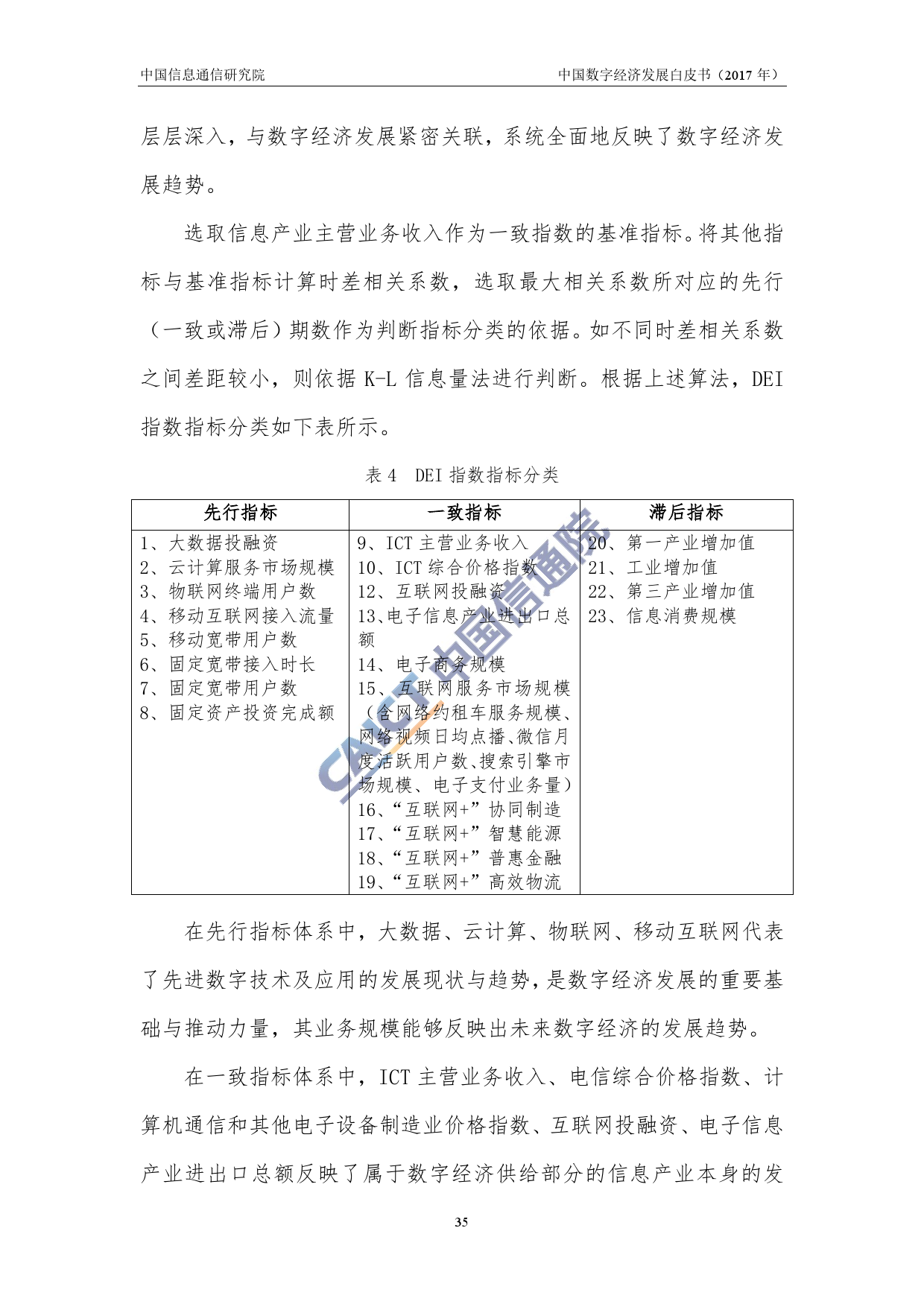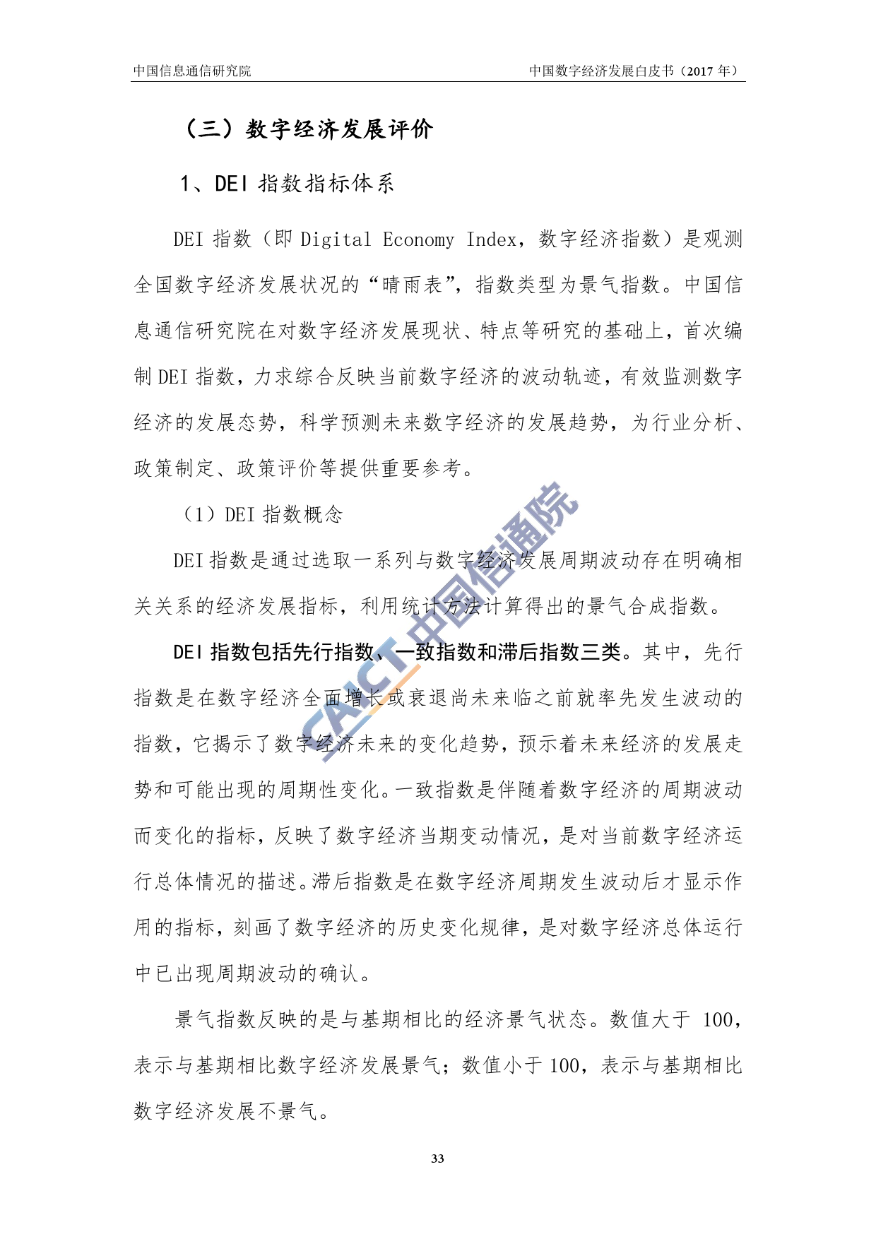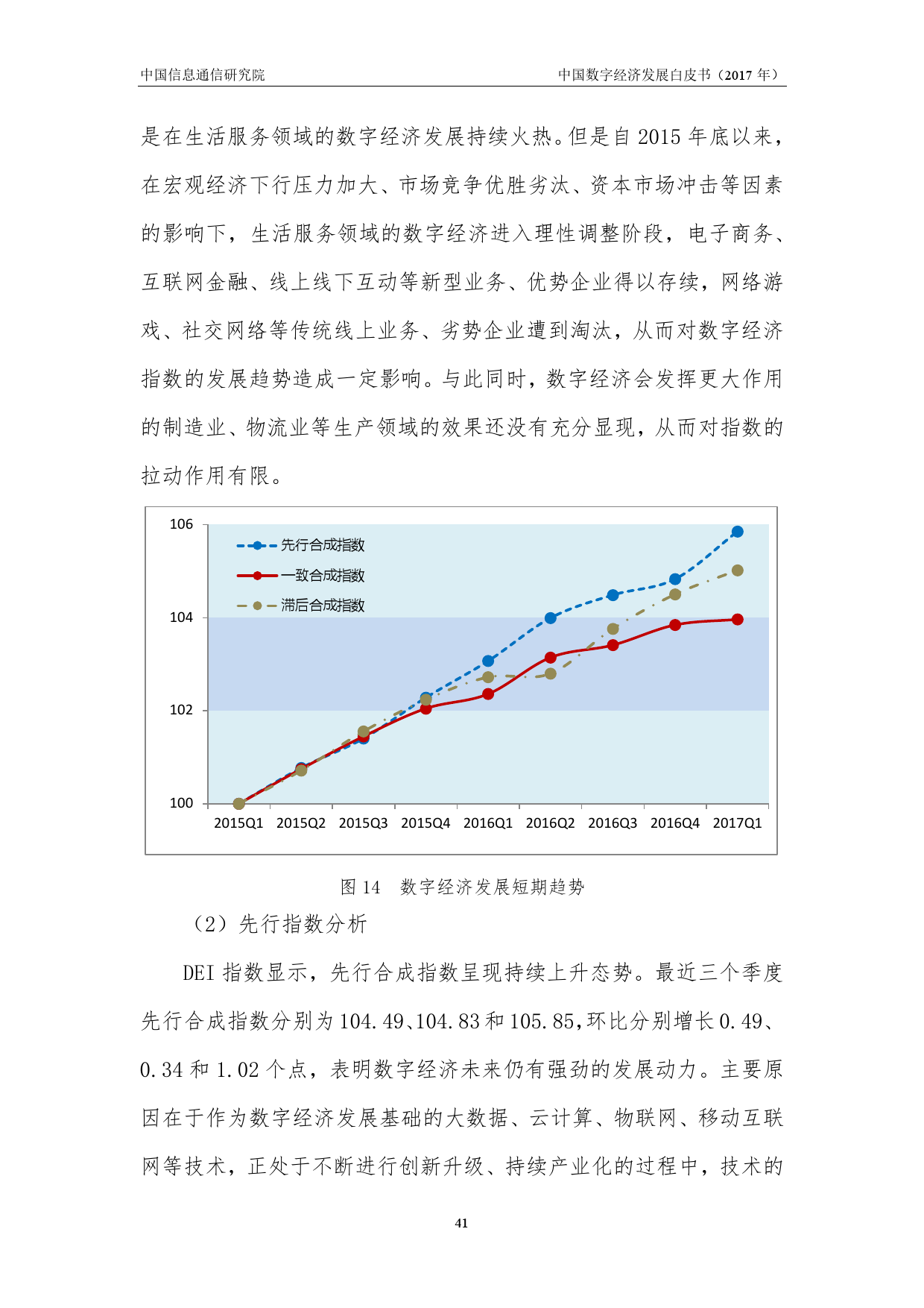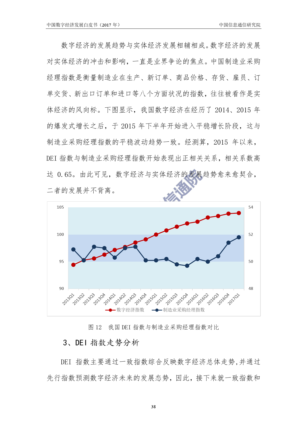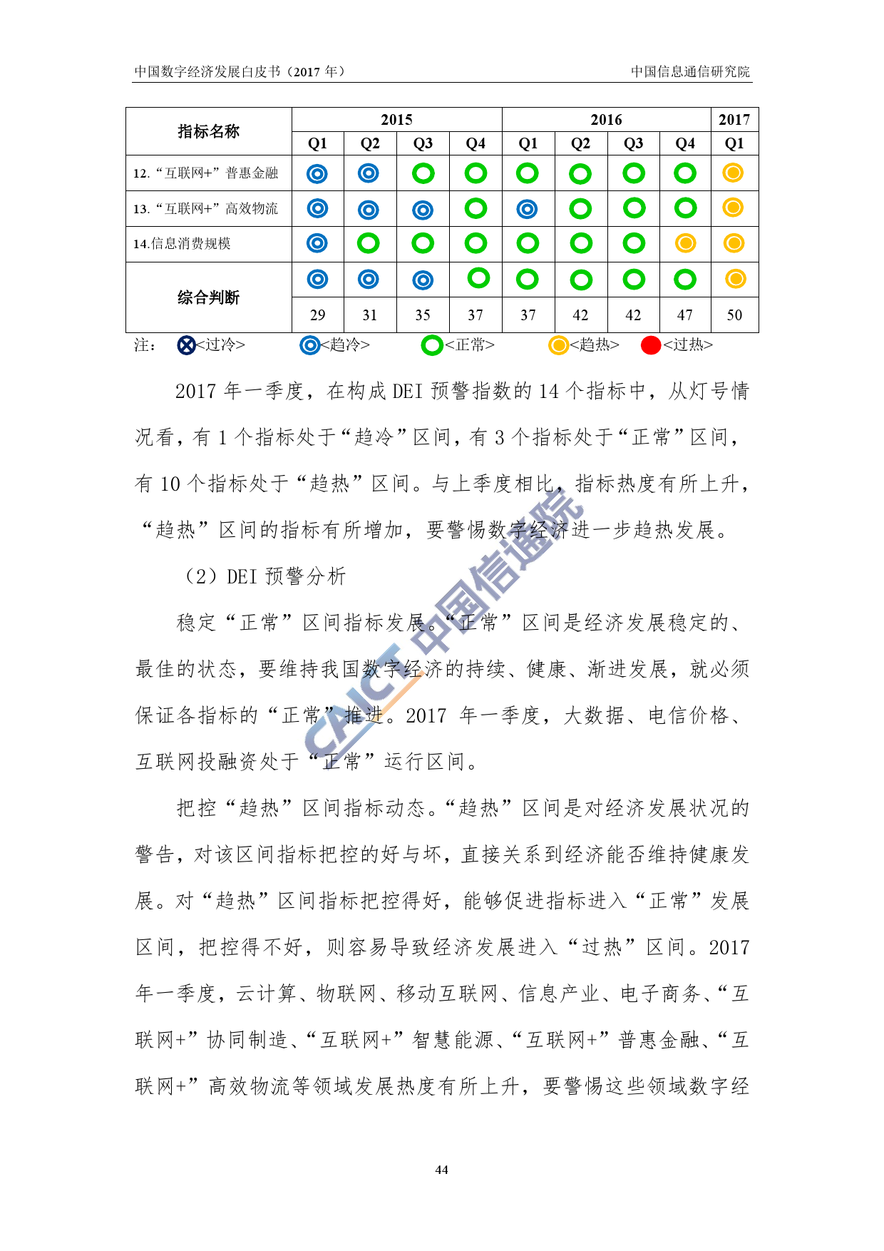 2016年,服务业中数字经济占行业比重平均值为29.6%,工业中数字经济占行业比重平均值为17.0%,农业中数字经济占行业比重平均值为6.2%。报告编制了中国数字经济指数(Digital Economy Index,简称DEI指数)。DEI指数表明,数字经济增速显著高于我国宏观经济景气指数,成为拉动经济增长的重要引擎。DEI预警指数显示,我国数字经济发展“冷热适中”,处于正常运行区间。预计未来我国数字经济发展将在“正常”区间上部和“趋热”区间下部波动调整。
