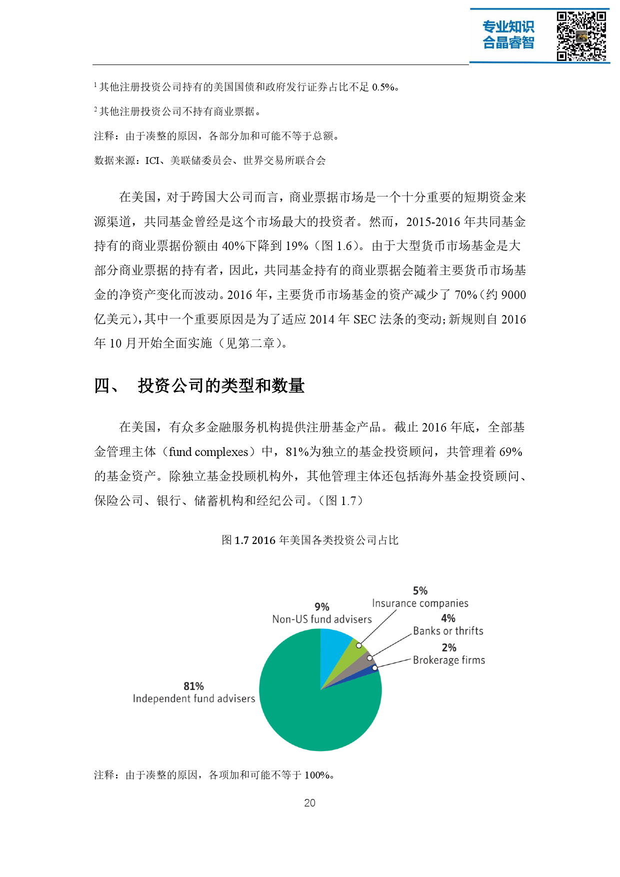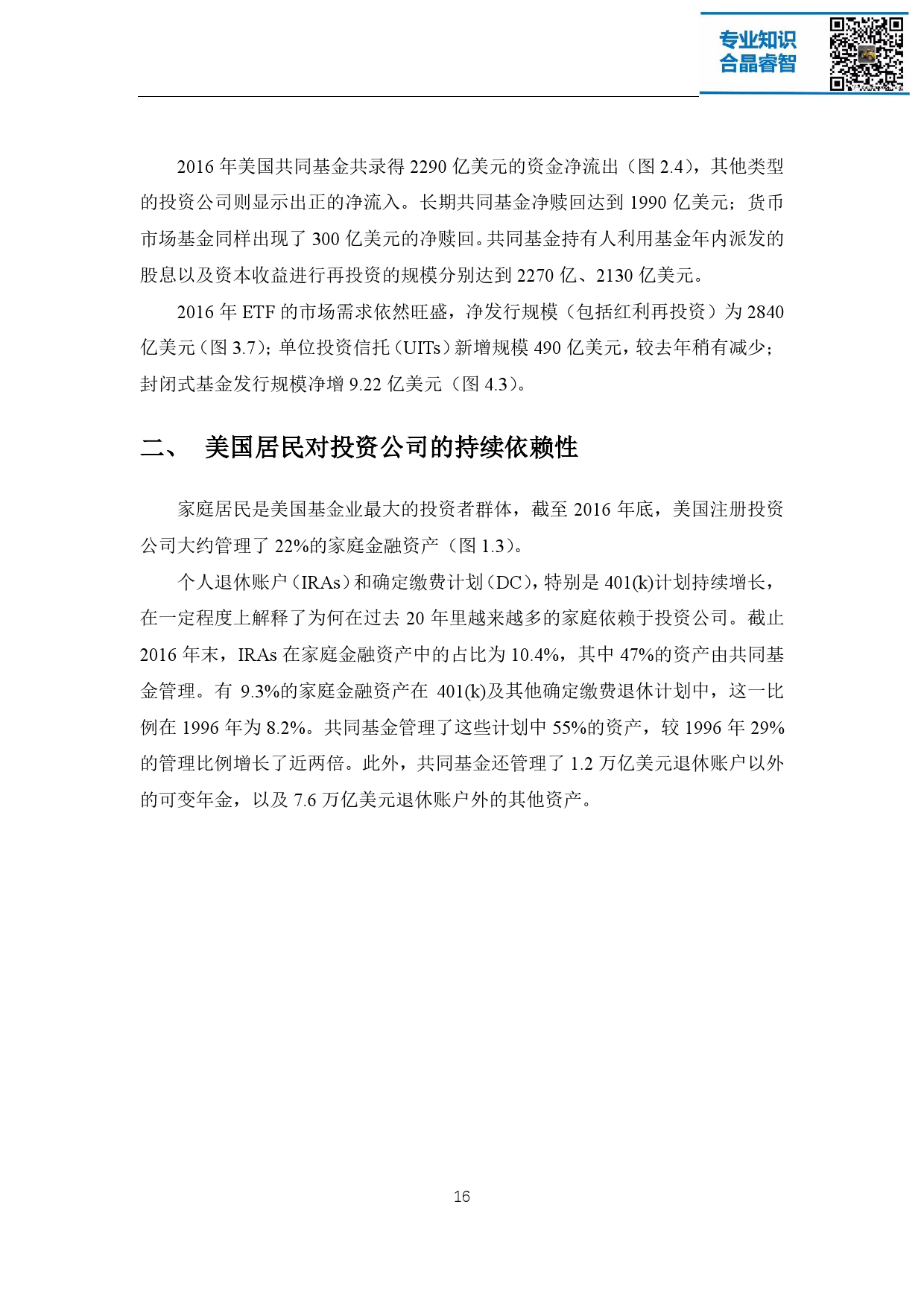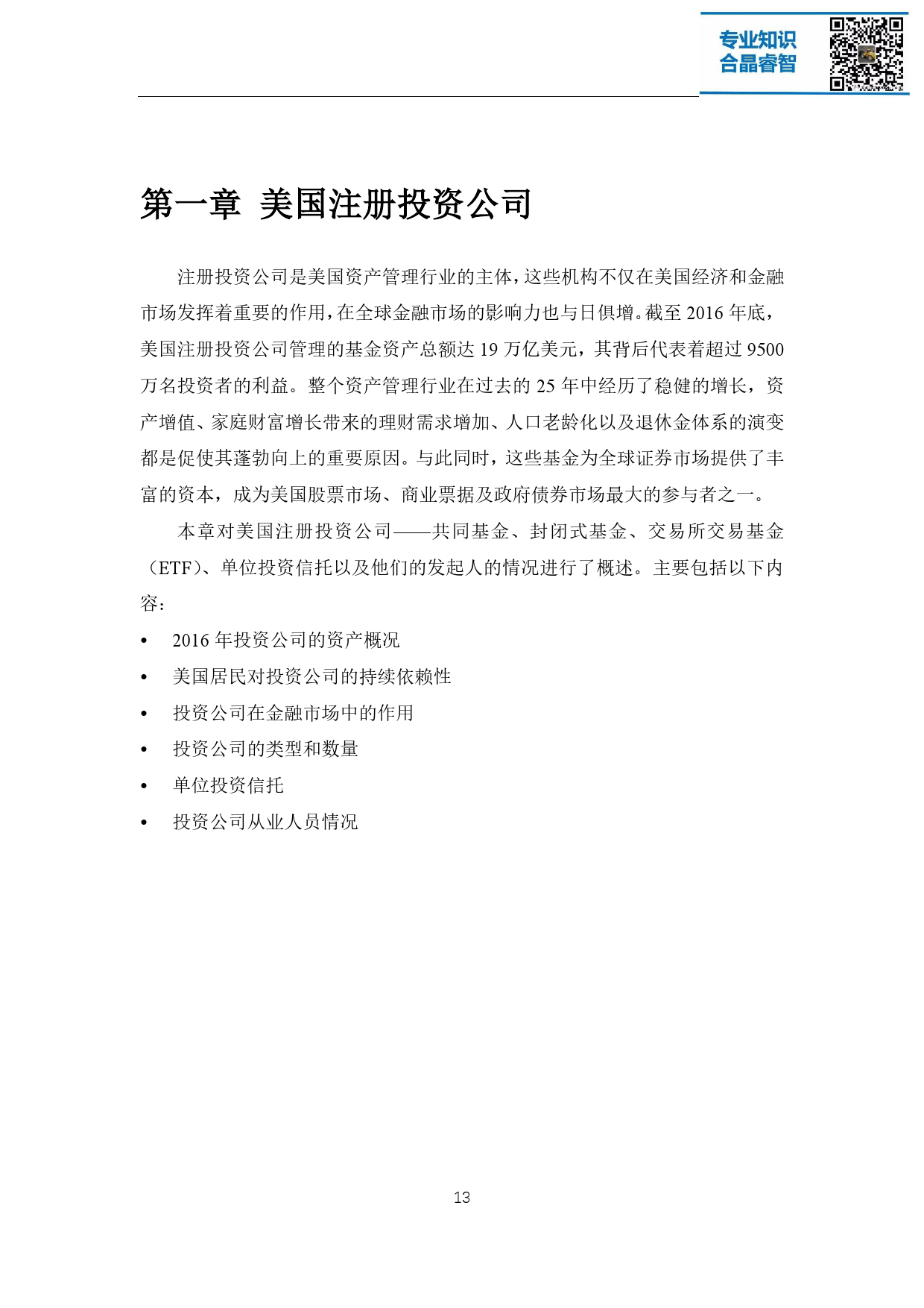 注册投资公司是美国资产管理行业的主体,这些机构不仅在美国经济和金融 市场发挥着重要的作用,在全球金融市场的影响力也与日俱增。截至 2016 年底, 美国注册投资公司管理的基金资产总额达 19 万亿美元,其背后代表着超过 9500 万名投资者的利益。整个资产管理行业在过去的 25 年中经历了稳健的增长,资 产增值、家庭财富增长带来的理财需求增加、人口老龄化以及退休金体系的演变 都是促使其蓬勃向上的重要原因。