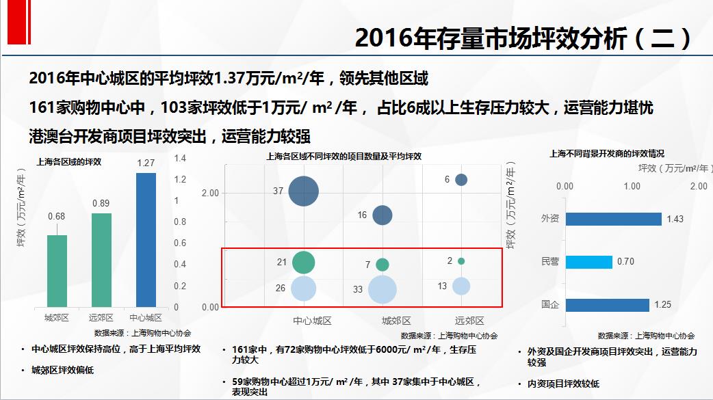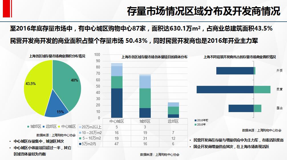 至2016年底存量市场中,中心城区购物中心有87家,面积达630.1万㎡,占商业总建筑面积43.5%;民营开发商开发的商业面积占整个存量市场的50.43%,同时民营开发商也是2016年开业主力军。