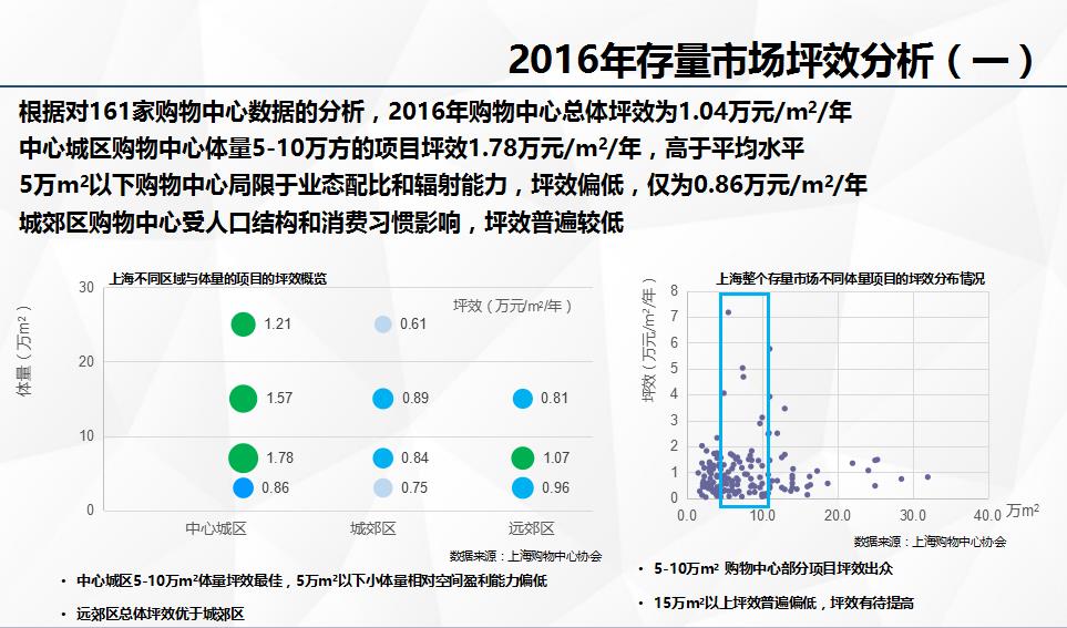 根据对161家购物中心数据的分析,2016年购物中心总体坪效为1.04万元/㎡/年;中心城区购物中心体量5-10万方的项目坪效1.78万元/㎡/年,高于平均水平;5万㎡以下购物中心局限于业态配比和辐射能力,坪效偏低,仅为0.86万元/㎡/年;城郊区购物中心受人口结构和消费习惯影响,坪效普遍较低。