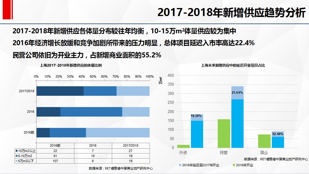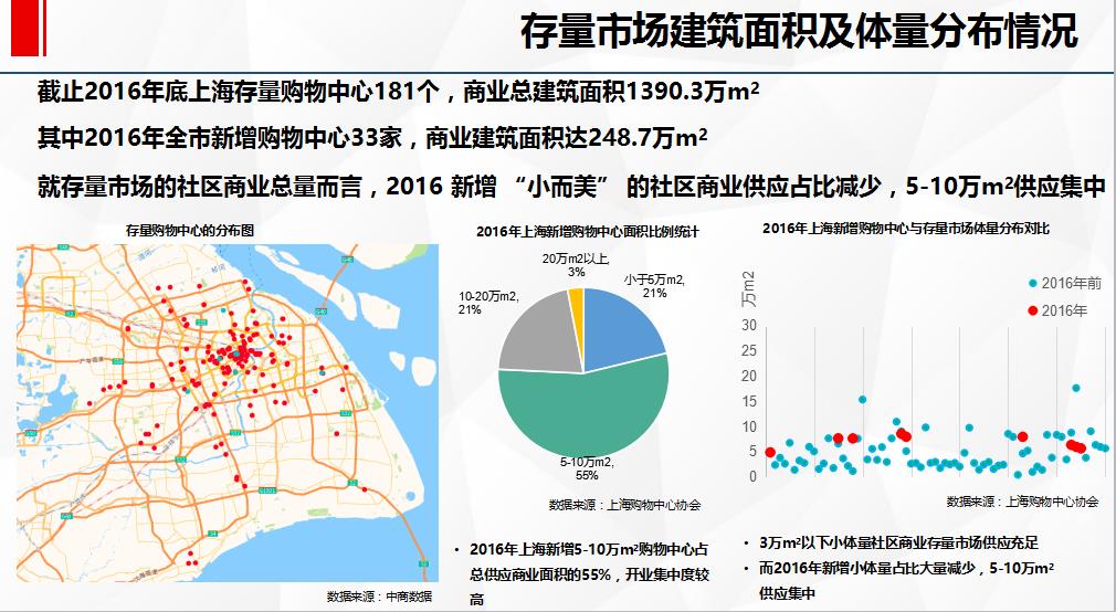 截止2016年底,上海存量购物中心181个,商业总建筑面积1390.3万㎡;其中2016年全市新增购物中心33家,商业建筑面积达248.7万㎡;就存量市场的社区商业总量而言,2016年新增的“小而美”社区商业供应占比减少,5-10万㎡供应集中。