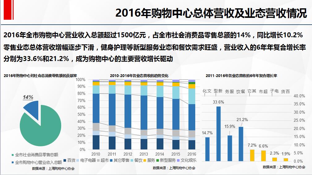 2016年全市购物中心营业收入总额超过1500亿元,占全市社会消费品零售总额的14%,同比增长10.2%,零售业态总体营收增幅逐步下滑,健身护理等新型服务业态和餐饮需求旺盛,营业收入的6年年复合增长率分别为33.6%和21.2%,成为购物中心的主要营收增长驱动。