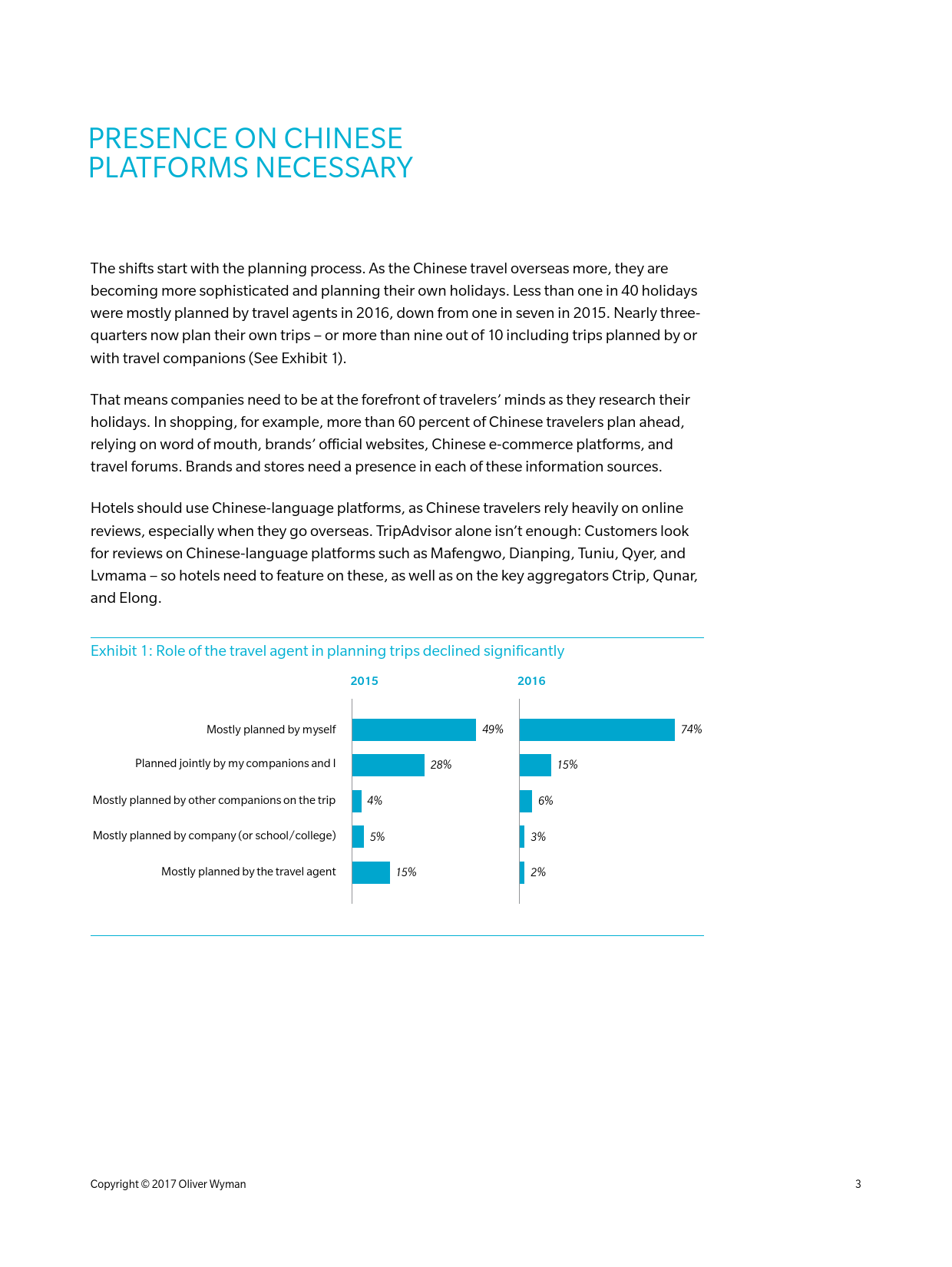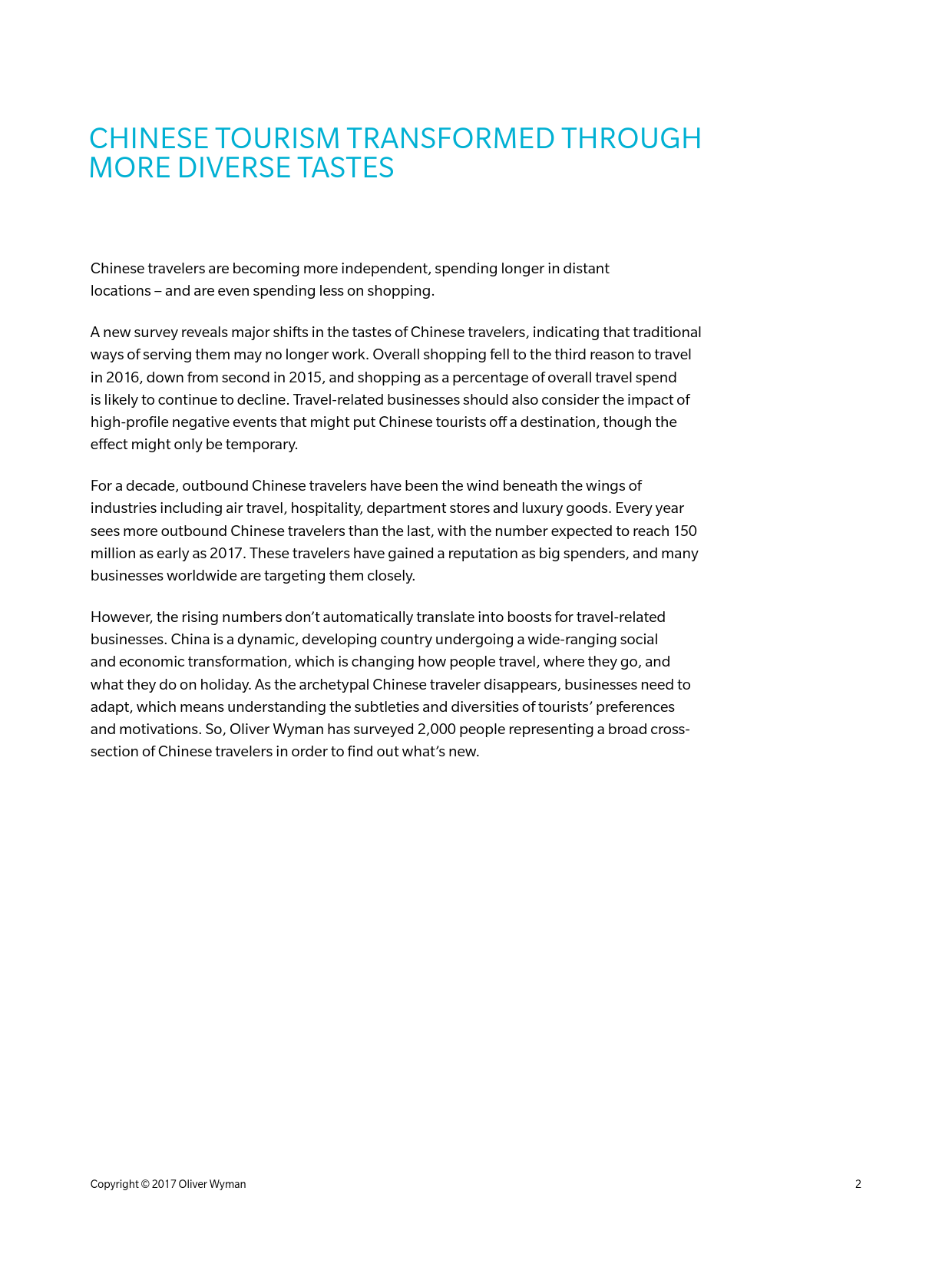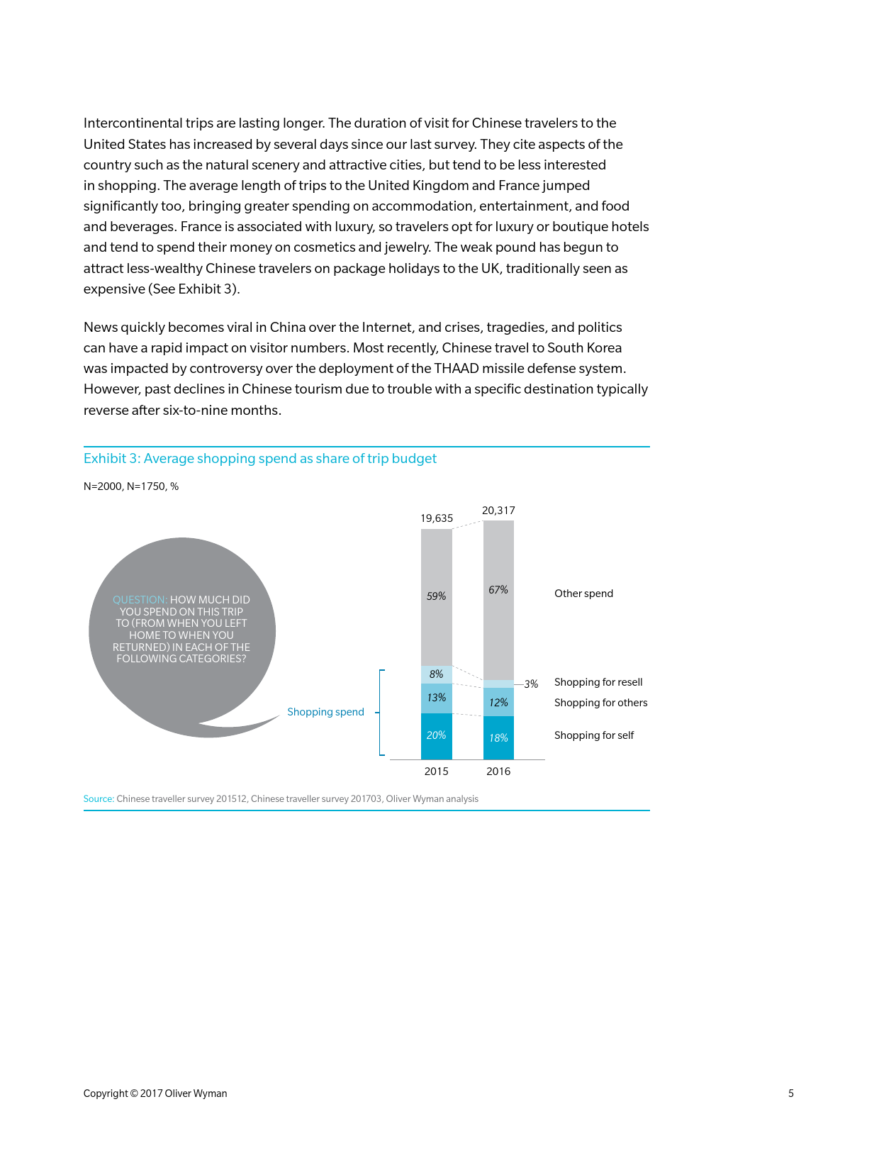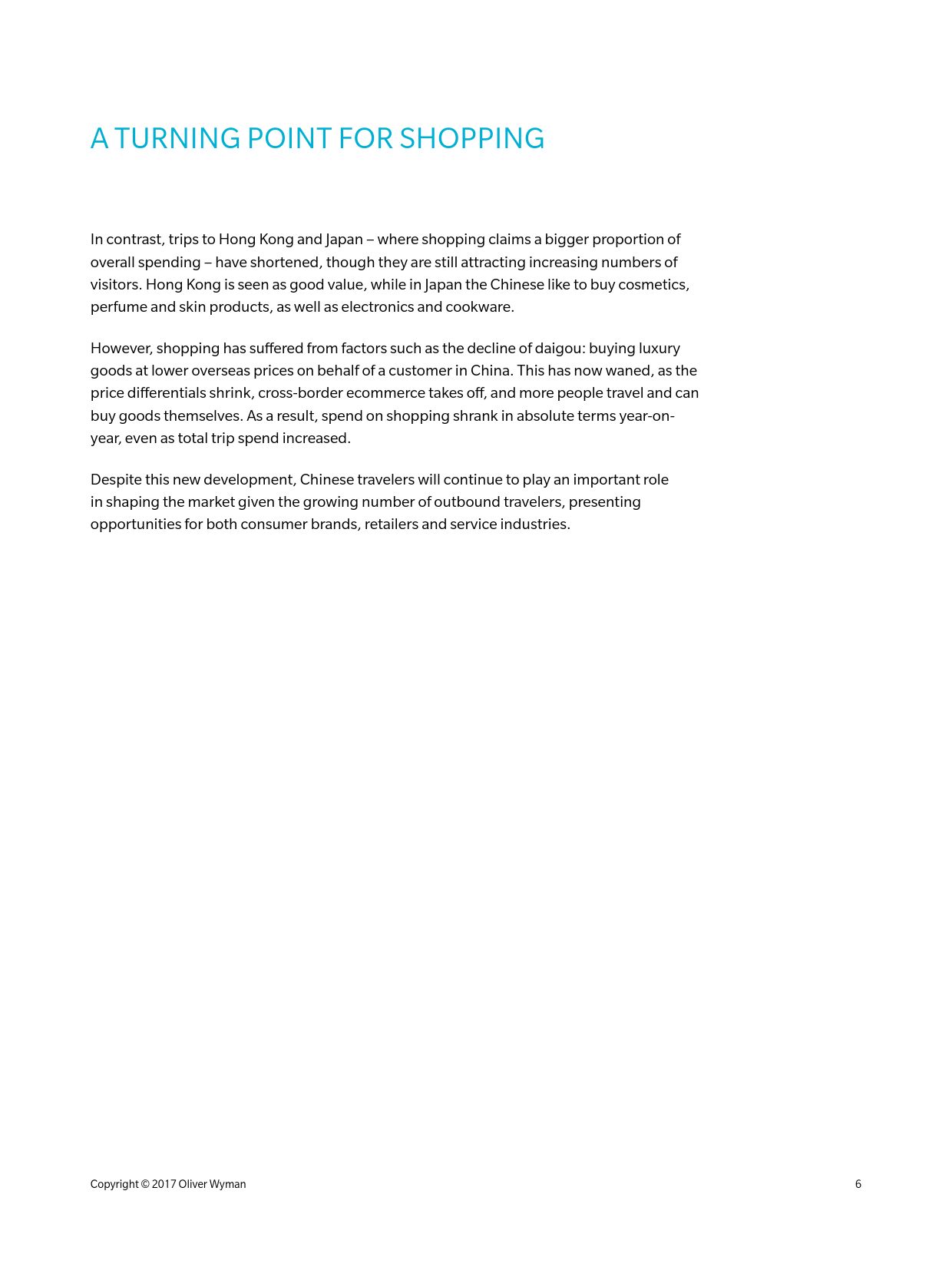 根据咨询公司 Oliver Wyman 的最新调查 “Prepare for Turbulence: The Chinese Traveler of Today and Tomorrow” (湍流预警:今天和明天的中国游客)显示,去年中国游客人数和假期开支持续上升,但在海外旅游的购物消费同比下降了 17%。预计今年中国旅客将有 1.5亿人次。