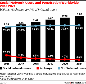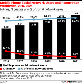 eMarketer更新了社交媒体预测,今年,全球有24.6亿人每个月访问社交网络,占全球人口的1/3,占网民的71.0%,年增幅8.2%。智能手机普及和移动互联网覆盖范围越来越广推动这一增长。