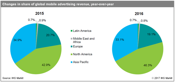 市场研究机构IHS Markit(纳斯达克股票代码:INFO)最新研究指出,受“移动优先”的消费环境和日益改善的营销手段驱动,相较于2015年的520亿美元,2016年全球移动广告业务增长60.5%,达830亿美元(约合630亿欧元)。