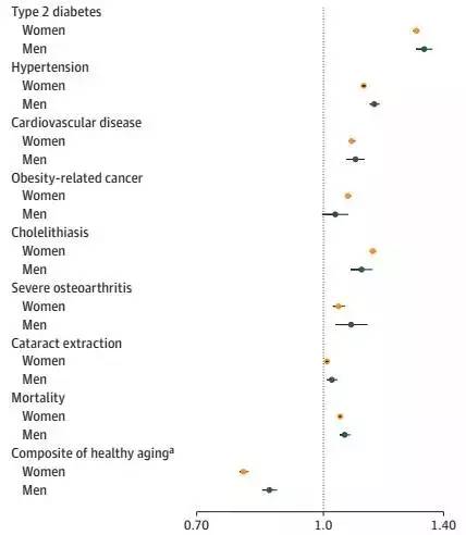 上图为青年至中年体重增加5 kg与健康结果的关系。黄点代表女性,蓝点代表男性,点子在竖的虚线右侧表示可能性升高。可以看出,除了最下面的Composite of healthy aging这一项,上面的各种疾病(包括2型糖尿病、高血压、心血管疾病、肥胖相关肿瘤、胆石病、严重骨关节炎、白内障摘除)和死亡风险都随体重增加而升高。最下面这项是老年健康状况复合评价,包括没有患上11种慢性疾病,也没有严重的认知和身体机能损害,这一项上的点子在竖线左侧,说明随着中年体重增加,则老年健康状况保持良好的可能性较低。