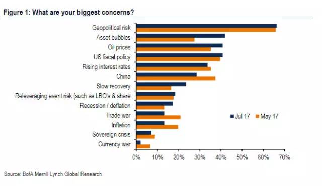 #图3#信贷投资者的担忧排在第一位的是地缘风险,排在第二位的是资产泡沫,排在第三位的是原油价格。排在最后一位的是货币战争。(蓝色为7月17日,黄色为5月17日)
