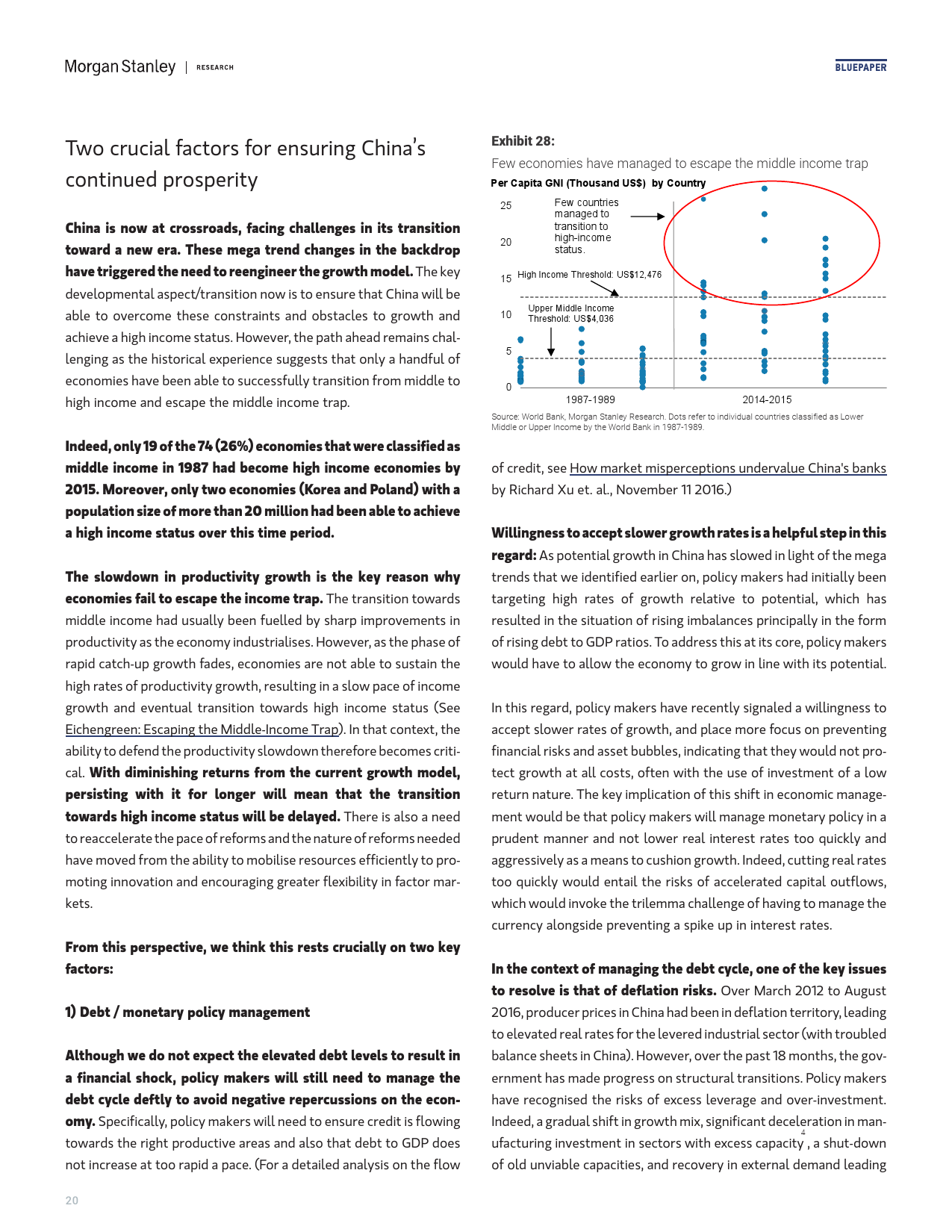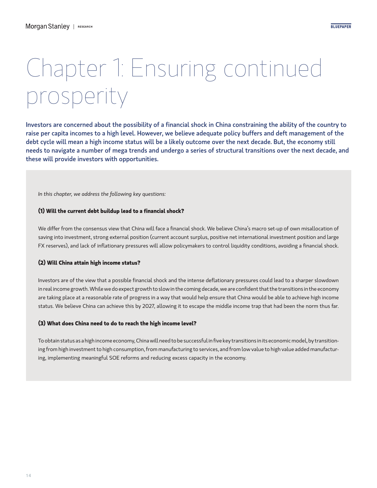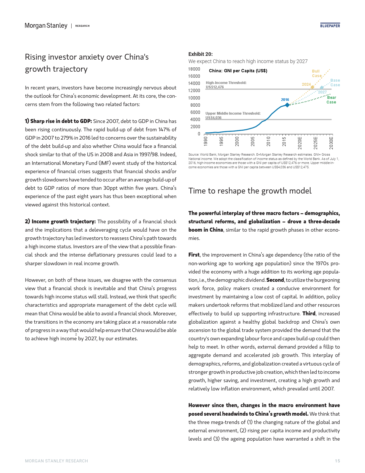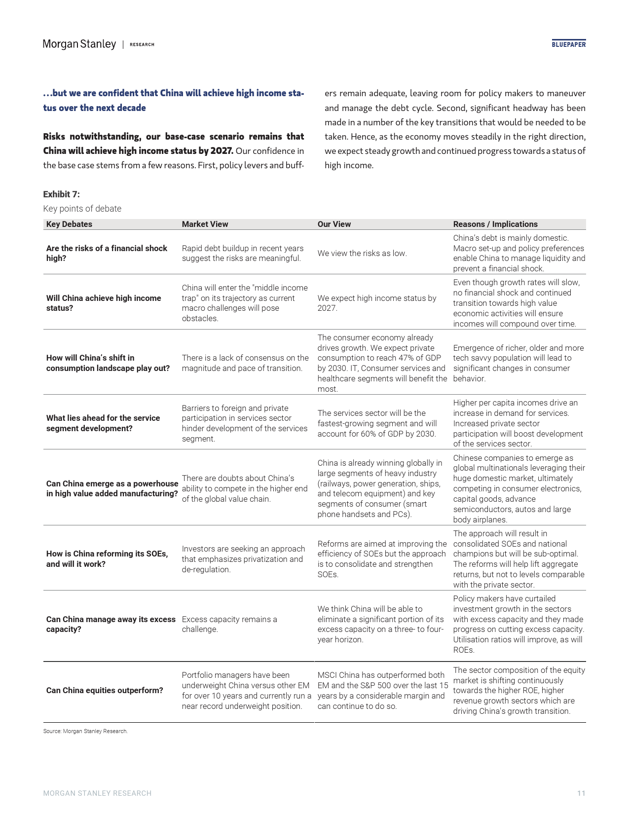 摩根士丹利经济学家认为中国有能力应对这些挑战。由于投资者对中国经济发展仍存有顾虑,资产配置中国股票所占比例已下滑至十年新低。然而,摩根士丹利研究团队相信中国有能力规避金融冲击风险,实现经济向高附加值的制造业和服务业转型,从而晋身高收入国家之列。