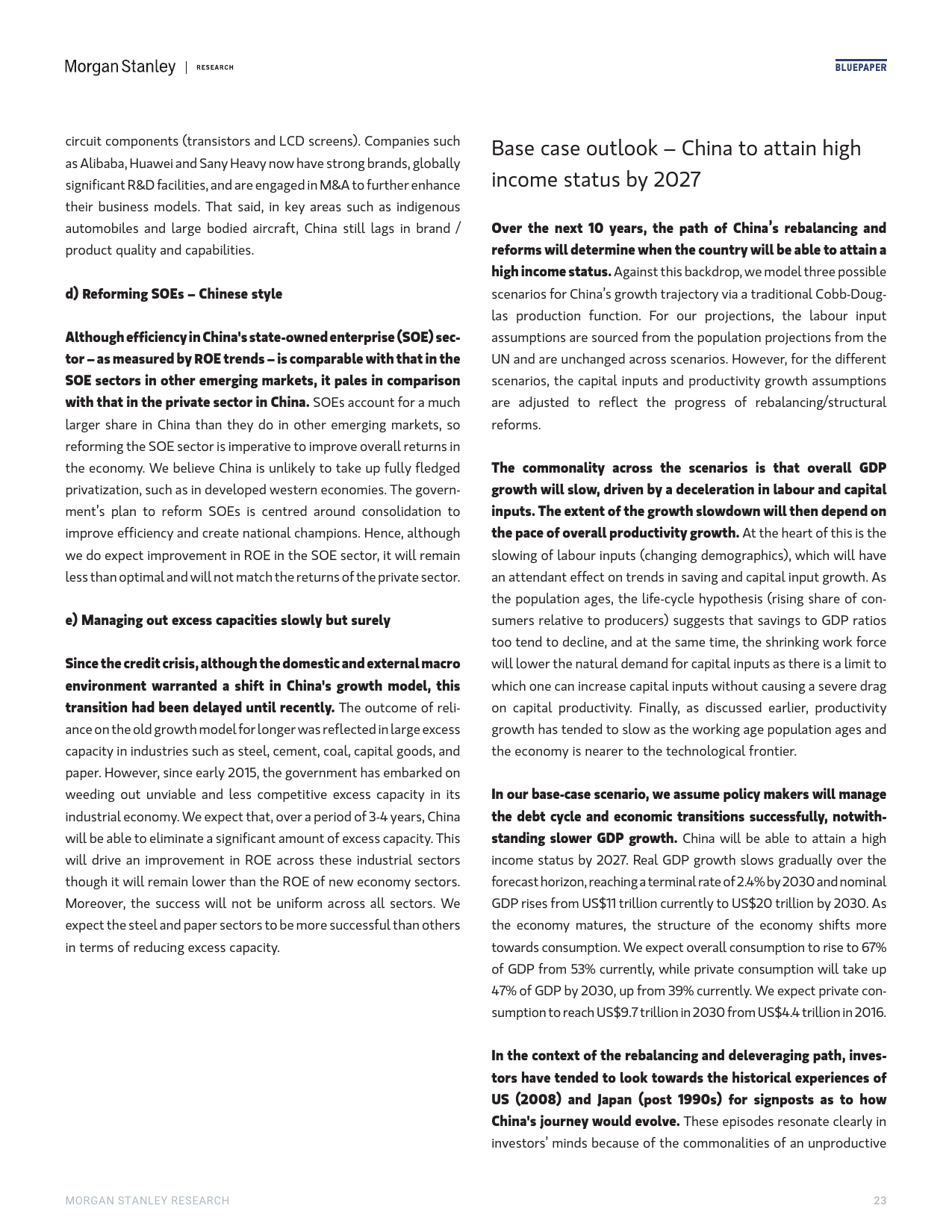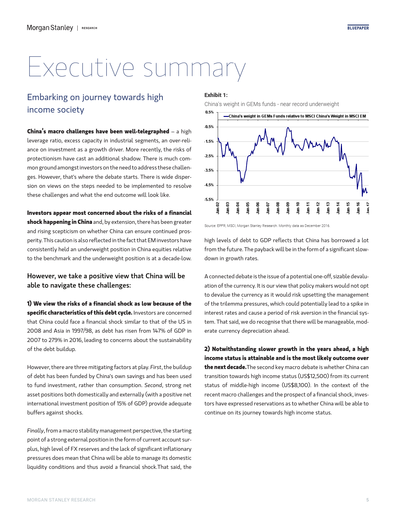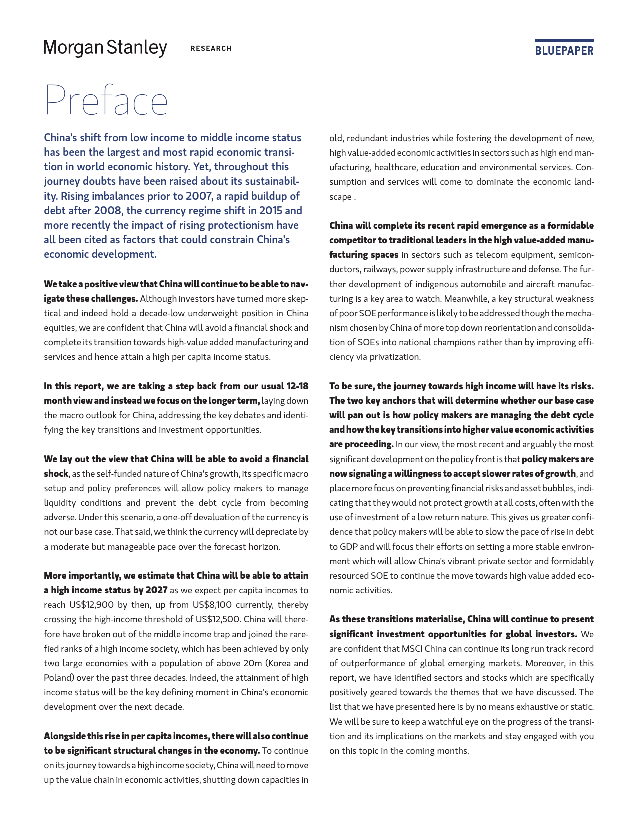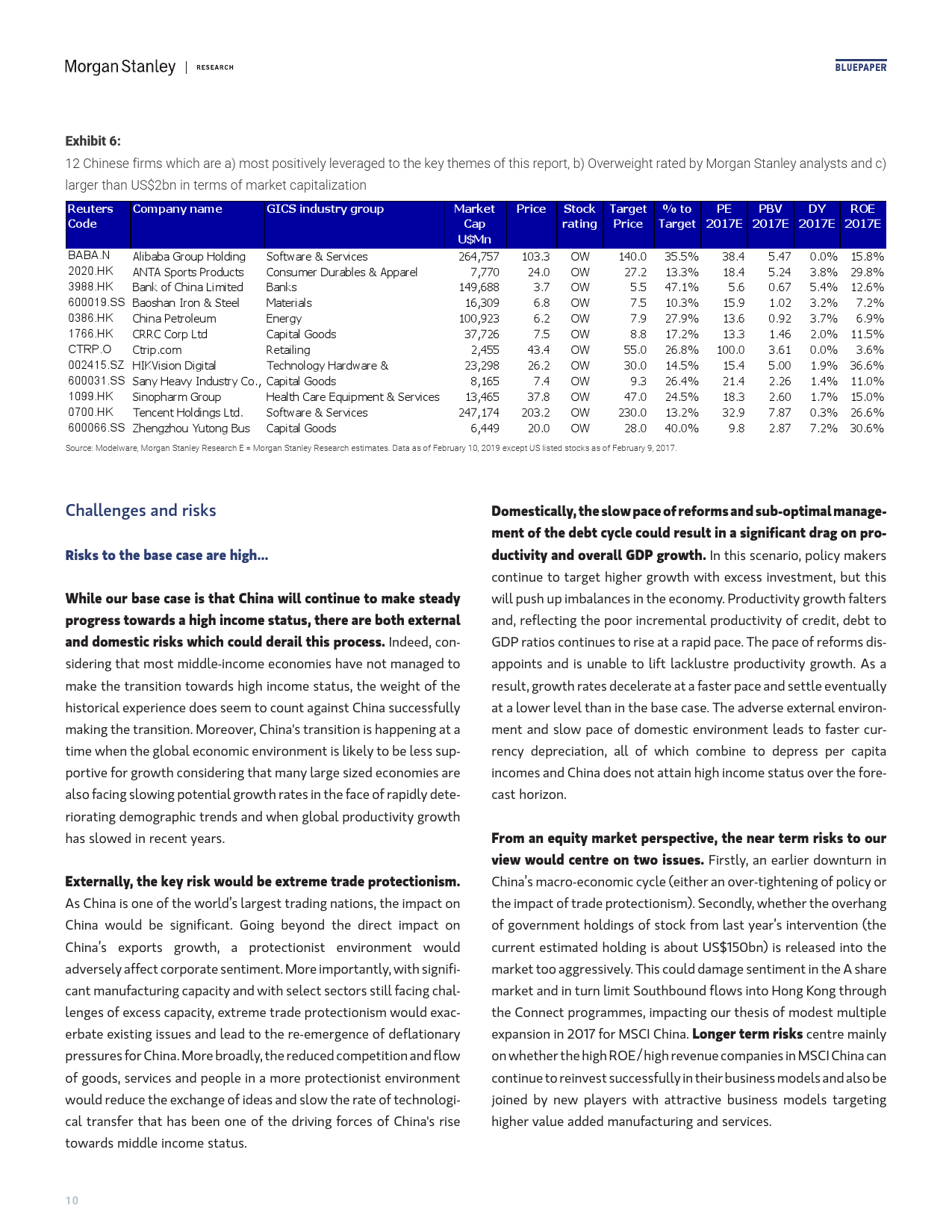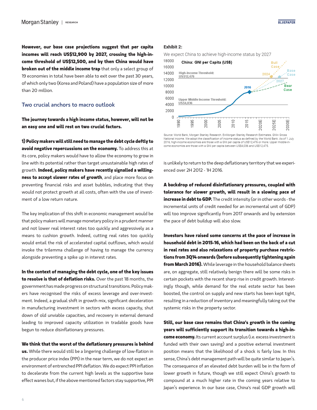 摩根士丹利经济学家认为中国有能力应对这些挑战。由于投资者对中国经济发展仍存有顾虑,资产配置中国股票所占比例已下滑至十年新低。然而,摩根士丹利研究团队相信中国有能力规避金融冲击风险,实现经济向高附加值的制造业和服务业转型,从而晋身高收入国家之列。