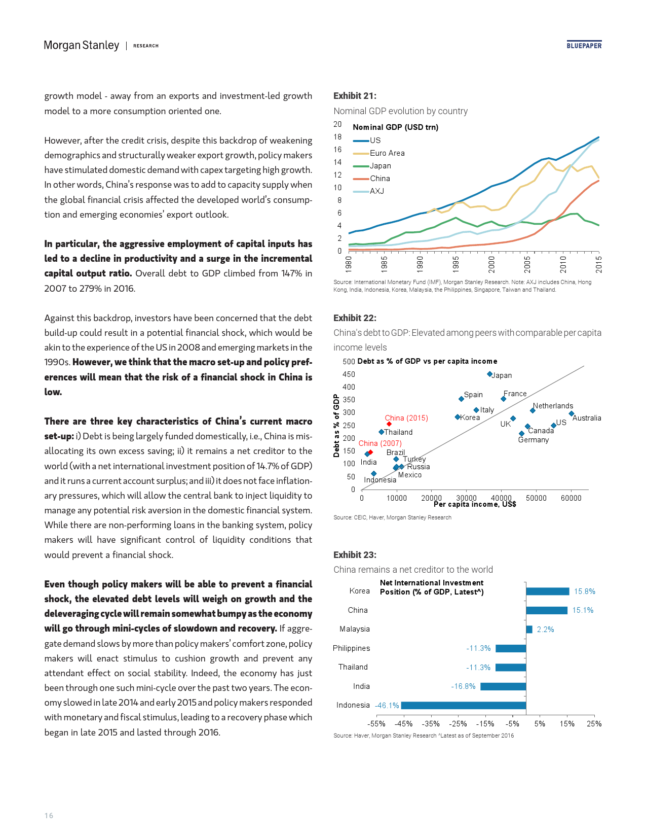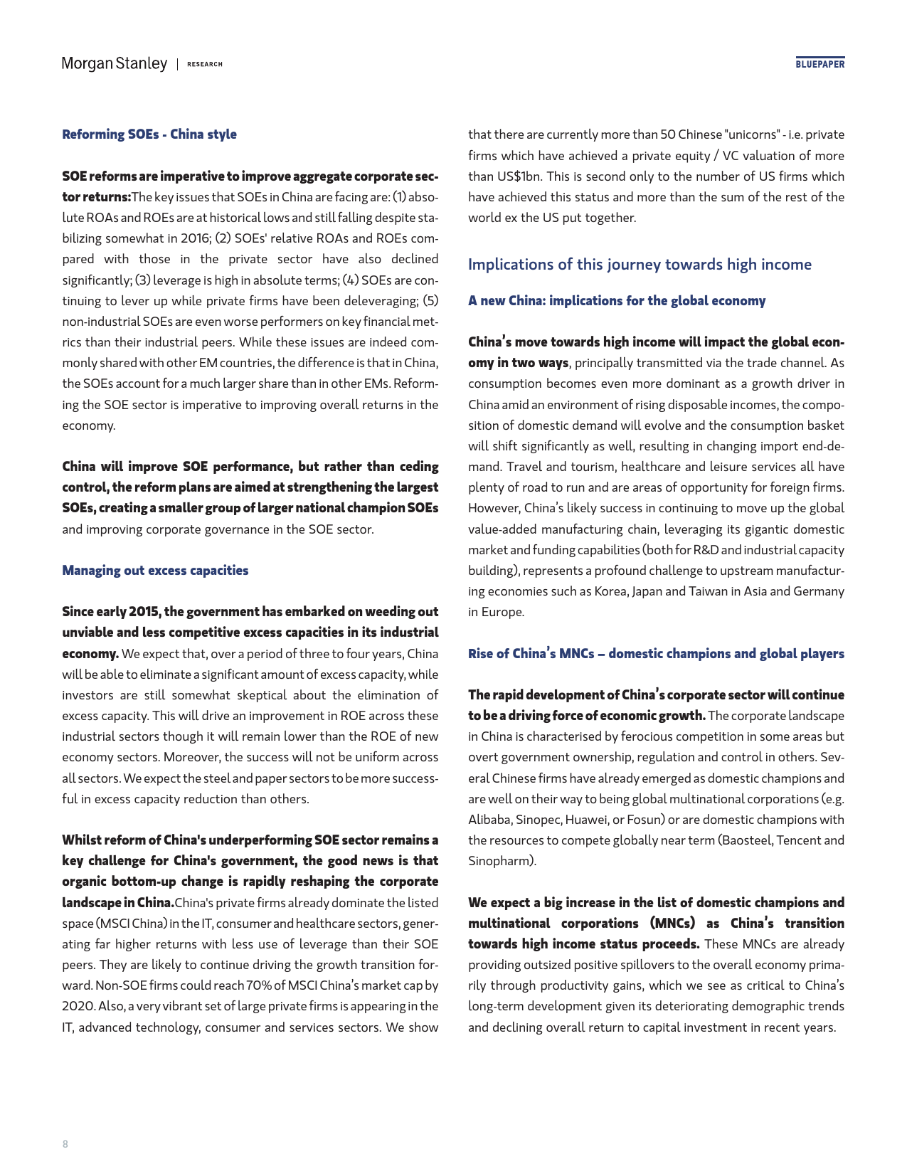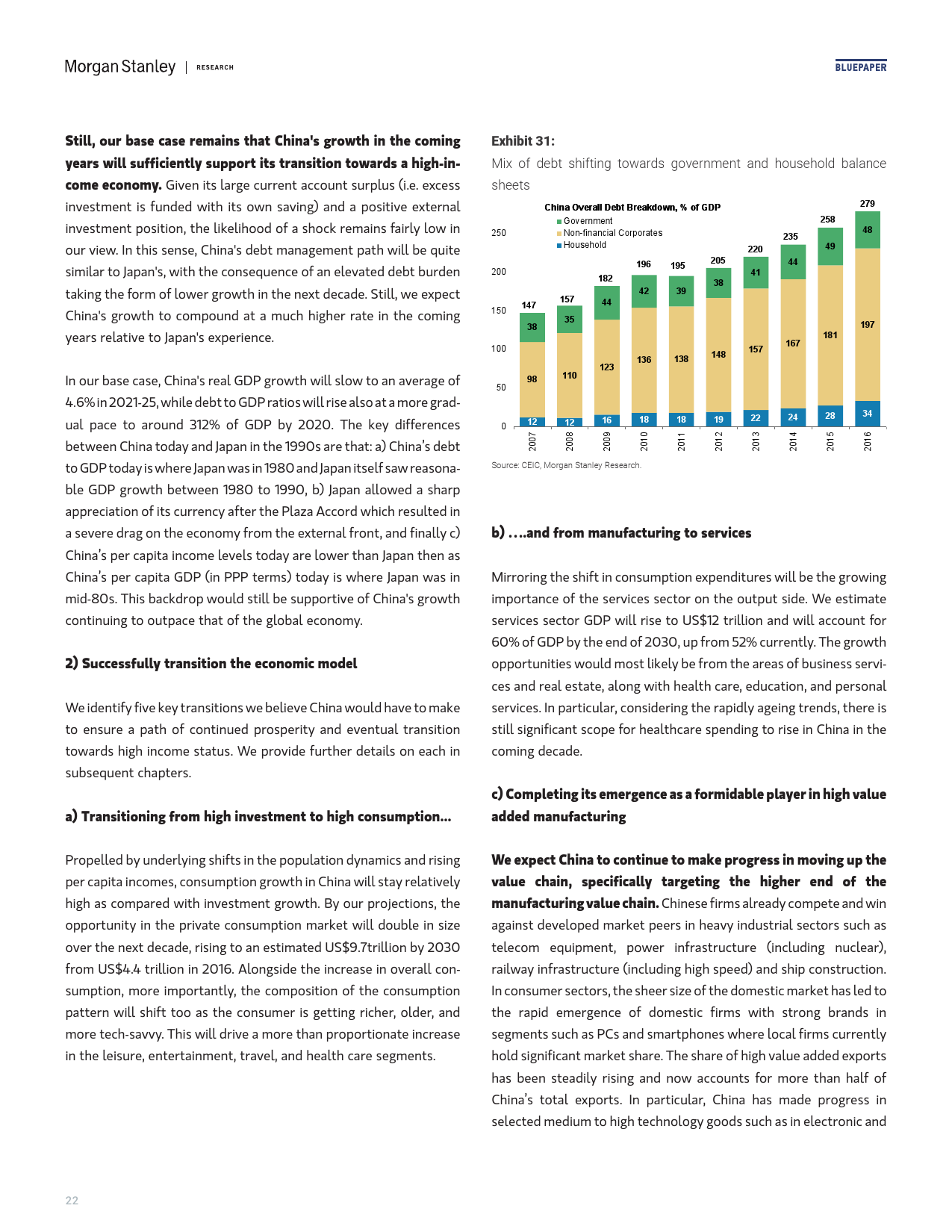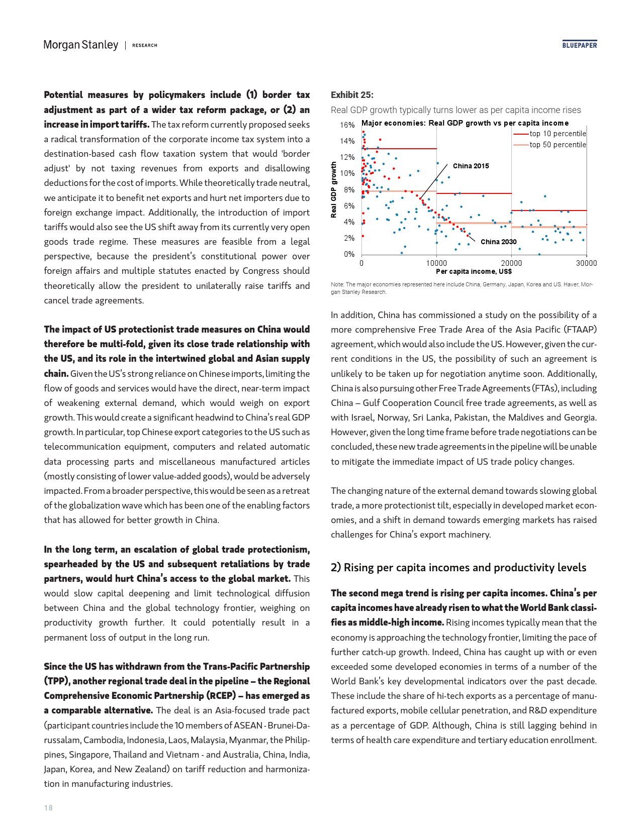 摩根士丹利经济学家认为中国有能力应对这些挑战。由于投资者对中国经济发展仍存有顾虑,资产配置中国股票所占比例已下滑至十年新低。然而,摩根士丹利研究团队相信中国有能力规避金融冲击风险,实现经济向高附加值的制造业和服务业转型,从而晋身高收入国家之列。