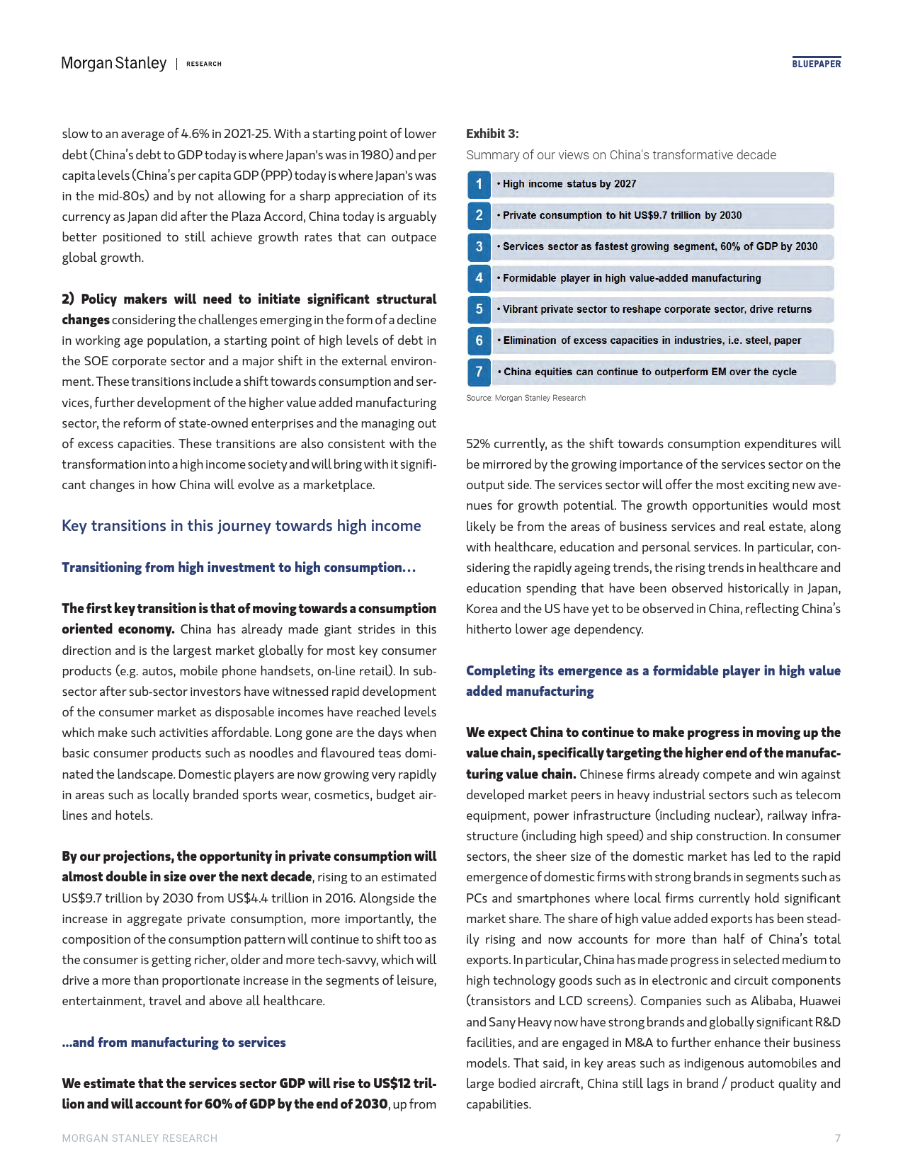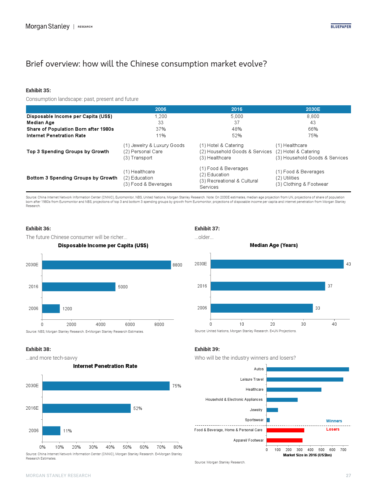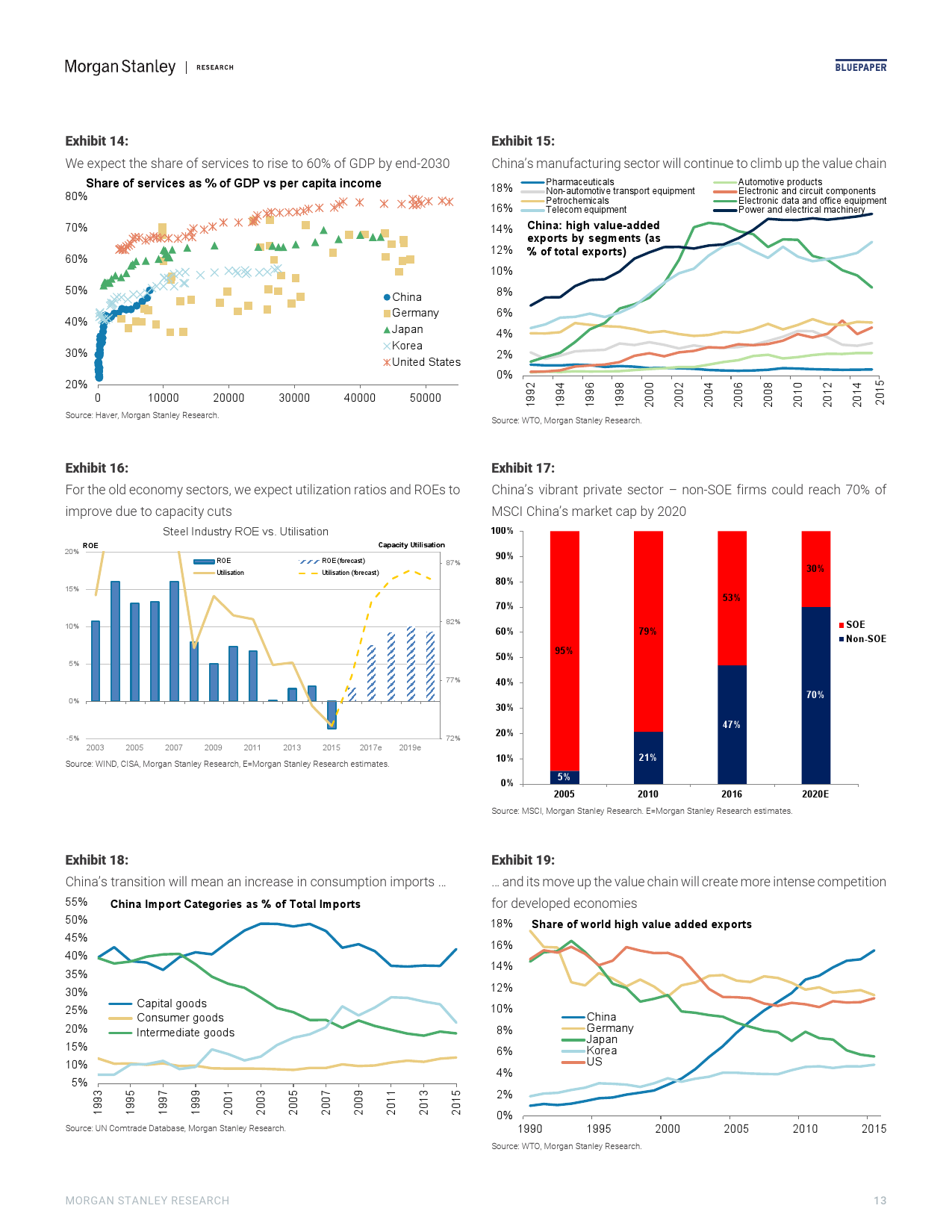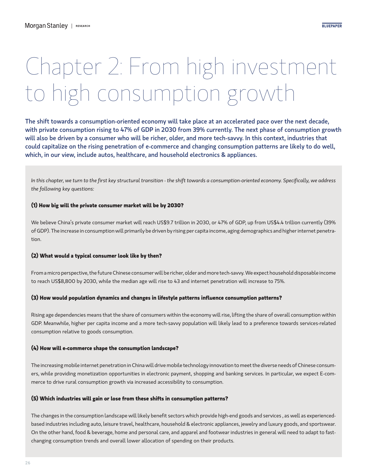 随着中国人均收入的增长及经济重大结构性改革的持续进行,投资者需要认识到这些经济变化的重要性和它们带来的机遇和挑战。中国经济蓝皮书讨论到,为了让中国步入高收入国家行列,推动经济活动的产业链升级,淘汰过剩的老旧产能行业,同时培育高端制造业、医疗保健、教育和环境服务等行业中的高附加值新经济活动。摩根士丹利经济学家认为消费和服务将成为经济版图中的两大主导。