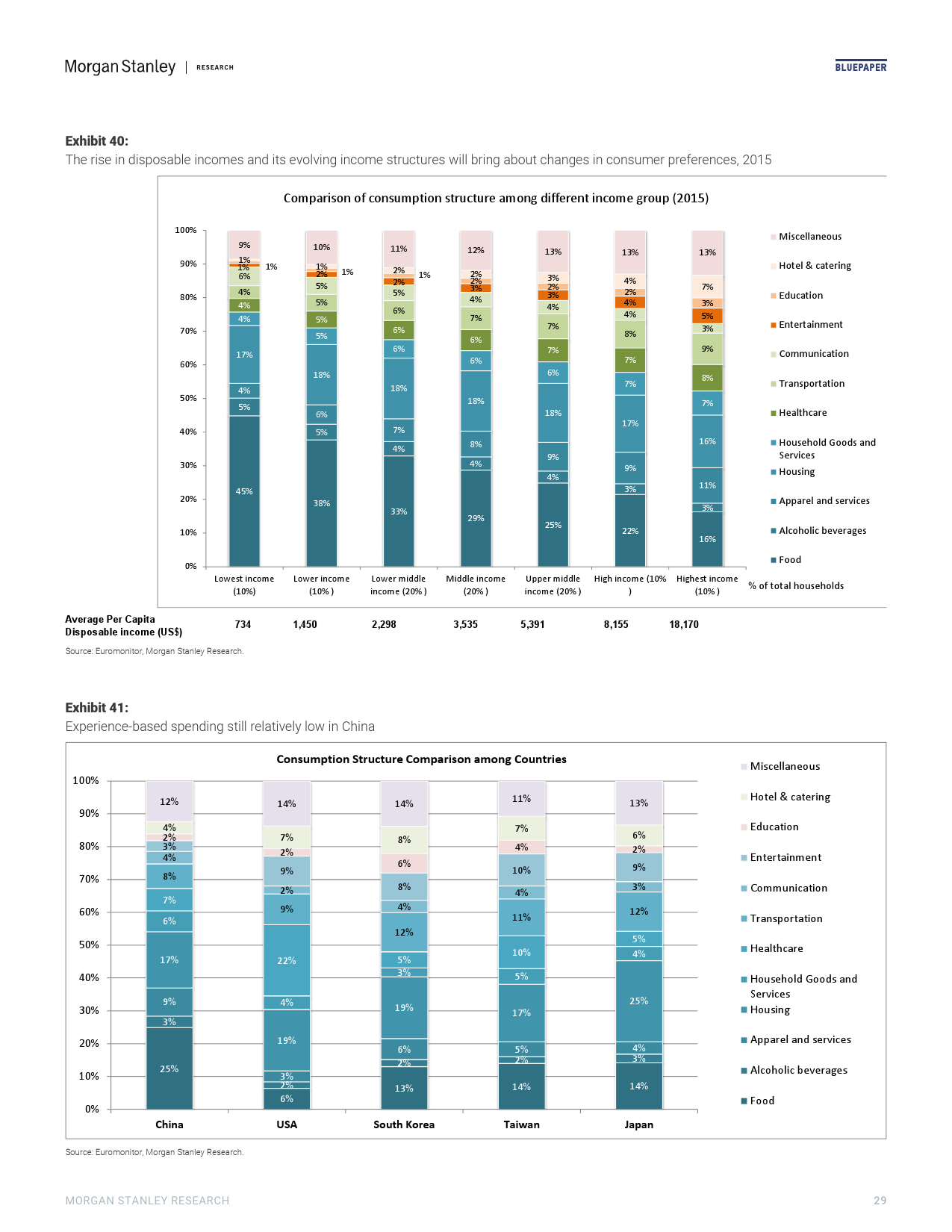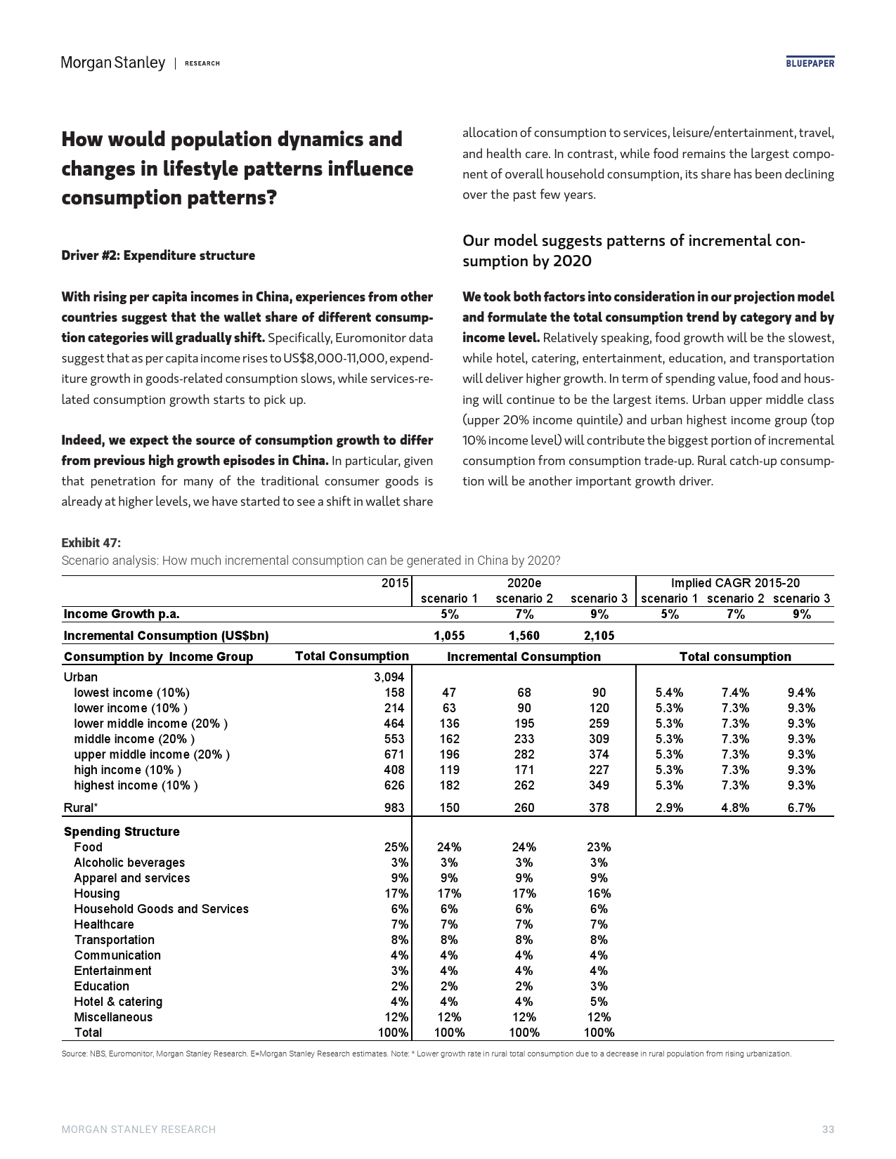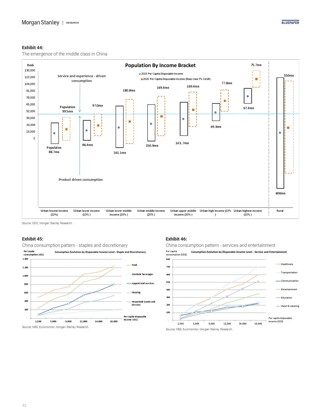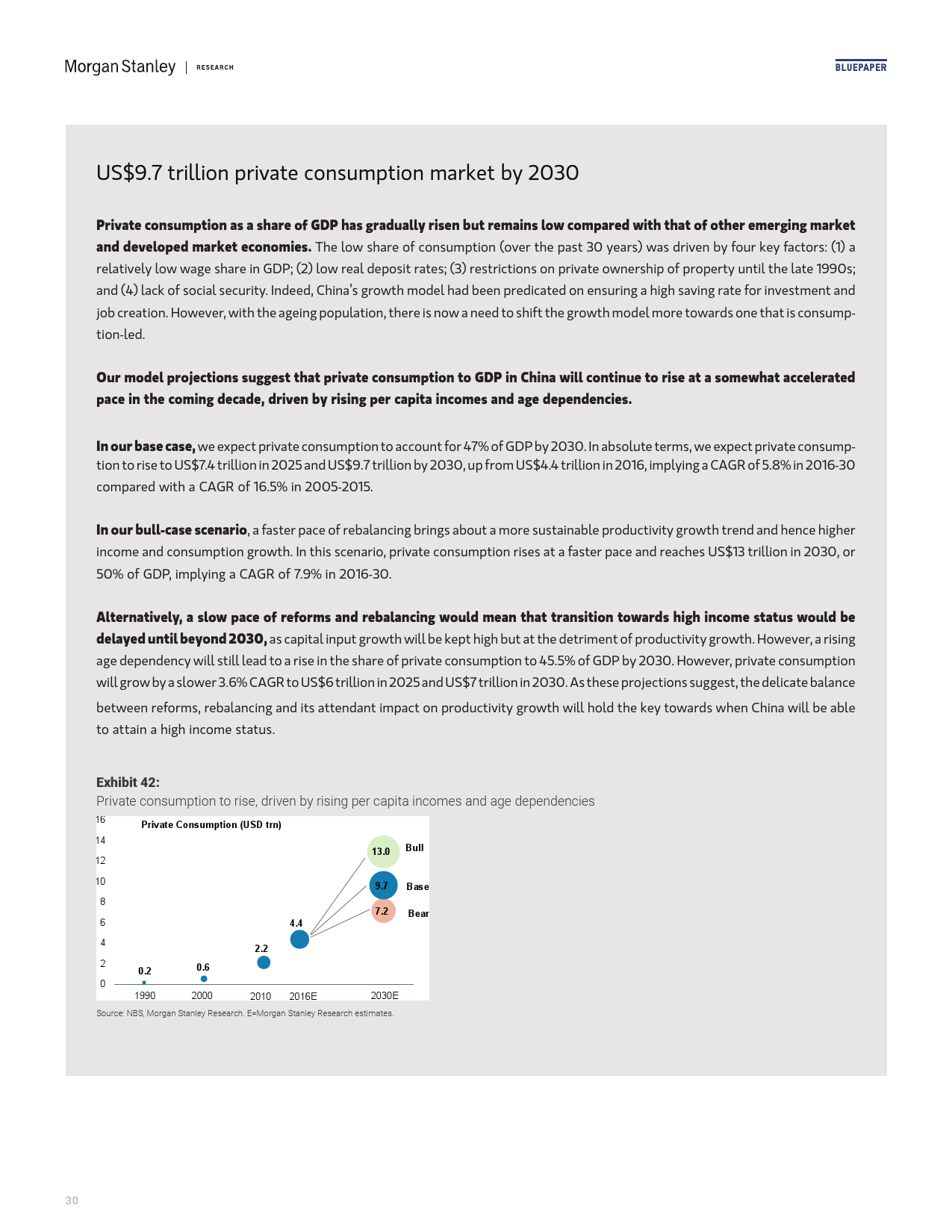 随着中国人均收入的增长及经济重大结构性改革的持续进行,投资者需要认识到这些经济变化的重要性和它们带来的机遇和挑战。中国经济蓝皮书讨论到,为了让中国步入高收入国家行列,推动经济活动的产业链升级,淘汰过剩的老旧产能行业,同时培育高端制造业、医疗保健、教育和环境服务等行业中的高附加值新经济活动。摩根士丹利经济学家认为消费和服务将成为经济版图中的两大主导。