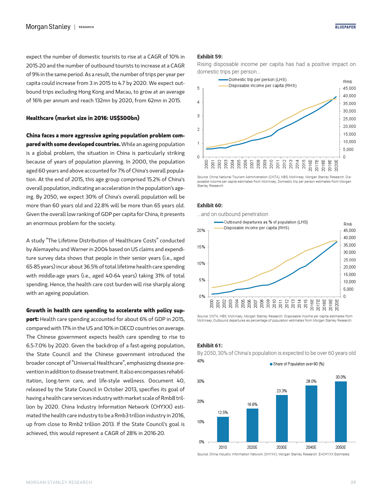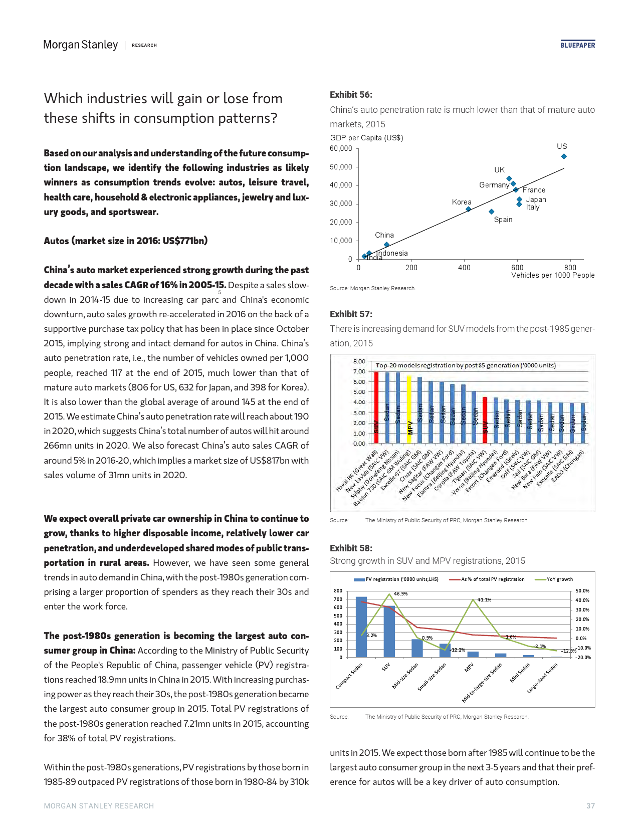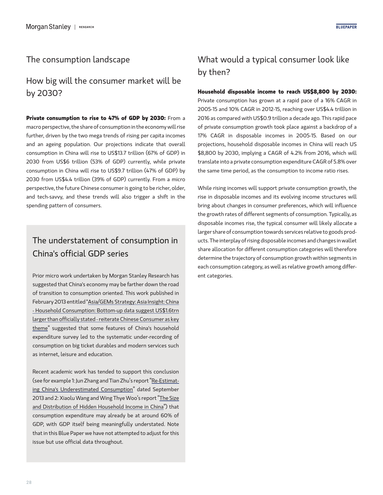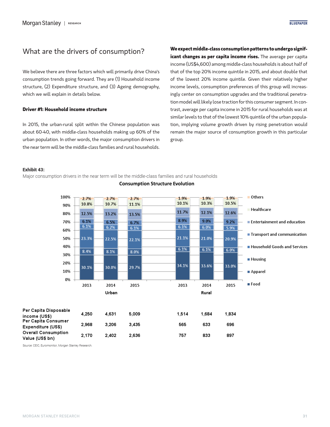 随着中国人均收入的增长及经济重大结构性改革的持续进行,投资者需要认识到这些经济变化的重要性和它们带来的机遇和挑战。中国经济蓝皮书讨论到,为了让中国步入高收入国家行列,推动经济活动的产业链升级,淘汰过剩的老旧产能行业,同时培育高端制造业、医疗保健、教育和环境服务等行业中的高附加值新经济活动。摩根士丹利经济学家认为消费和服务将成为经济版图中的两大主导。