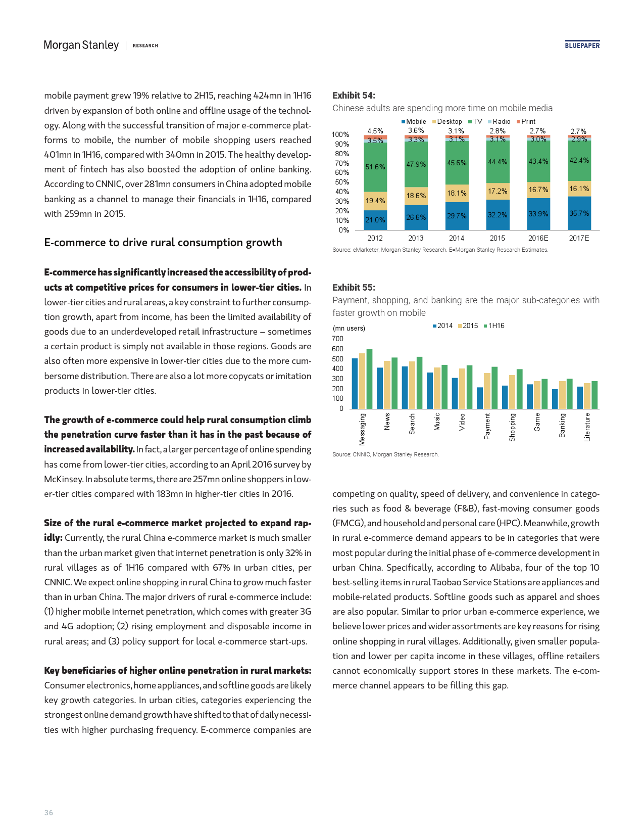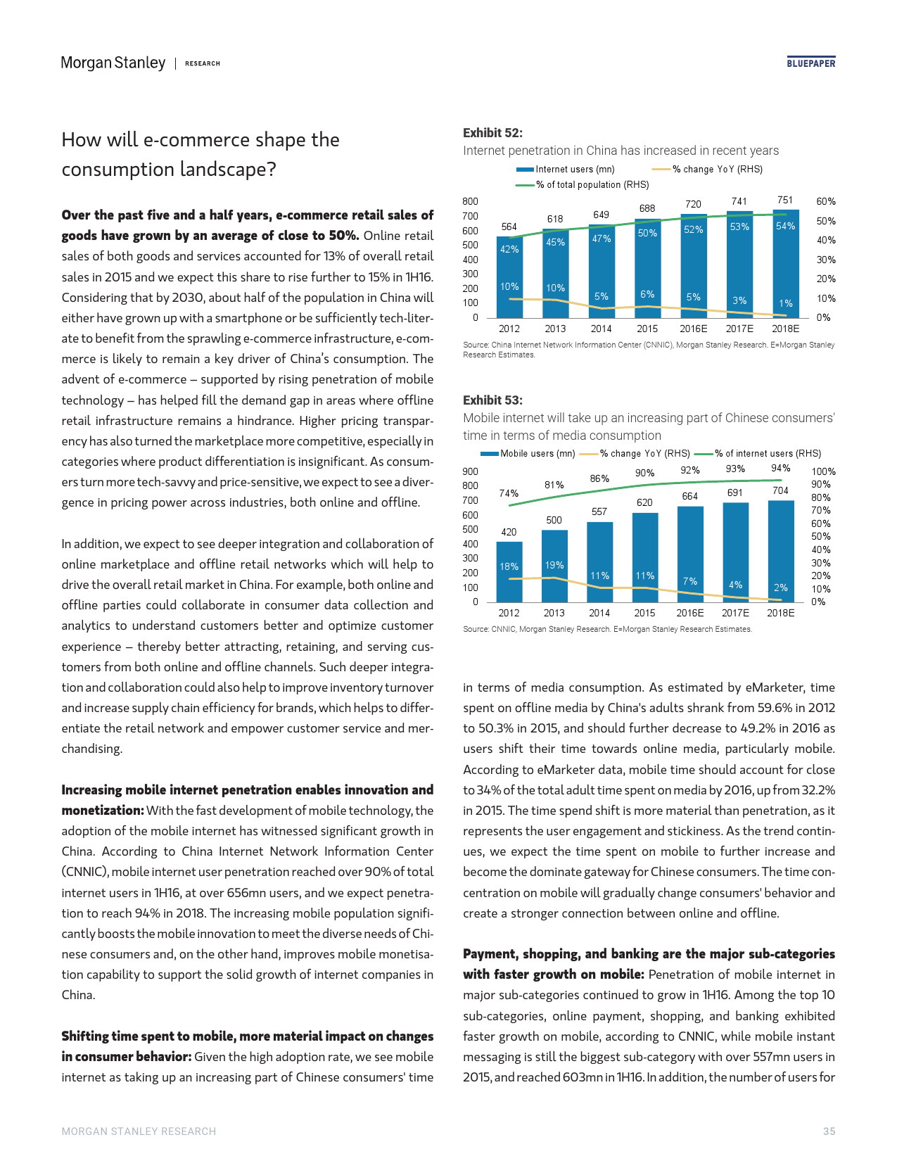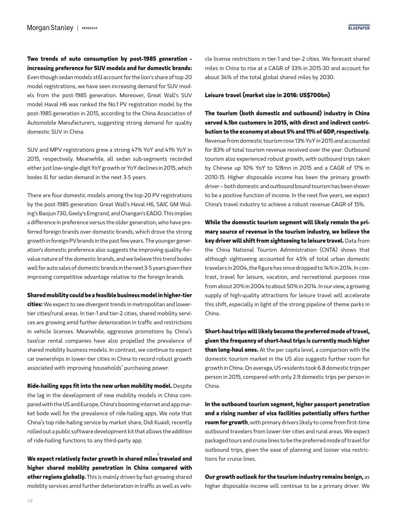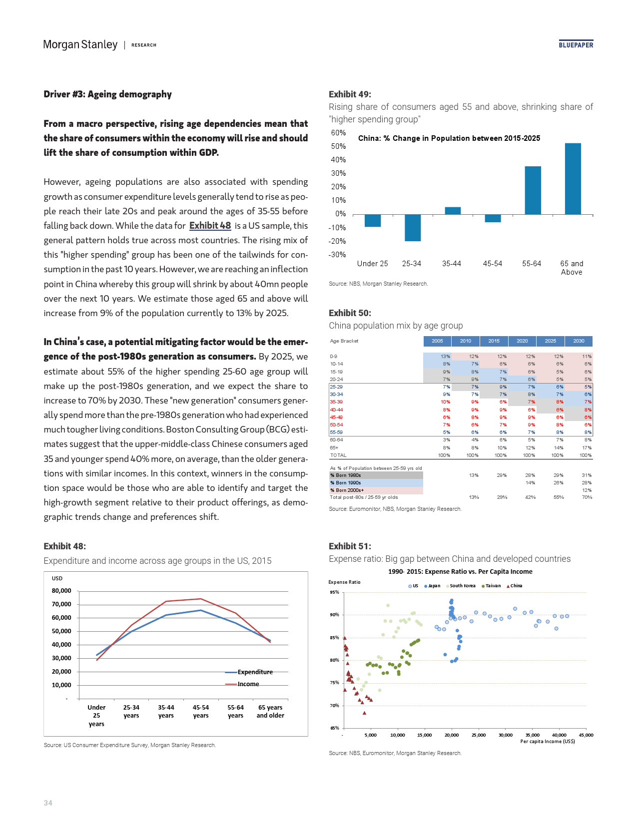 随着中国人均收入的增长及经济重大结构性改革的持续进行,投资者需要认识到这些经济变化的重要性和它们带来的机遇和挑战。中国经济蓝皮书讨论到,为了让中国步入高收入国家行列,推动经济活动的产业链升级,淘汰过剩的老旧产能行业,同时培育高端制造业、医疗保健、教育和环境服务等行业中的高附加值新经济活动。摩根士丹利经济学家认为消费和服务将成为经济版图中的两大主导。