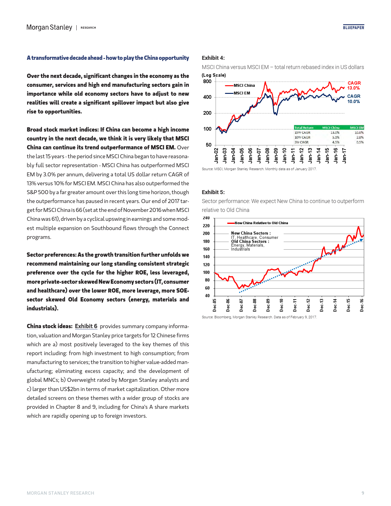 中国经济转型改革将为全球投资者提供重要的投资机会,摩根士丹利团队有信心这个发展态势将让MSCI中国指数长期跑赢全球新兴市场指数。摩根士丹利经济学家会不断跟踪经济转型的进程和他们对市场的影响,并在未来几个月与客户交流。