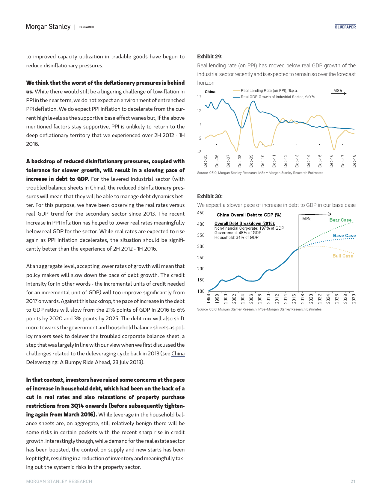 摩根士丹利指出,中国迈向高收入经济的道路存在风险。认为中国经济未来能达到摩根士丹利基本观点的关键将取决于2点:政策制定者如何管理债务周期,以及中国经济向高附加值行业转型的进展。摩根士丹利认为其中最显著的进步是领导层开始愿意接受较低的增长目标,并开始将政策重点转移到防范金融风险和资产泡沫方面,预示着政府不会再不惜一切代价通过投资低回报的项目来保增长。这种政策方向的转变让摩根士丹利经济学家对政府有能力控制债务对GDP比例的上升速度,维持经济平稳转型的预期更有信心。中国私有部门和拥有巨大资源优势的国有企业在高附加值行业转型过程中都将受益。