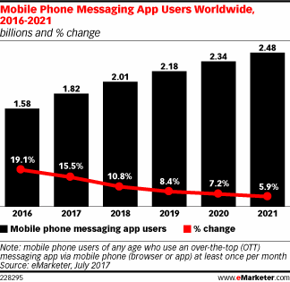 手机通讯应用的吸引力不断扩大。eMarketer预测,2017年,全球将有18.2亿人使用Facebook Messenger和微信等应用程序,同比增长15.5%。
