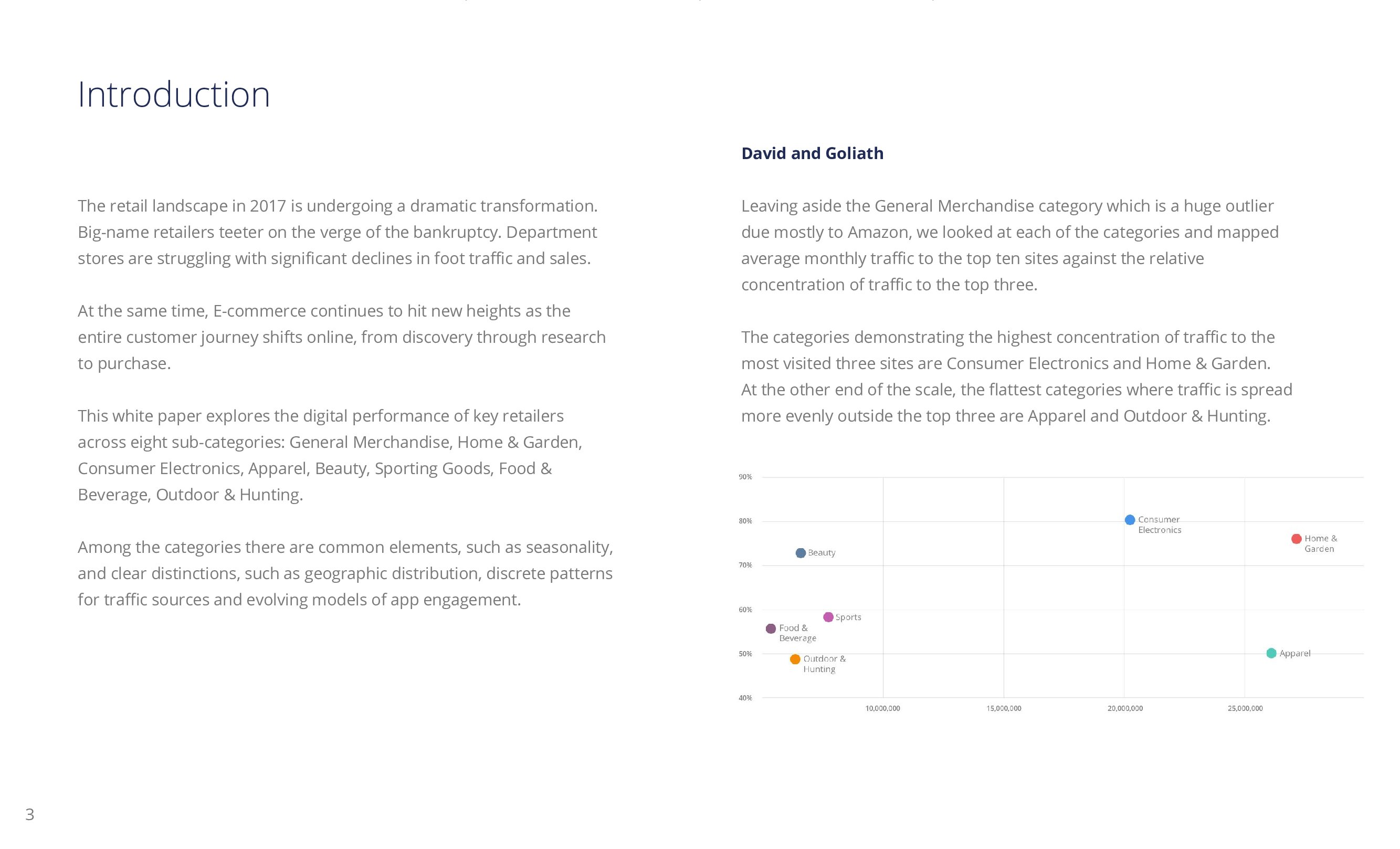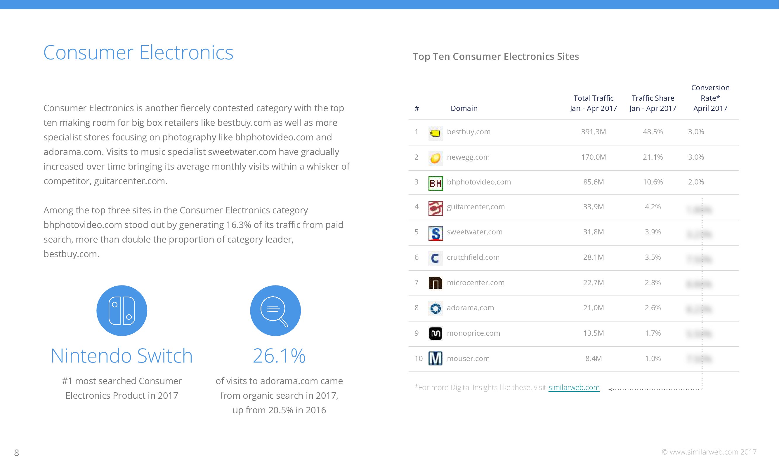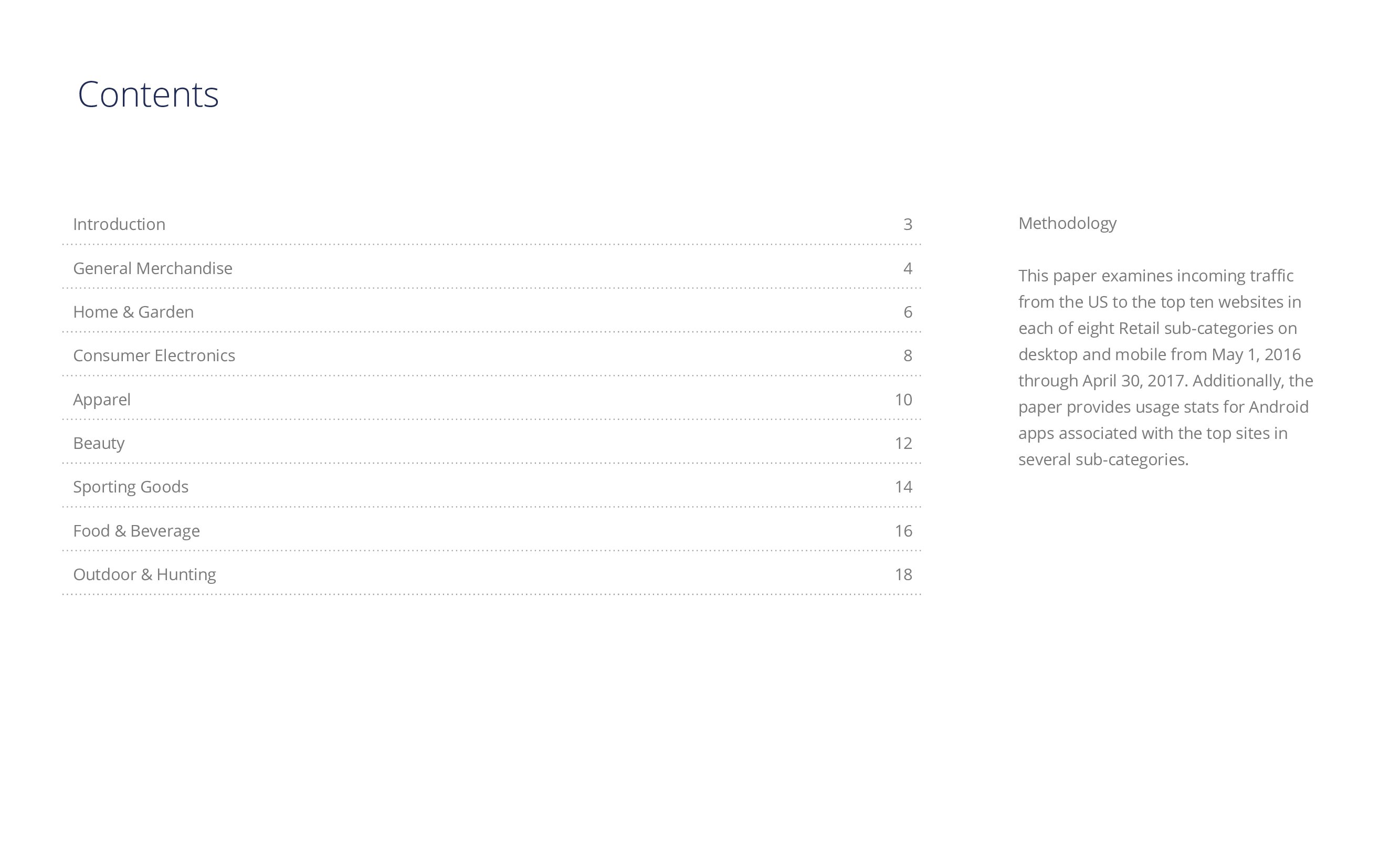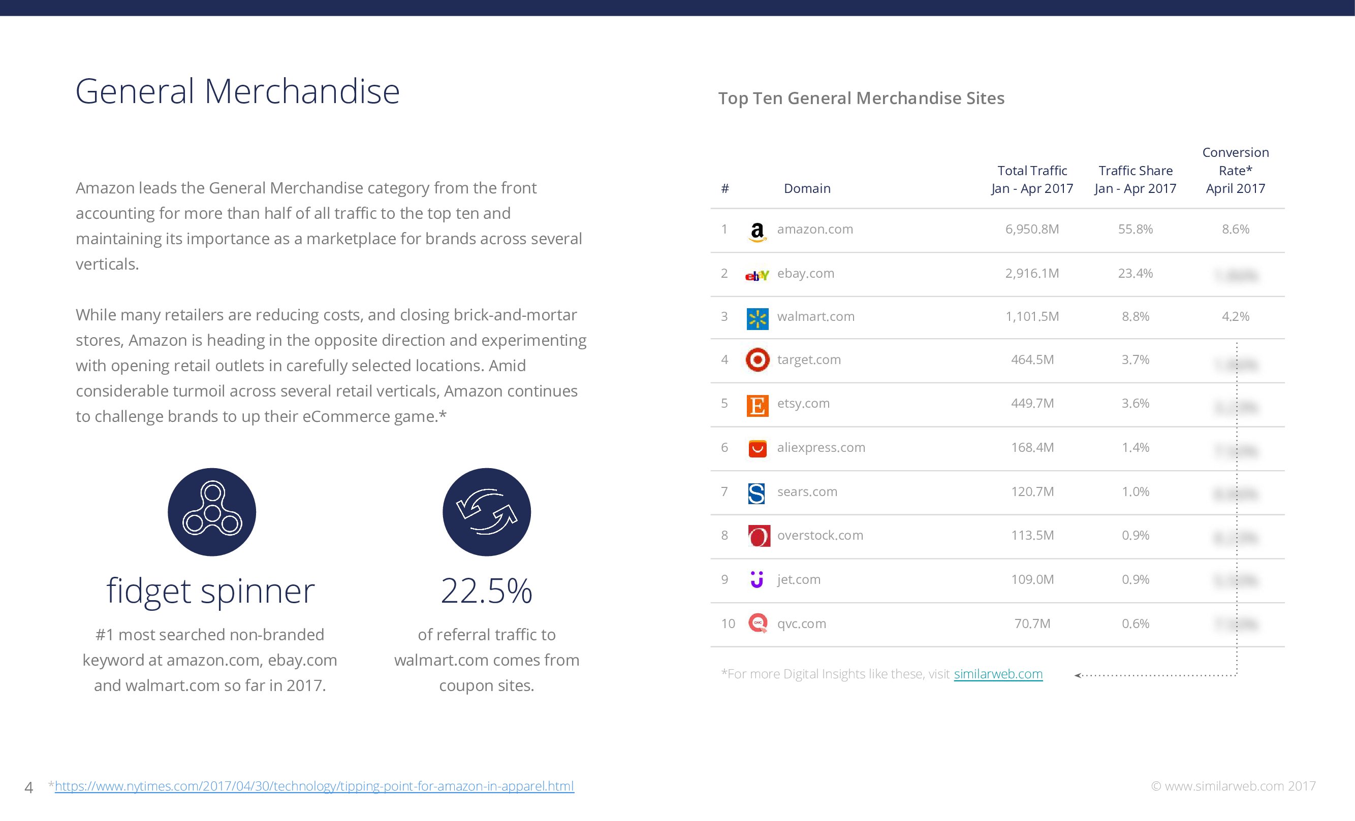 2017年,零售业正在发生巨大转变,一些大型零售商濒临破产,还有一些商店正在努力解决销售额大幅下滑的问题。SimilarWeb发布了最新的“零售市场情报”报告,覆盖了百货、家居与园艺、消费电子、服装、美容、体育用品、食品、饮料和户外八个分类。