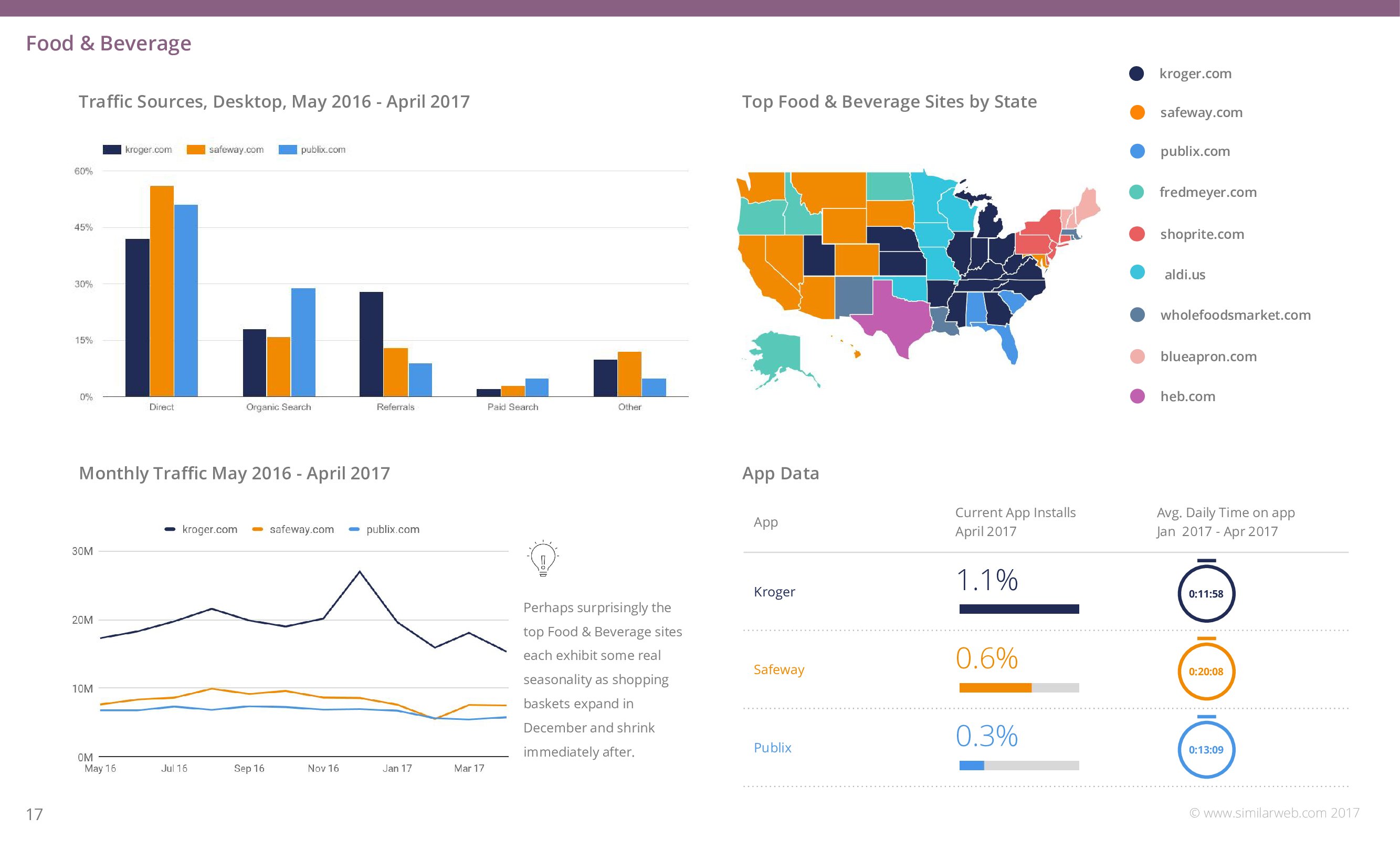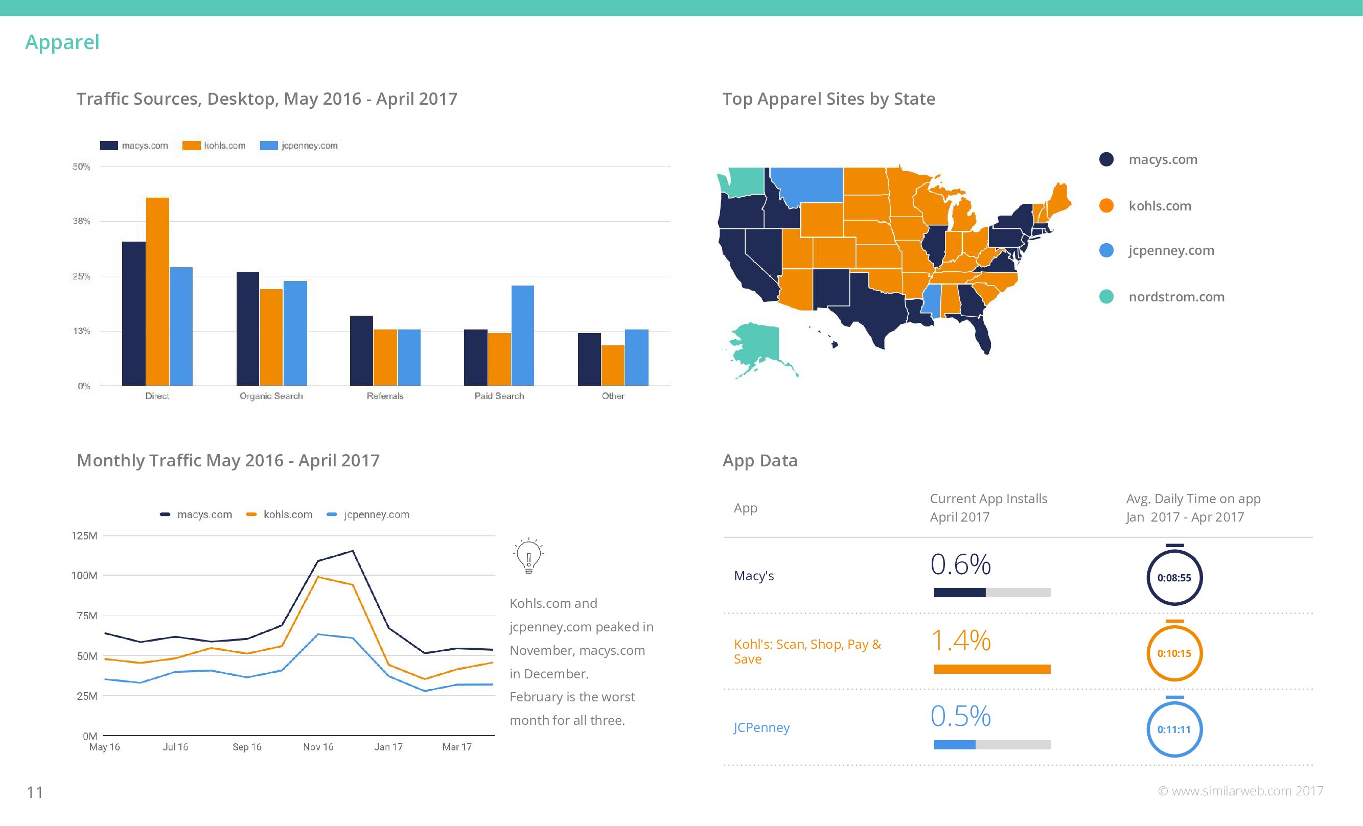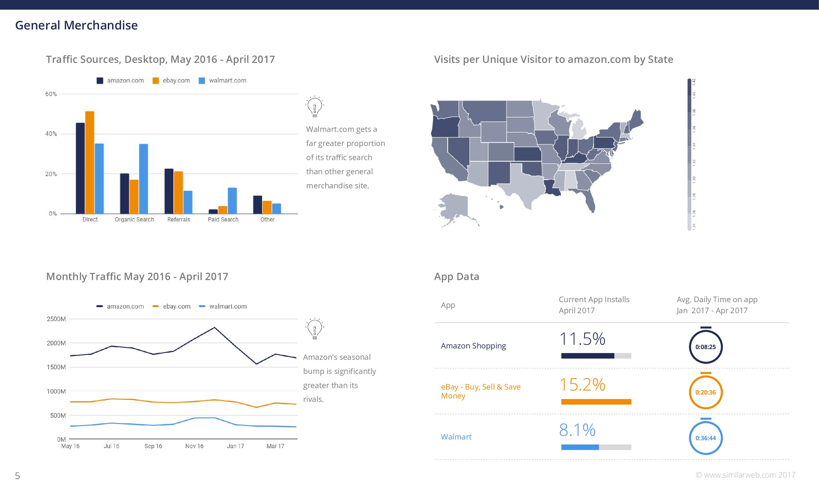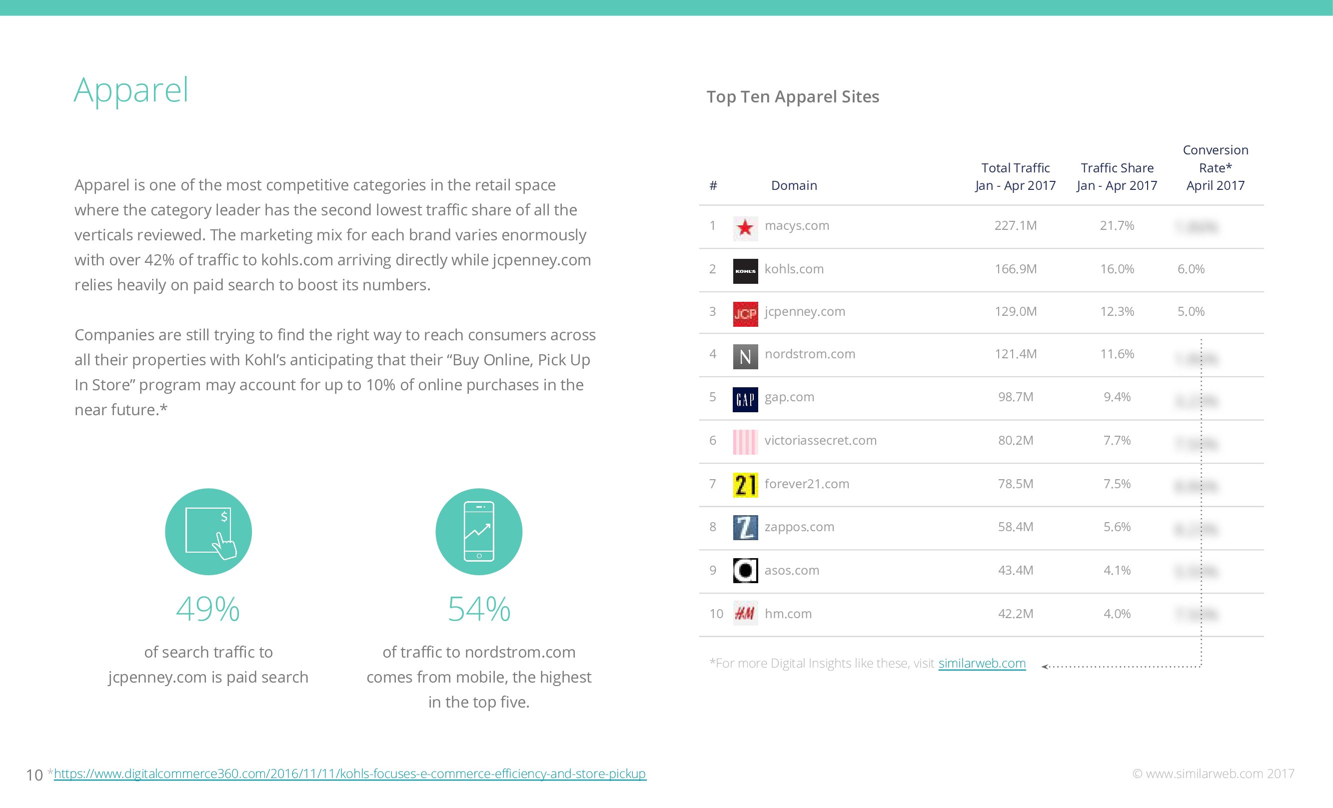2017年,零售业正在发生巨大转变,一些大型零售商濒临破产,还有一些商店正在努力解决销售额大幅下滑的问题。SimilarWeb发布了最新的“零售市场情报”报告,覆盖了百货、家居与园艺、消费电子、服装、美容、体育用品、食品、饮料和户外八个分类。