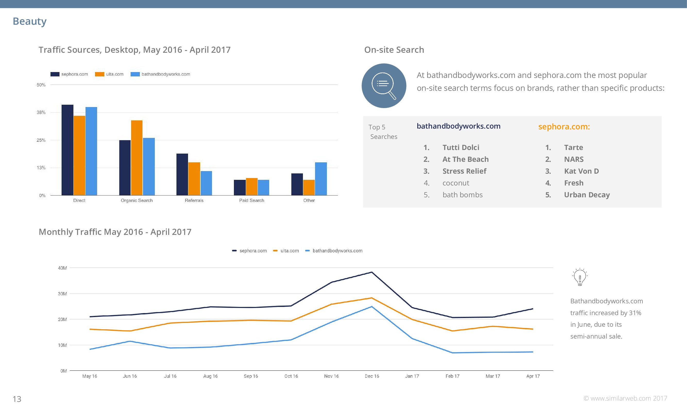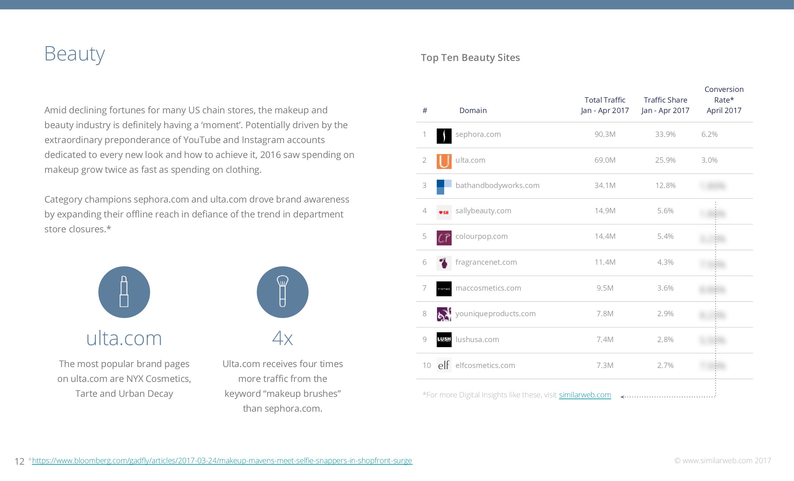 许多美国连锁店收入下降,而化妆和美容行业则正相反。2016年,化妆品支出增长速度是服装的两倍。sephora.com和ulta.com提高了品牌知名度。