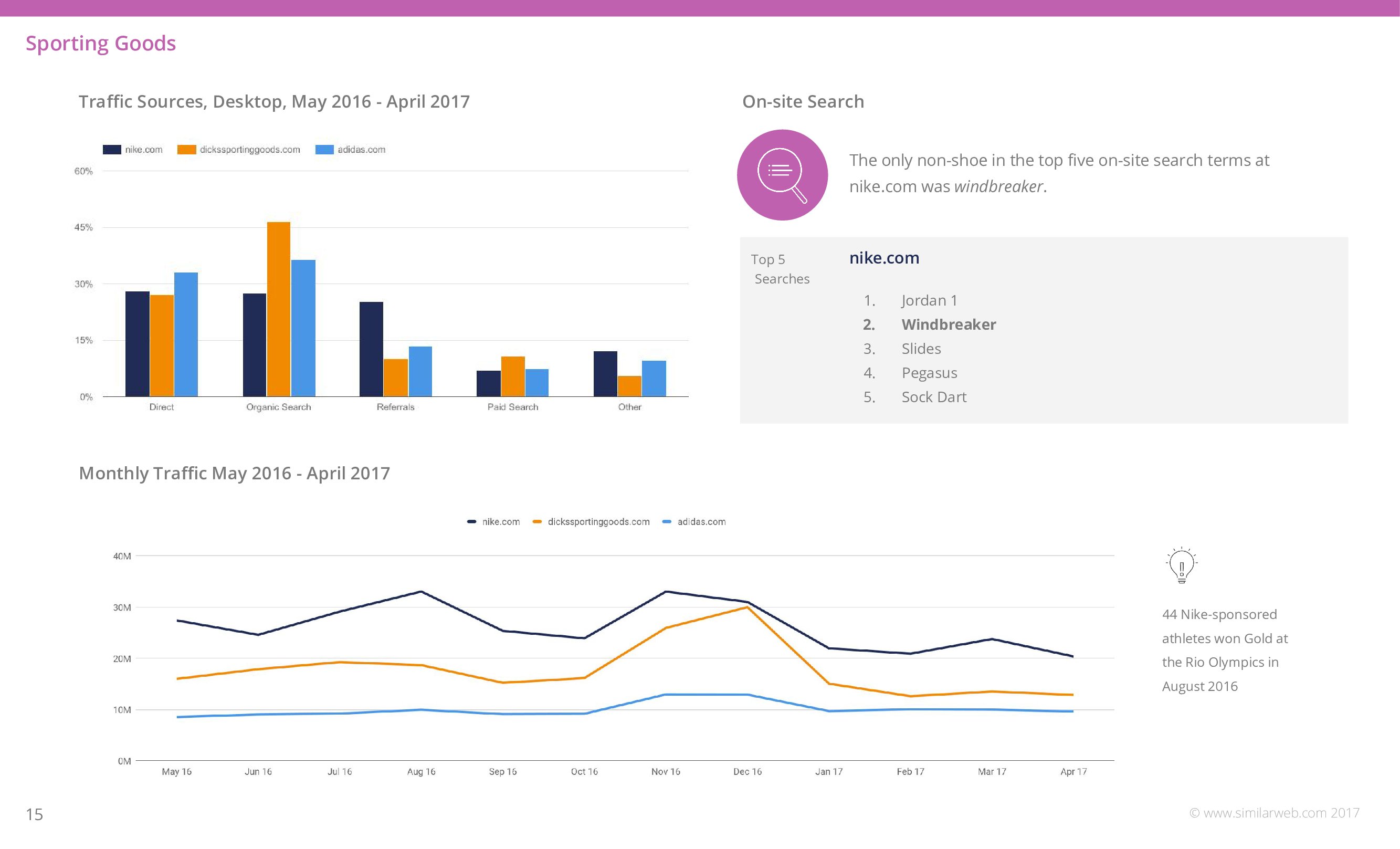 体育用品通常在假日购物季出现销售高峰。一些品牌通过赞助运动员提升销量,例如Nike赞助美国奥运赛道和运动选手,去年8月销售大幅提升。