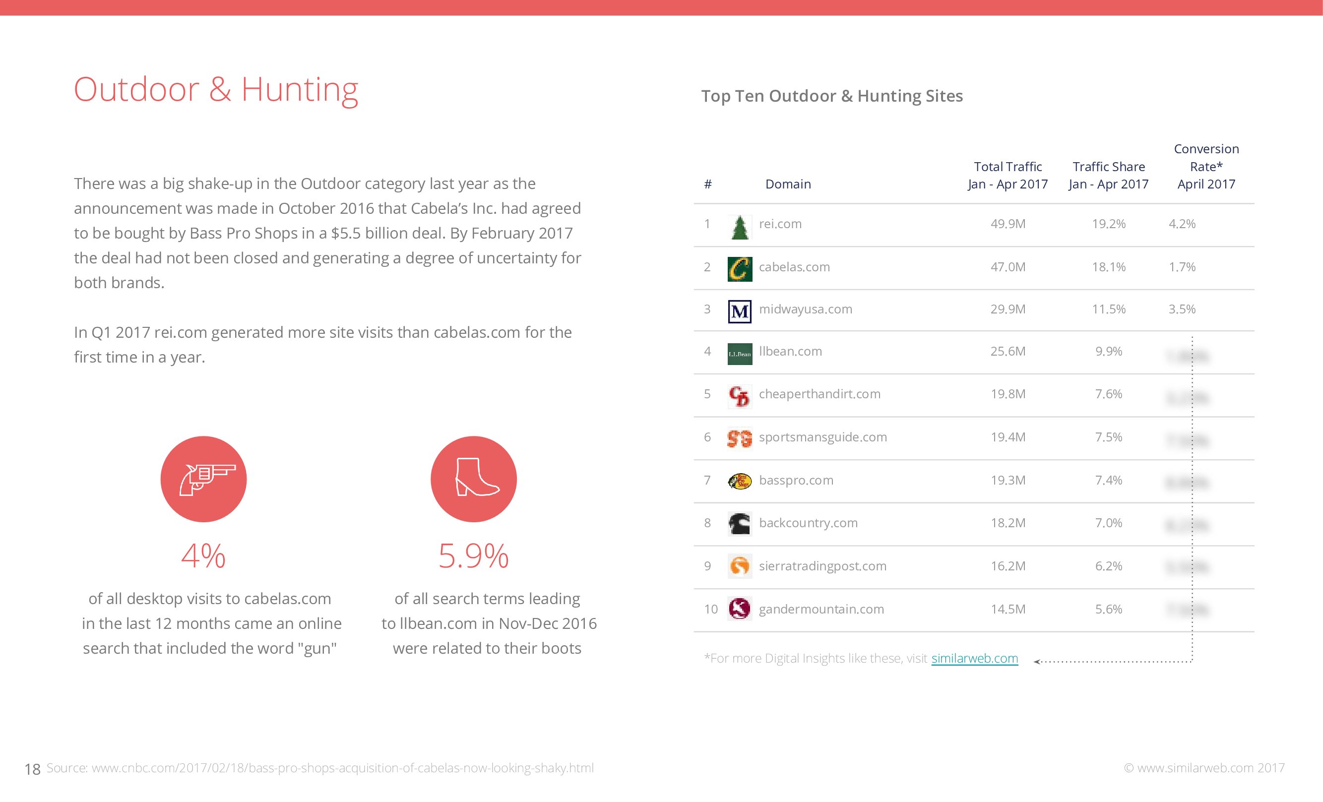 户外类有一些变化,2016年10月Cabela’s Inc同意以55亿美元的价格被Bass Pro Shops收购,但是到今年2月交易仍未关闭,因此给两个品牌带来了一些不确定性。