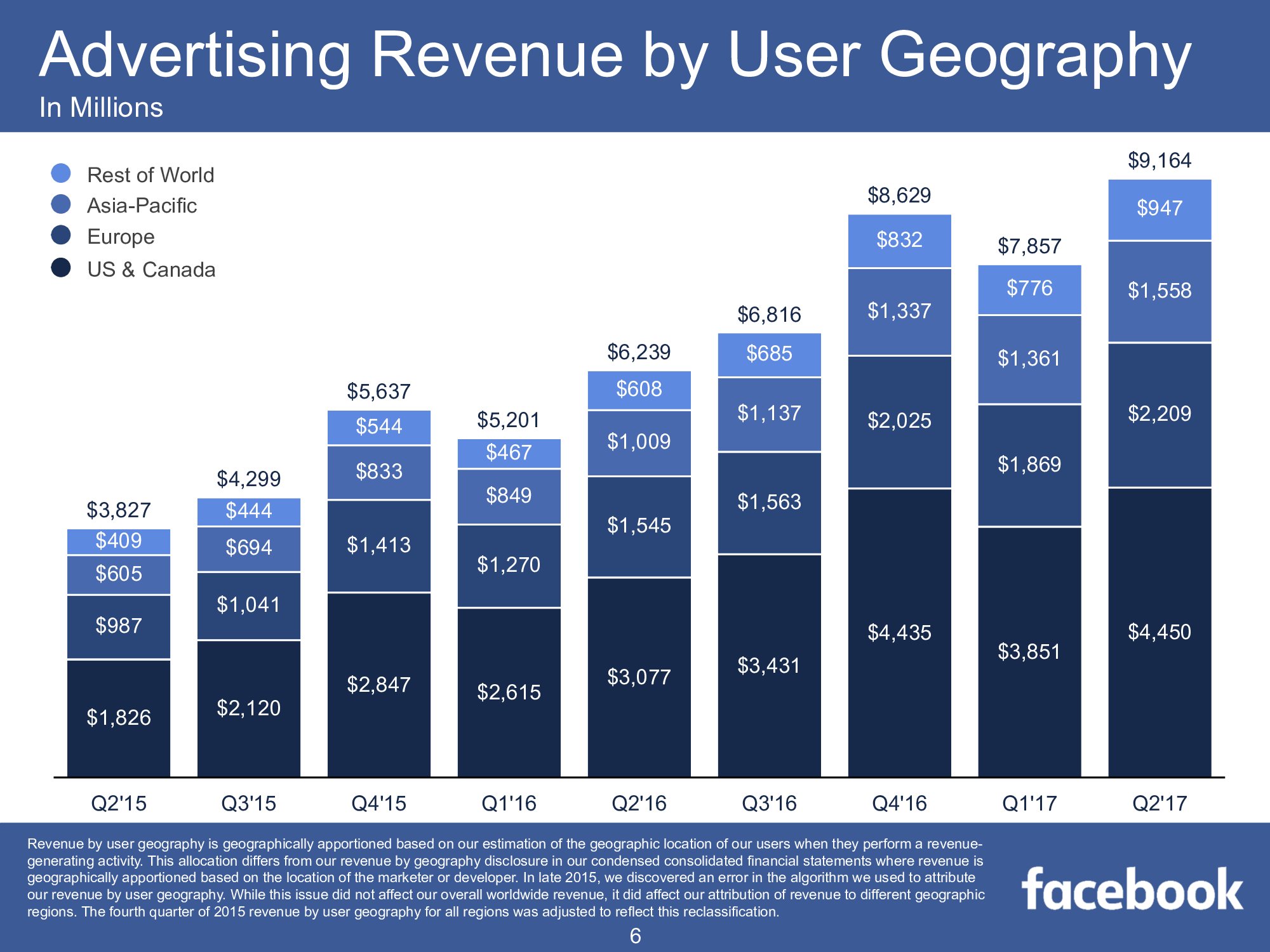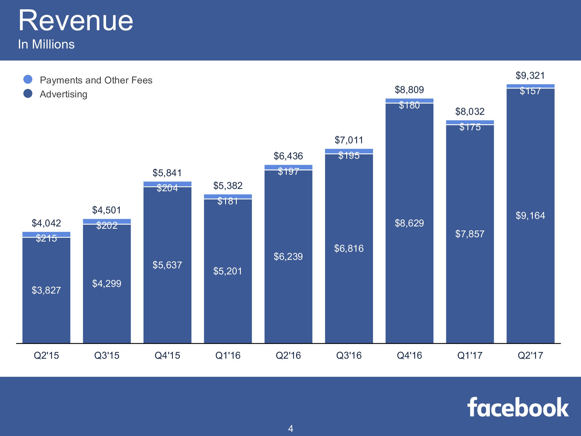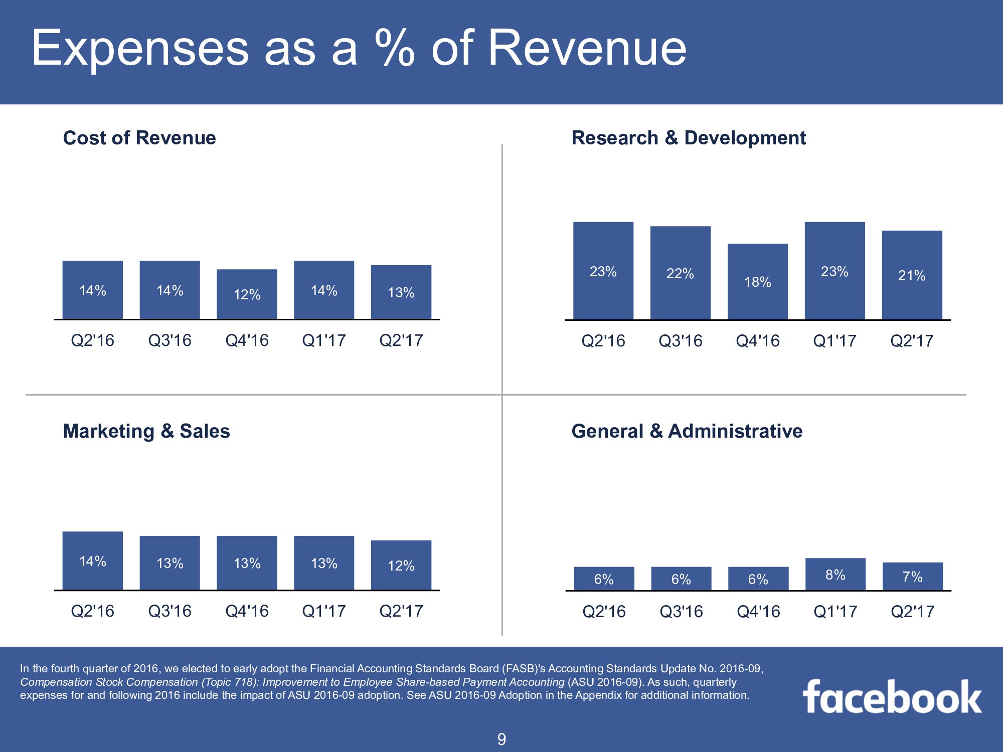 Facebook刚刚发布了2017年第二季度业务报告。第二季度,Facebook收入增长45%,达到93.2亿美元,利润增长71%,达到38.9亿美元。
