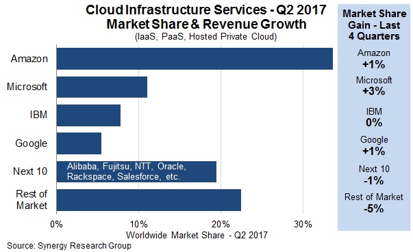 Synergy Research Group的最新数据显示,四大领先的云提供商在继续维持或扩大其在全球云基础设施服务市场的份额。自2016年第二季度以来,微软和Google的季度收入几乎翻了一番,市场份额增加明显。市场领先者AWS的收入也在继续增长。第二季度,AWS市场份额为34%,微软为11%,Google为5%。IBM的市场份额稳定在8%,主要得益于托管私有云服务的强劲表现。