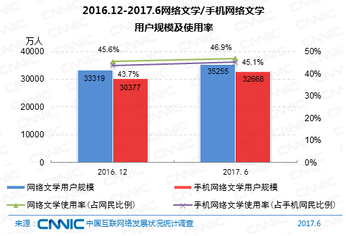 截至 2017年 6月,网络文学用户规模达到 3.53亿,较去年底增加 1936万,占网民总体的 46.9%,其中手机网络文学用户规模为 3.27亿,较去年底增加 2291万,占手机网民的45.1%。