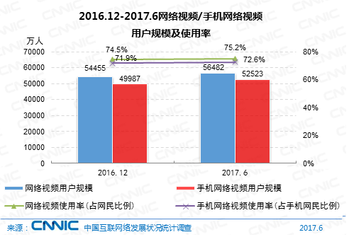 截至2017年6月,中国网络视频用户规模达5.65亿,较2016年底增加2026万人,增长率为3.7%;网络视频用户使用率为75.2%,较2016年底提升0.7个百分点。其中,手机视频用户规模为5.25亿,与2016年底相比增长2536万人,增长率为5.1%;手机网络视频使用率为72.6%,相比2016年底增长0.7个百分点。
