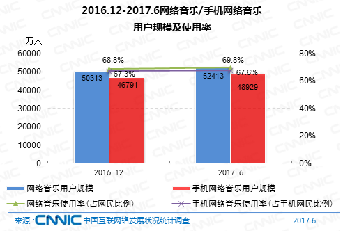 截至2017年6月,网络音乐用户规模达到5.24亿,较去年底增加2101万,占网民总体的69.8%。其中手机网络音乐用户规模达到4.89亿,较去年底增加2138万,占手机网民的67.6%。