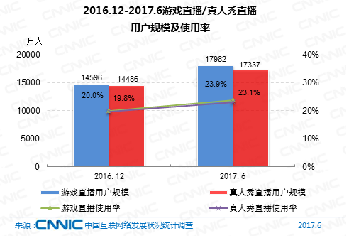 从网络直播 的内容类别来看,游戏直播和真人秀直播用户使用率明显增长。截至2017年6月,网络直播用户共3.43亿,占网民总体的45.6%。其中,游戏直播用户规模达到1.80亿,较去年底增加3386万,占网民总体的23.9%;真人秀直播用户规模达到1.73亿,较去年底增加2851万,占网民总体的23.1%。