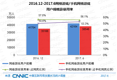 截至2017 年6 月,我国网络游戏用户规模达到4.22 亿,较去年底增长460 万,占整体网民的56.1%。手机网络游戏用户规模为3.85 亿,较去年底增长3380 万,占手机网民的53.3%。