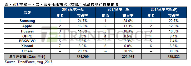 从市占率排名来看,三星第二季保持约8000万支的产出,稳站全球第一的市占宝座,除了旗舰机种S8系列问市,主要仍由中低端的J(Junior)系列支撑买气,带动淡季表现亮眼。集邦咨询认为,三星在第三季的表现虽会受苹果即将发表的三款新机,进而影响其高端销售,但随着Note系列即将发表,第三季仍有机会维持将近8000万支的生产总量,预估三星第三季全球市占率约22.7%,将维持排名第一态势。