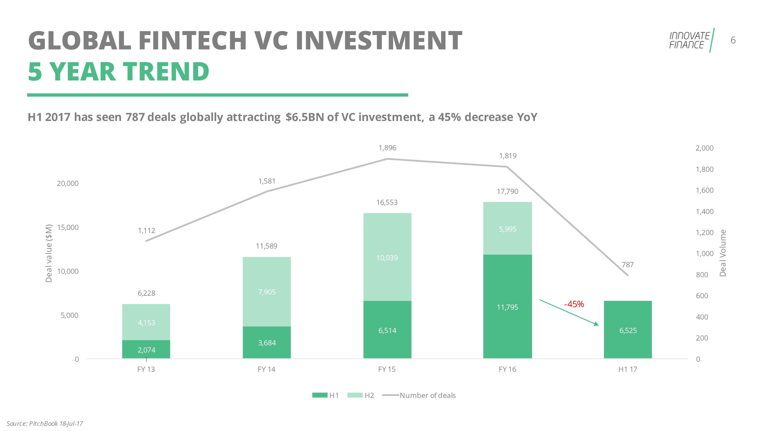 2017年上半年,金融科技领域共有787笔交易,吸引了65亿美元风险投资,同比下降45%;
