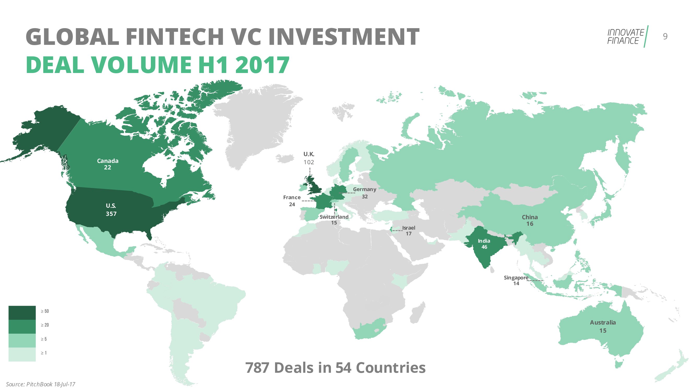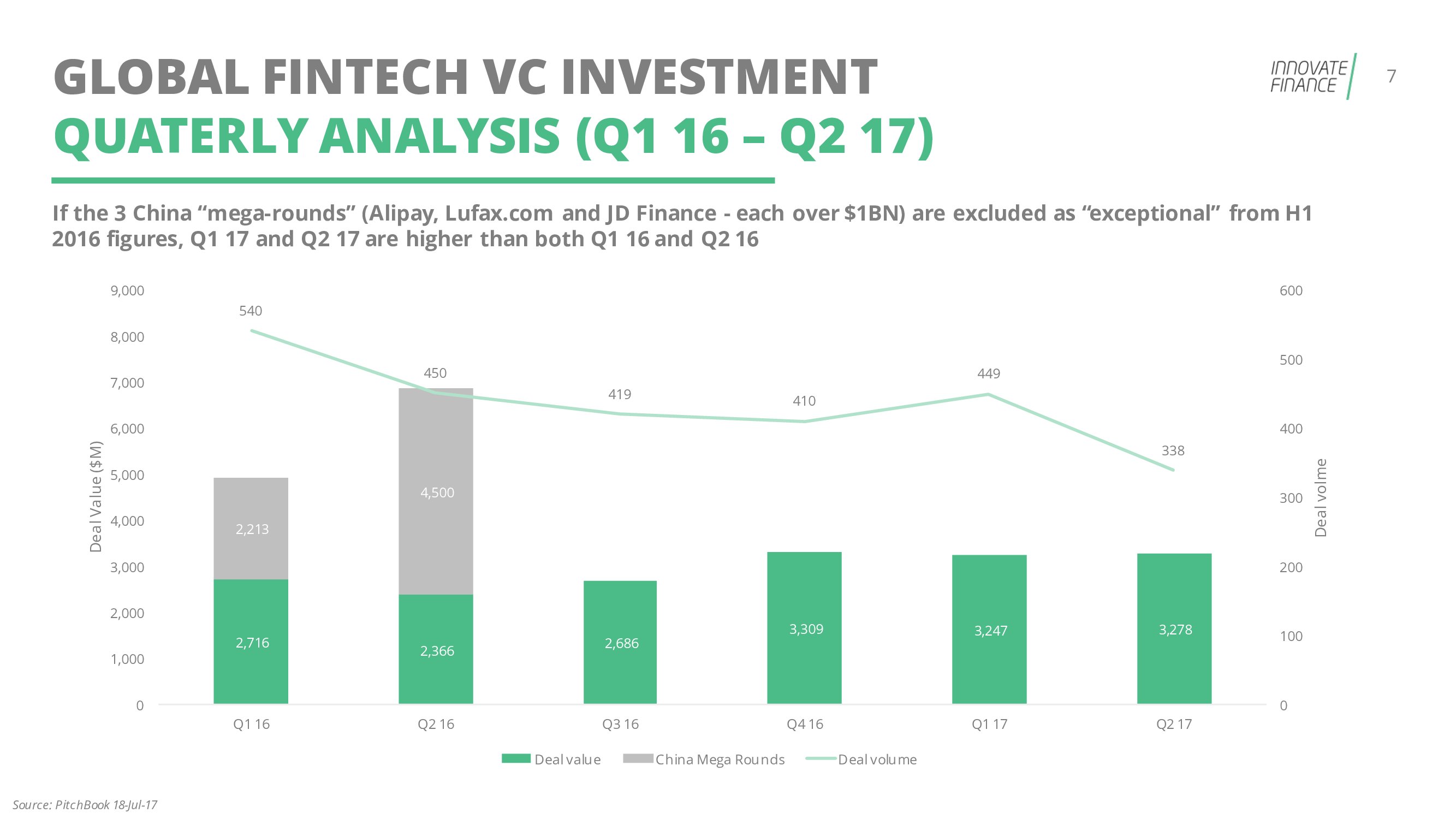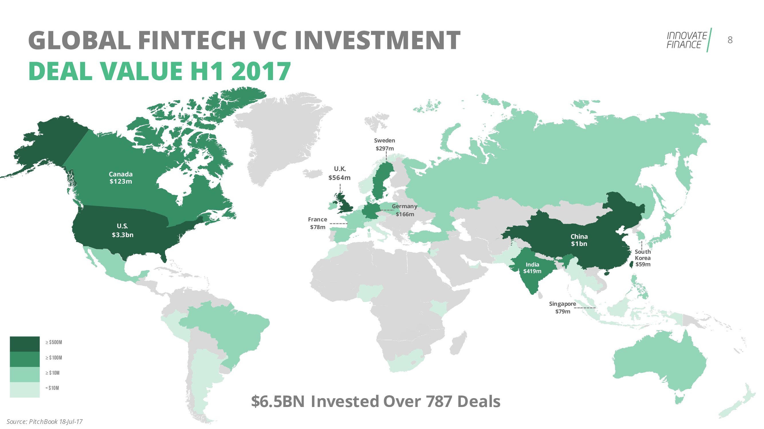 如果中国3笔大宗投资排除在外(阿里巴巴、陆金所和京东金融,投资均超过10亿美元),2017年上半年,全球金融科技风险投资同比增长28.4%;