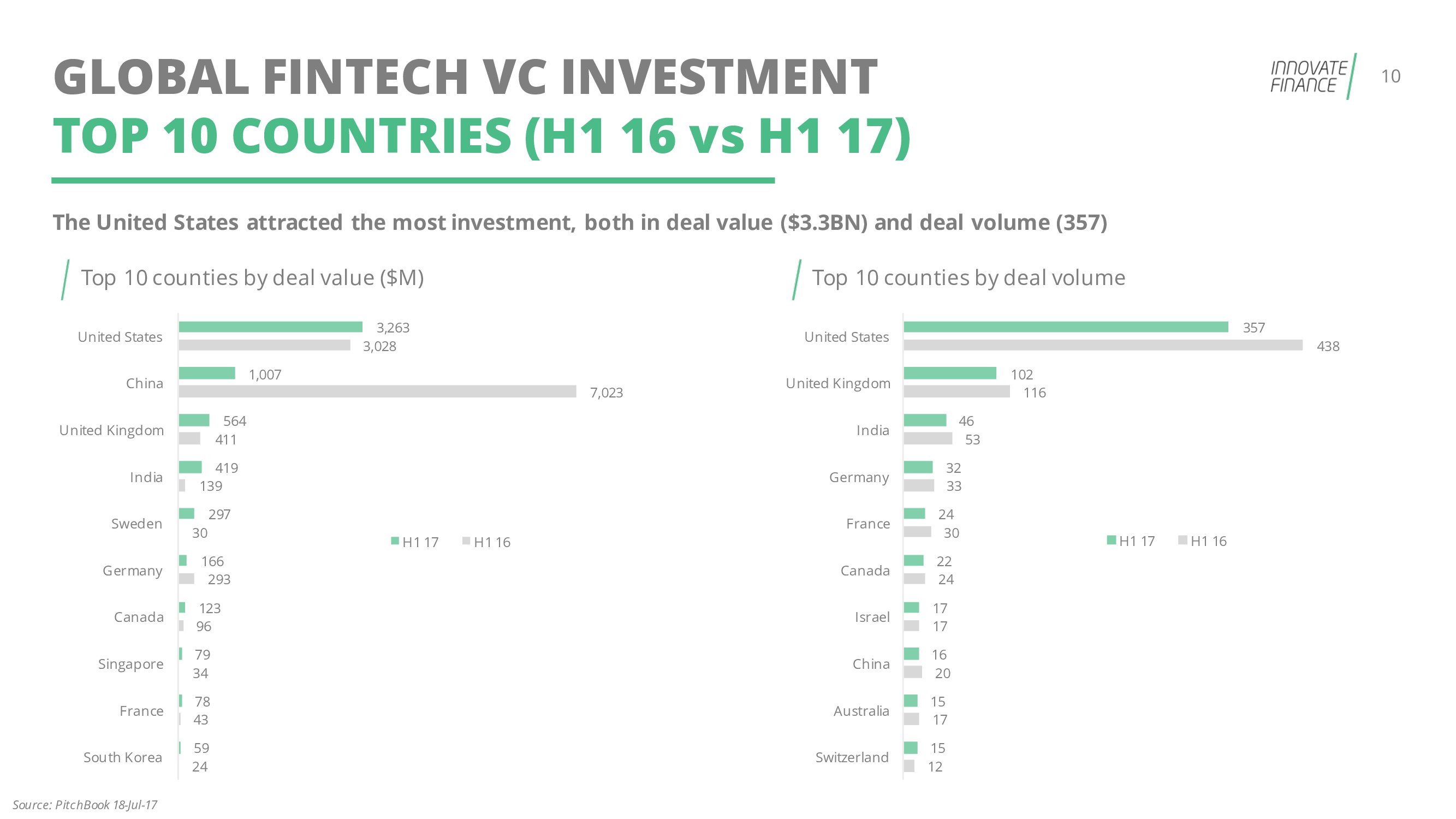 美国主宰全球金融科技风险投资,上半年共有357笔交易,吸引风险投资33亿美元,投资交易同比下降18.5%;