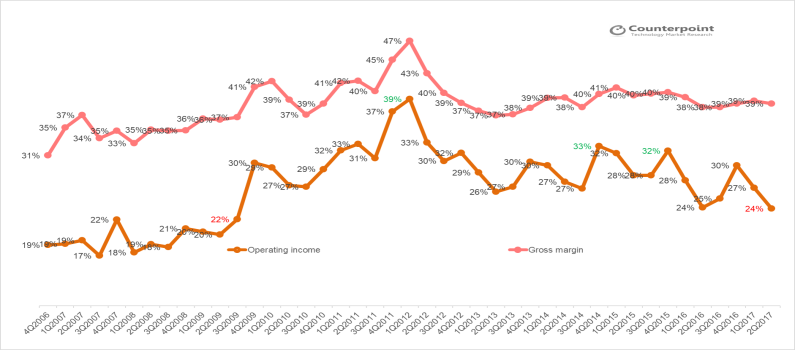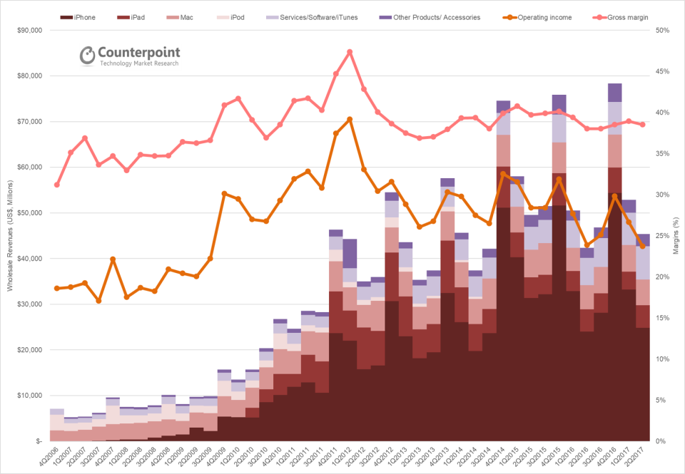 今年是iPhone十周年,但是,苹果营业毛利却降至2009年的水平。