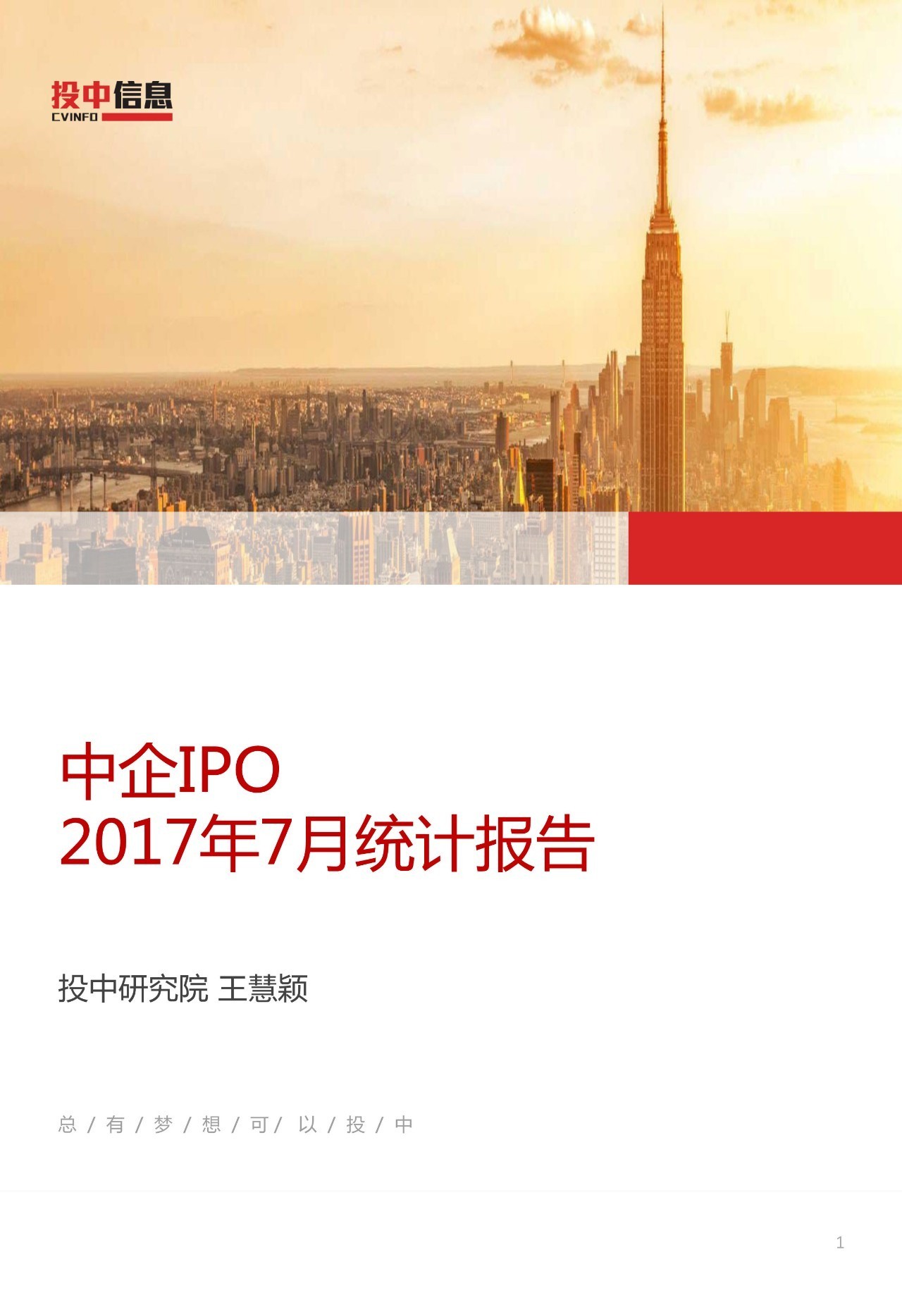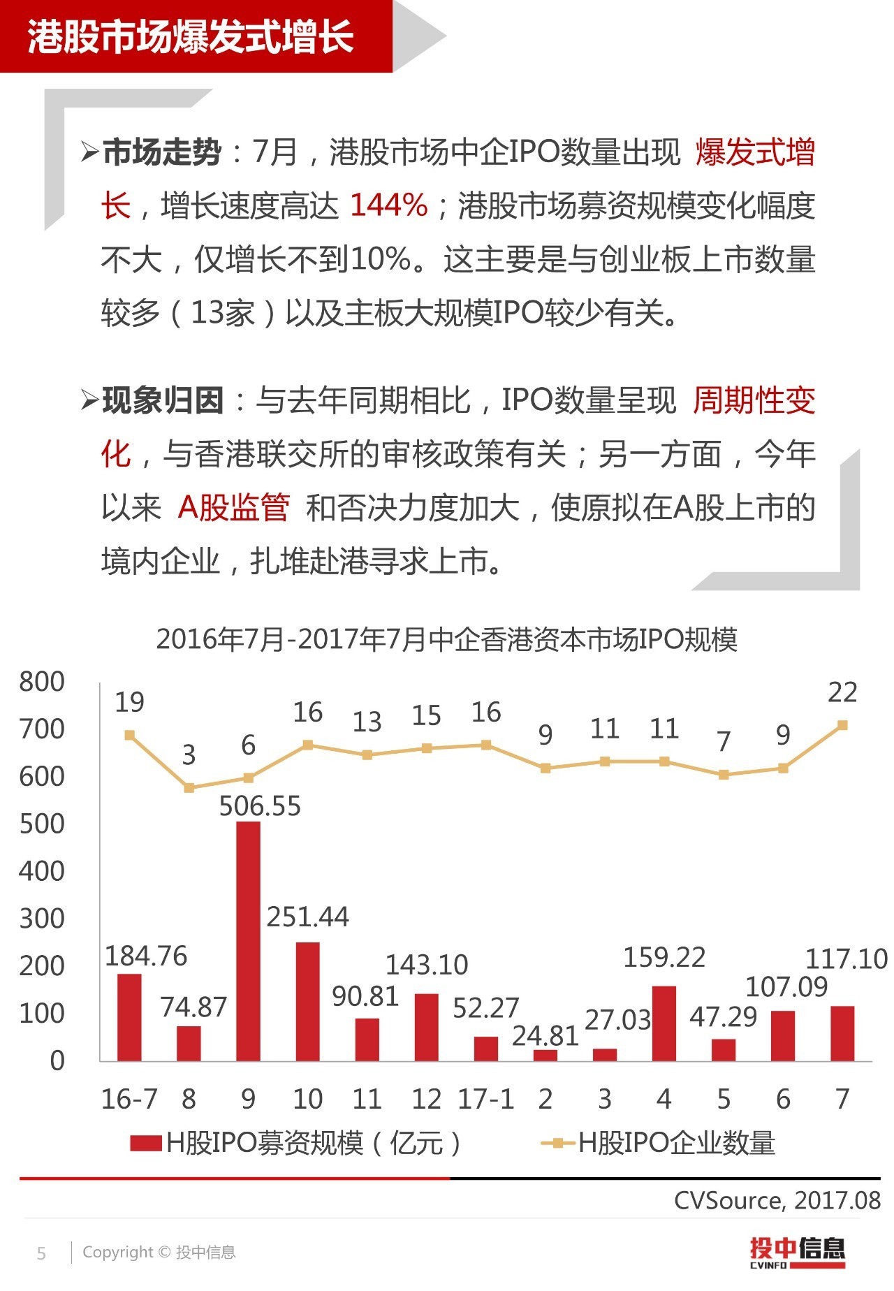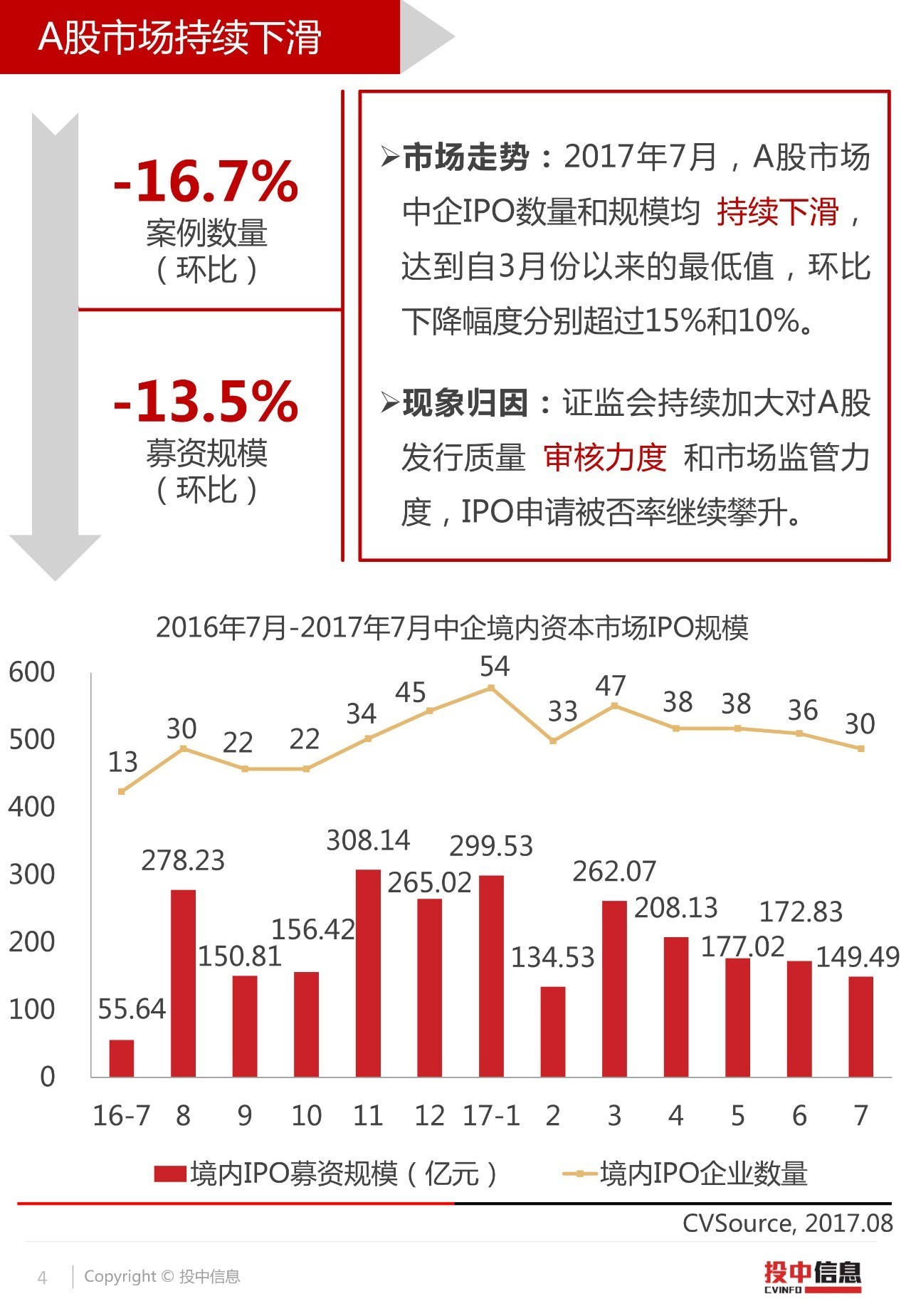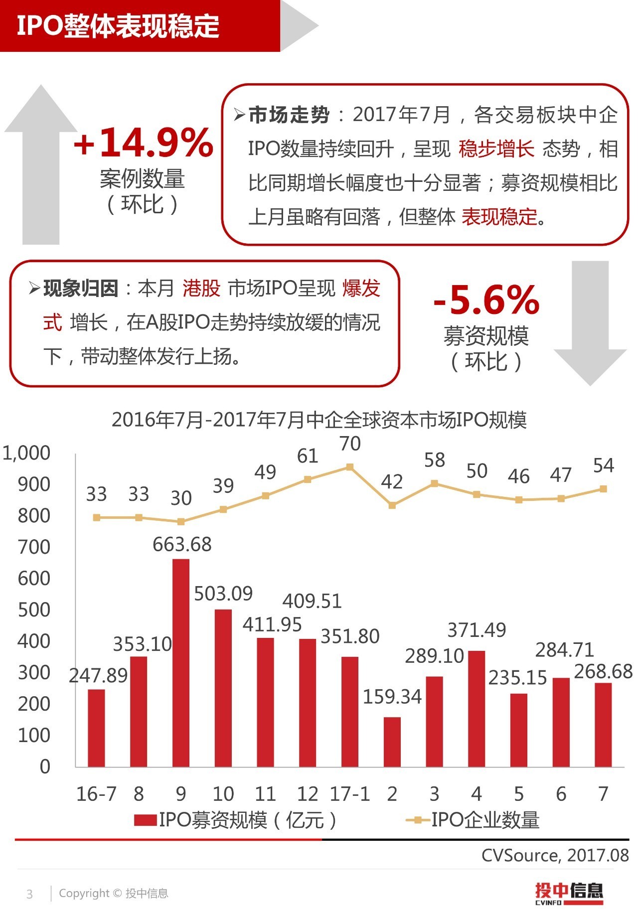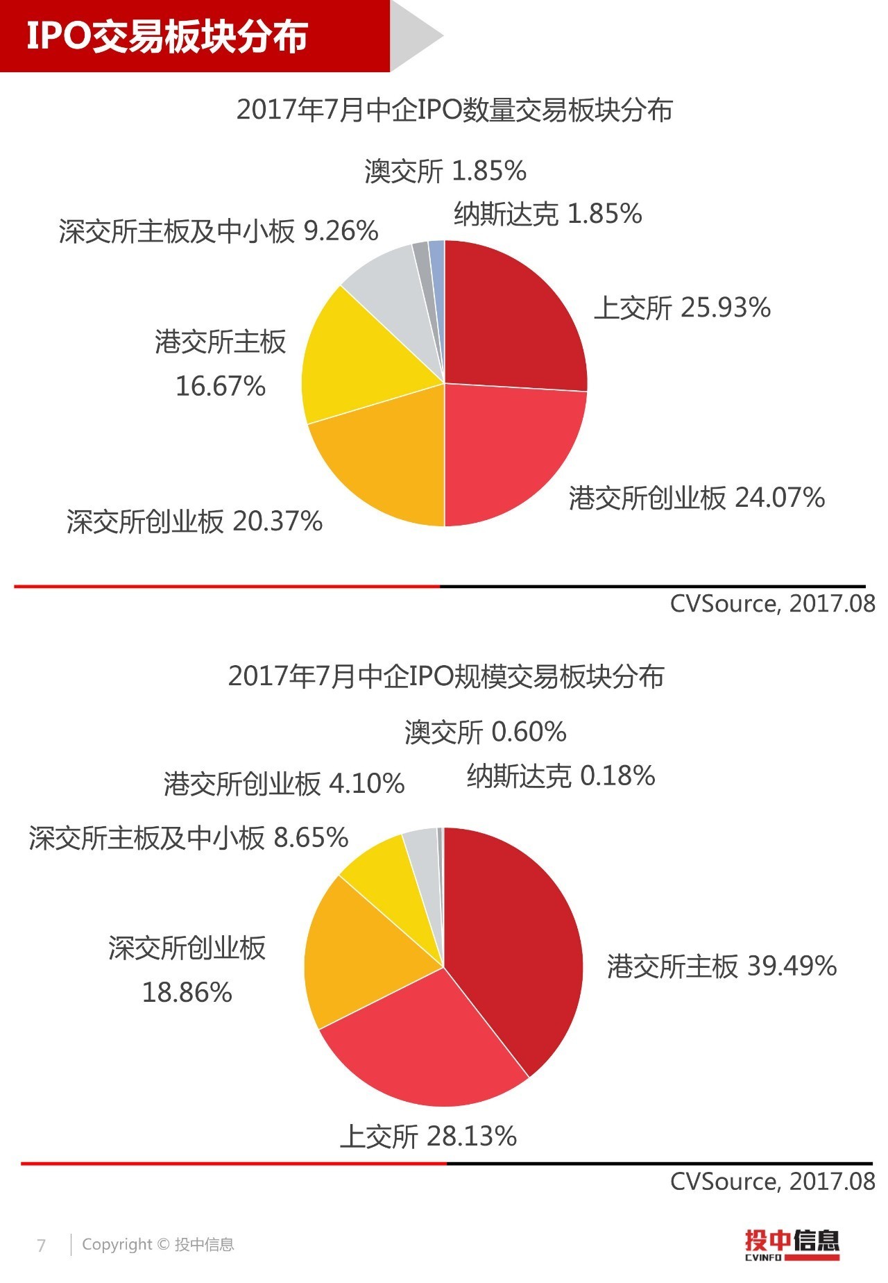 据投中研究院研究报告《中企IPO2017年7月统计报告》数据显示,2017年7月全球中企IPO整体稳步增长,共计54家中企IPO,案例数量环比增长14.9%;募资规模268.68亿元人民币,相比上月略有回落,环比下降5.6%。A股市场中企IPO数量和规模均持续下滑,达到自3月份以来的最低值,环比下降幅度分别超过15%和10%。港股市场中企IPO数量则出现爆发式增长,增长速度高达144%。