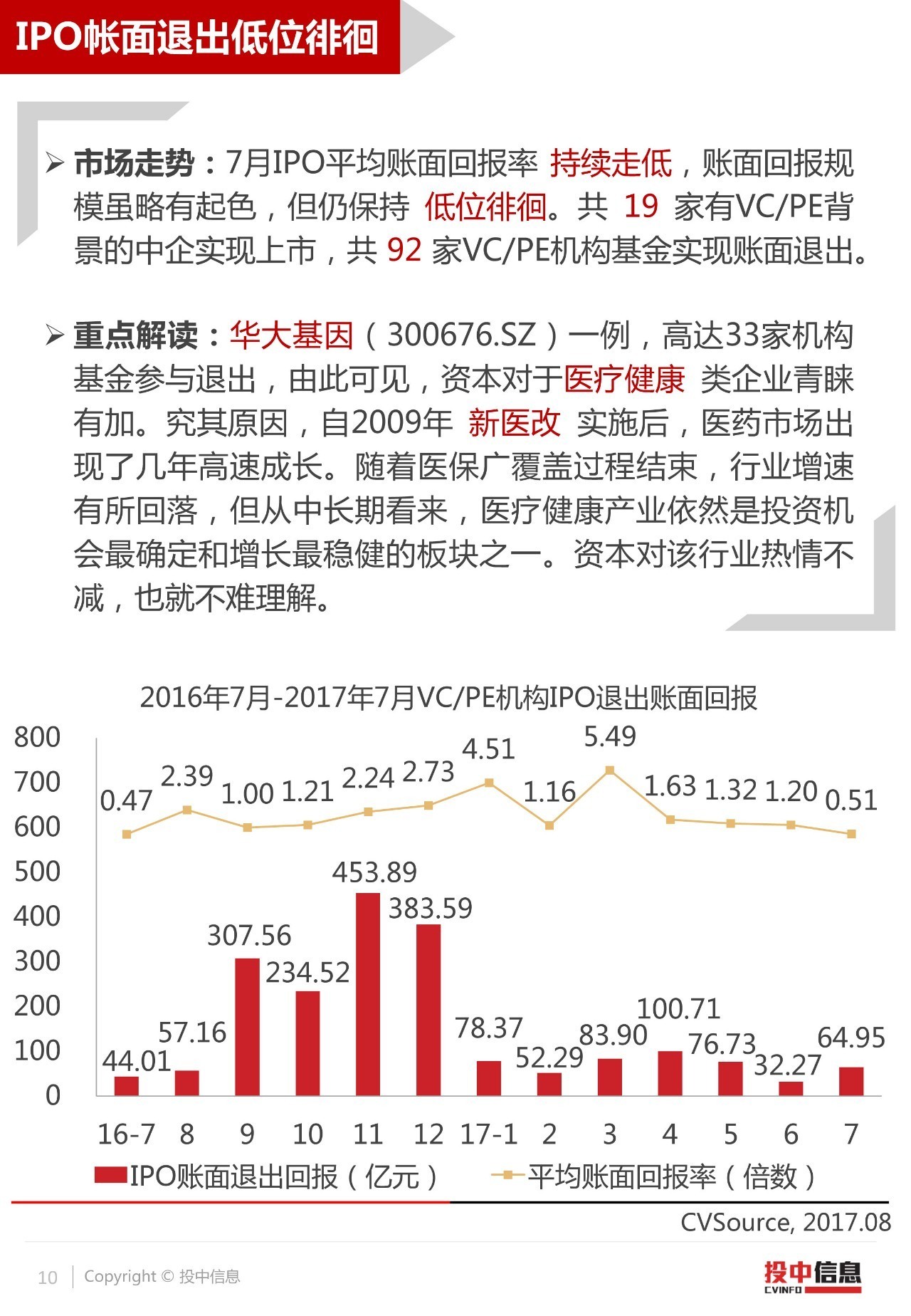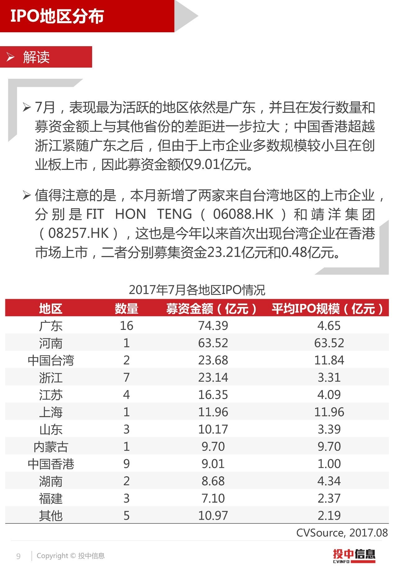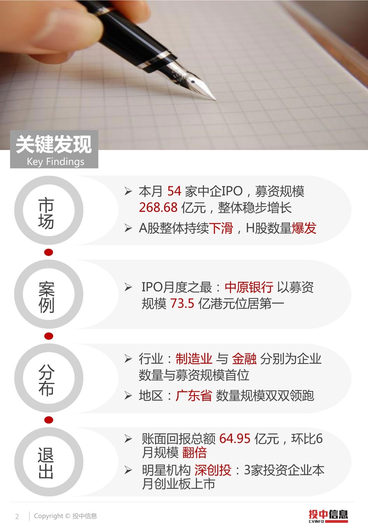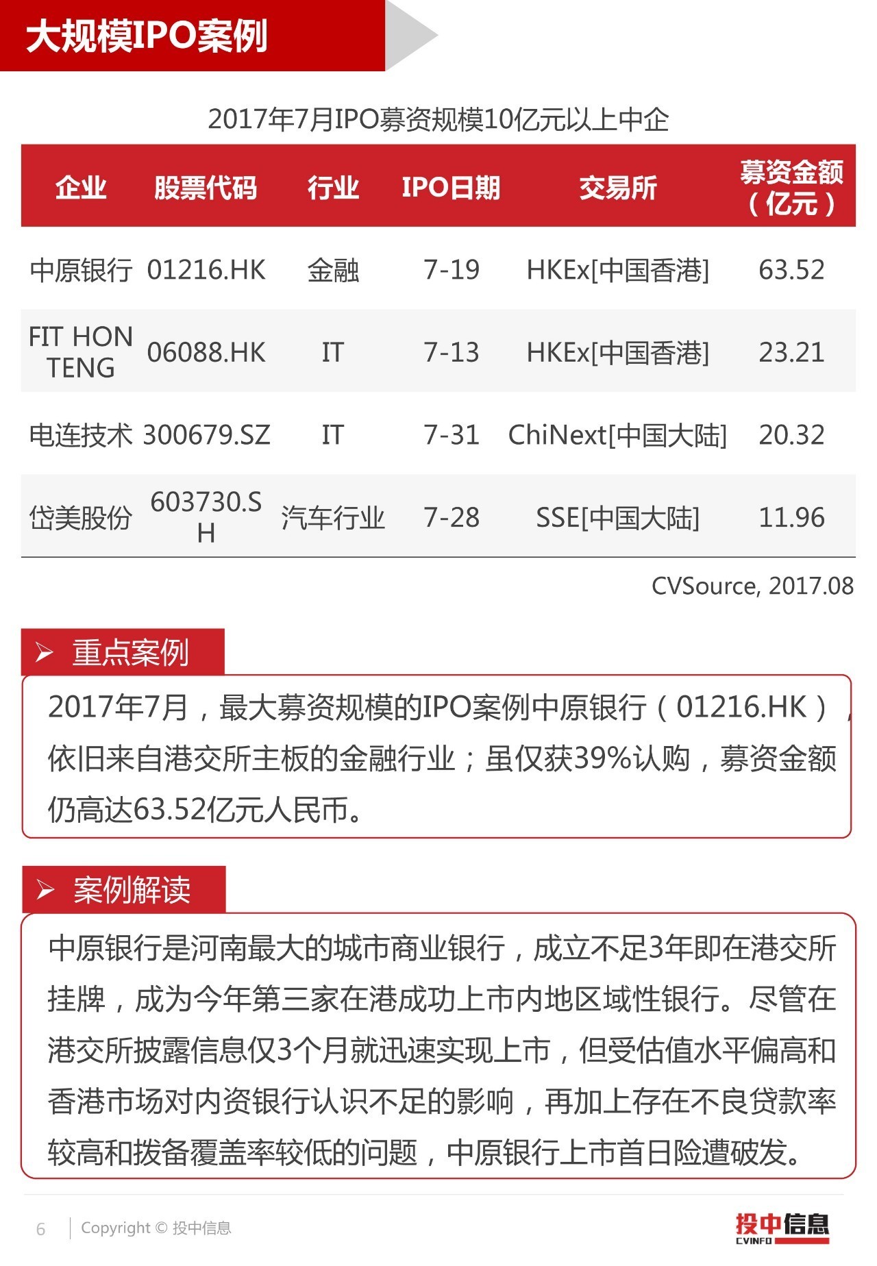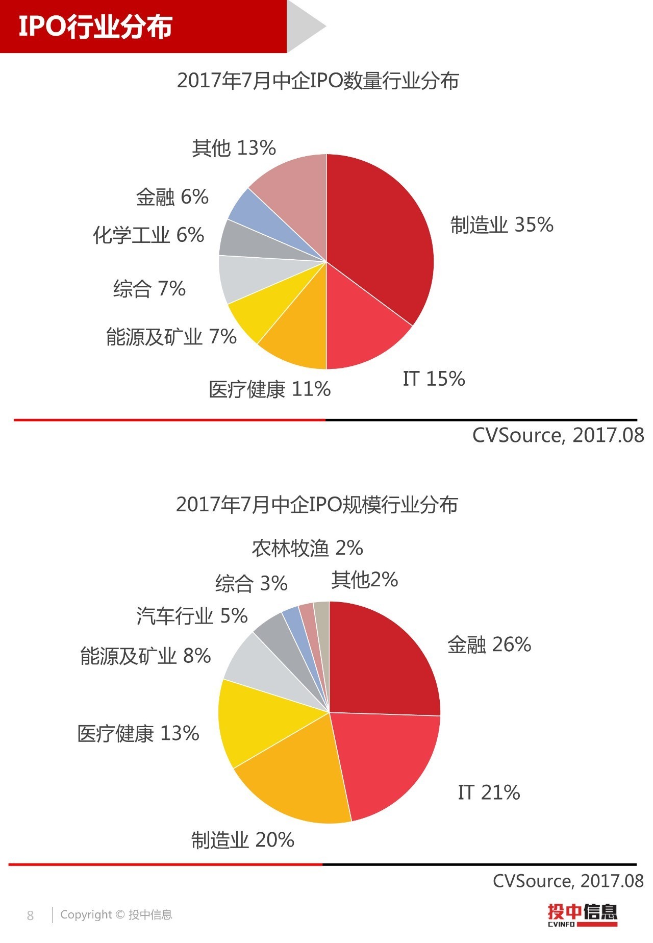 据投中研究院研究报告《中企IPO2017年7月统计报告》数据显示,2017年7月全球中企IPO整体稳步增长,共计54家中企IPO,案例数量环比增长14.9%;募资规模268.68亿元人民币,相比上月略有回落,环比下降5.6%。A股市场中企IPO数量和规模均持续下滑,达到自3月份以来的最低值,环比下降幅度分别超过15%和10%。港股市场中企IPO数量则出现爆发式增长,增长速度高达144%。
