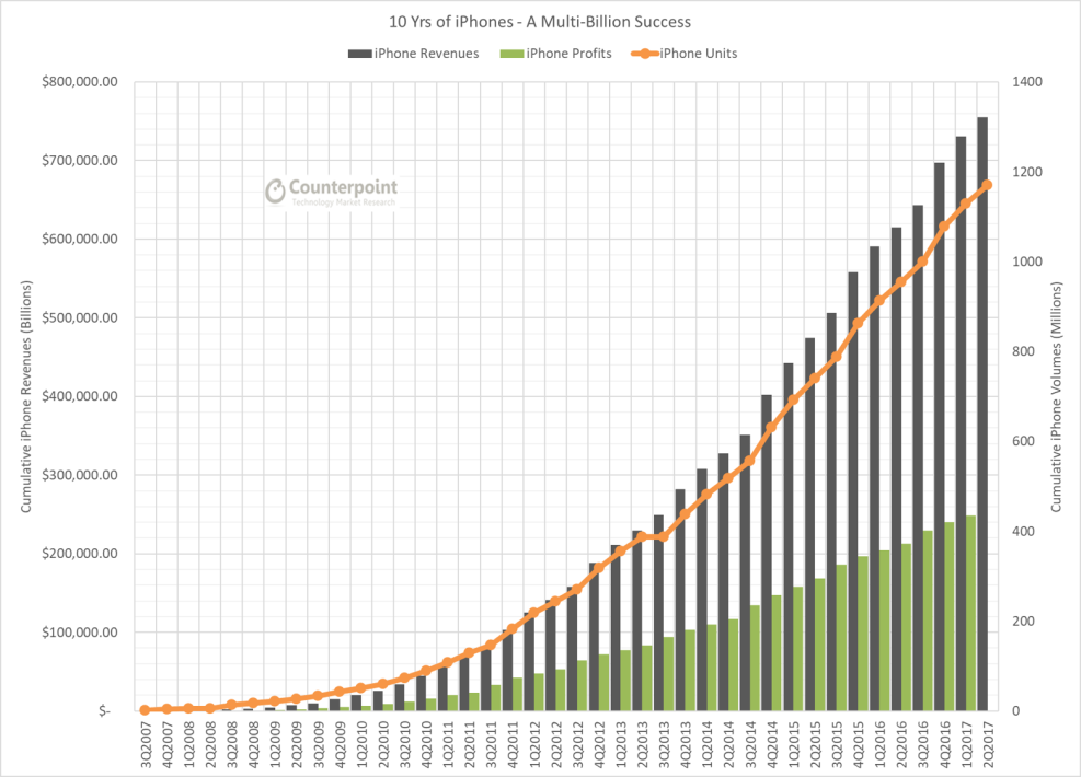 过去十年,iPhone销量11.7亿部;给苹果带来7750亿美元收入;创造2500亿美元利润。