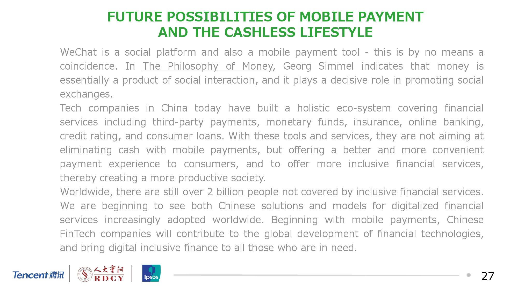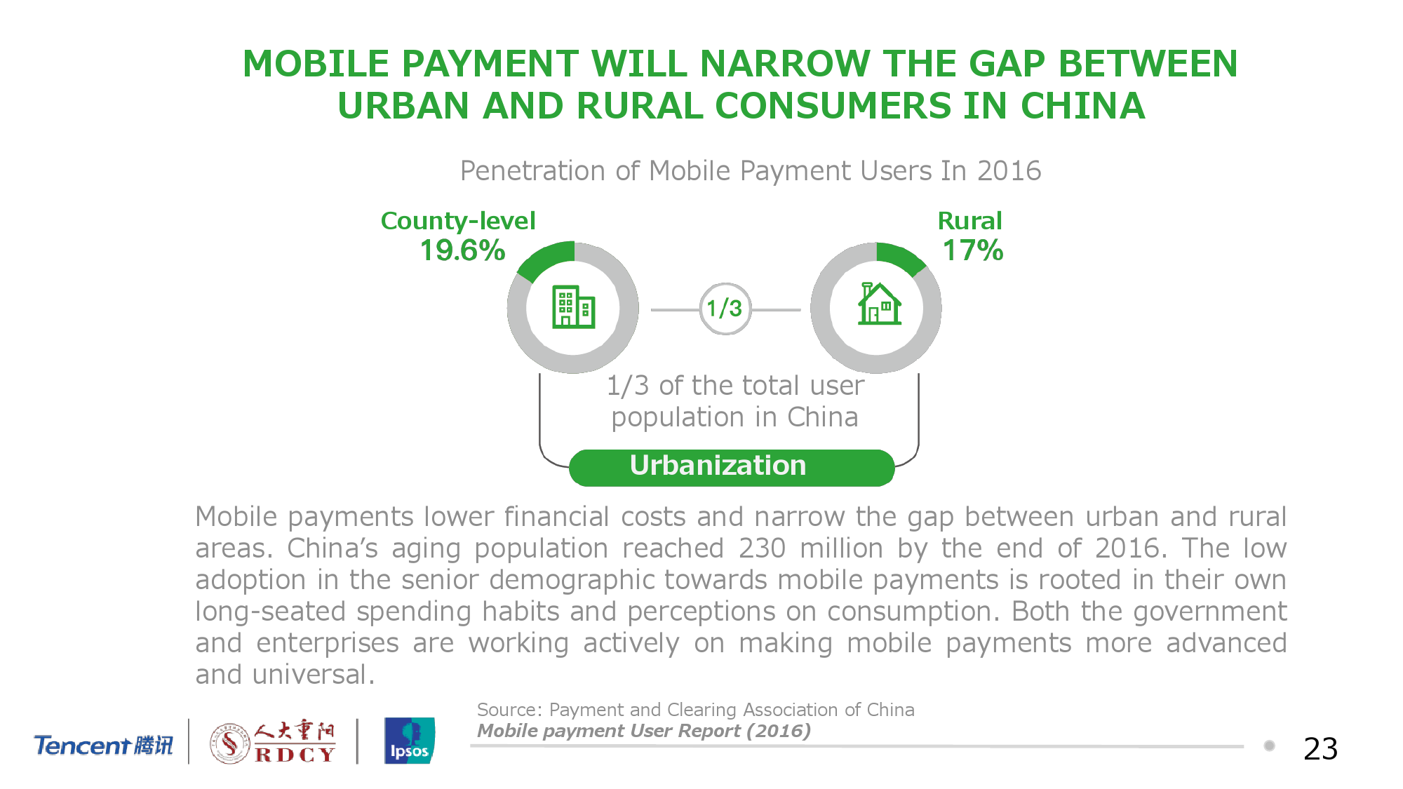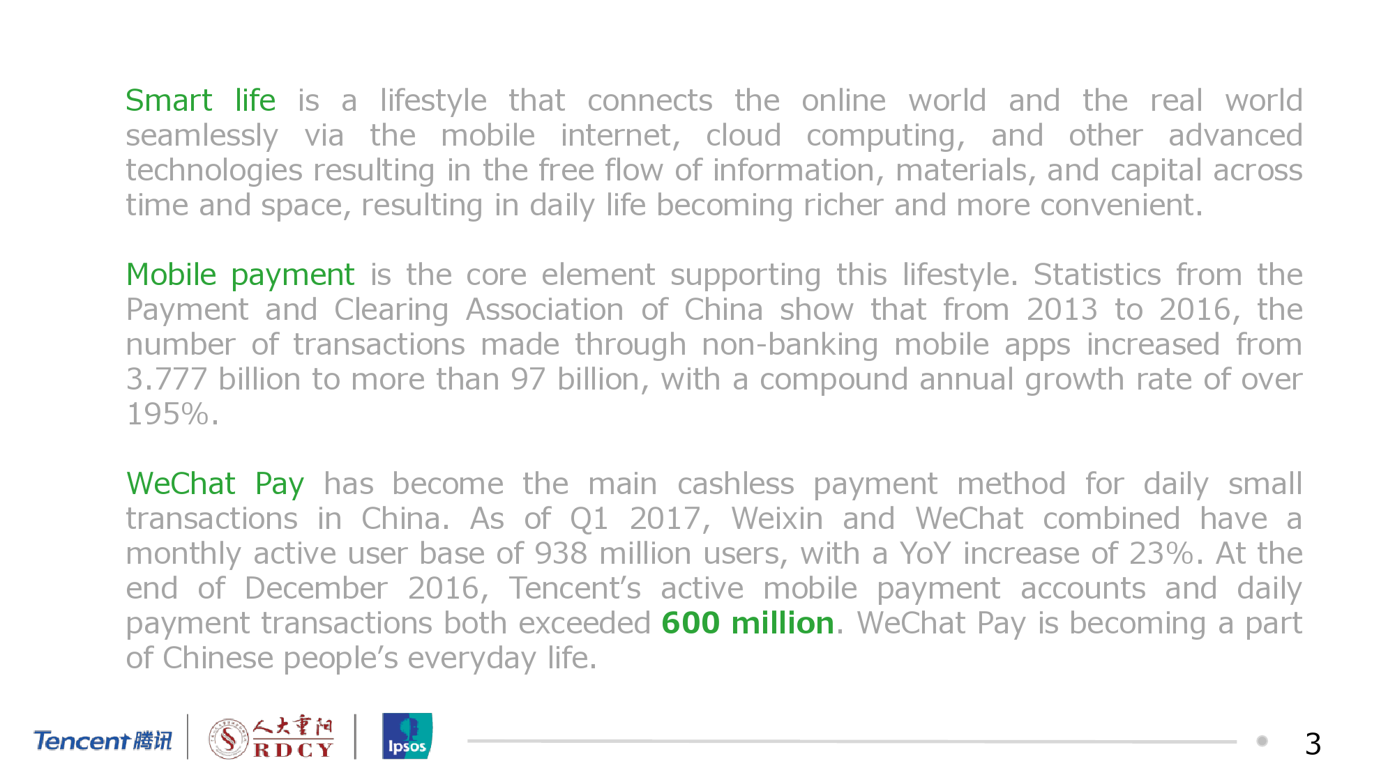近日,China TechInsights根据中国324个城市的WeChat Pay的样本数据,以及6595个受访者的在线调查结果,发布《2017年中国移动支付调查报告》(2017 Mobile Payment Usage in China)。报告中腾讯研究院,中国人民大学(RDCY),重庆金融研究所和益普索观察了用户行为和消费者使用情况“无现金生活方式”案例,并共同推出了2017年中国“移动支付报告”,以说明中国向无现金社会的演变。