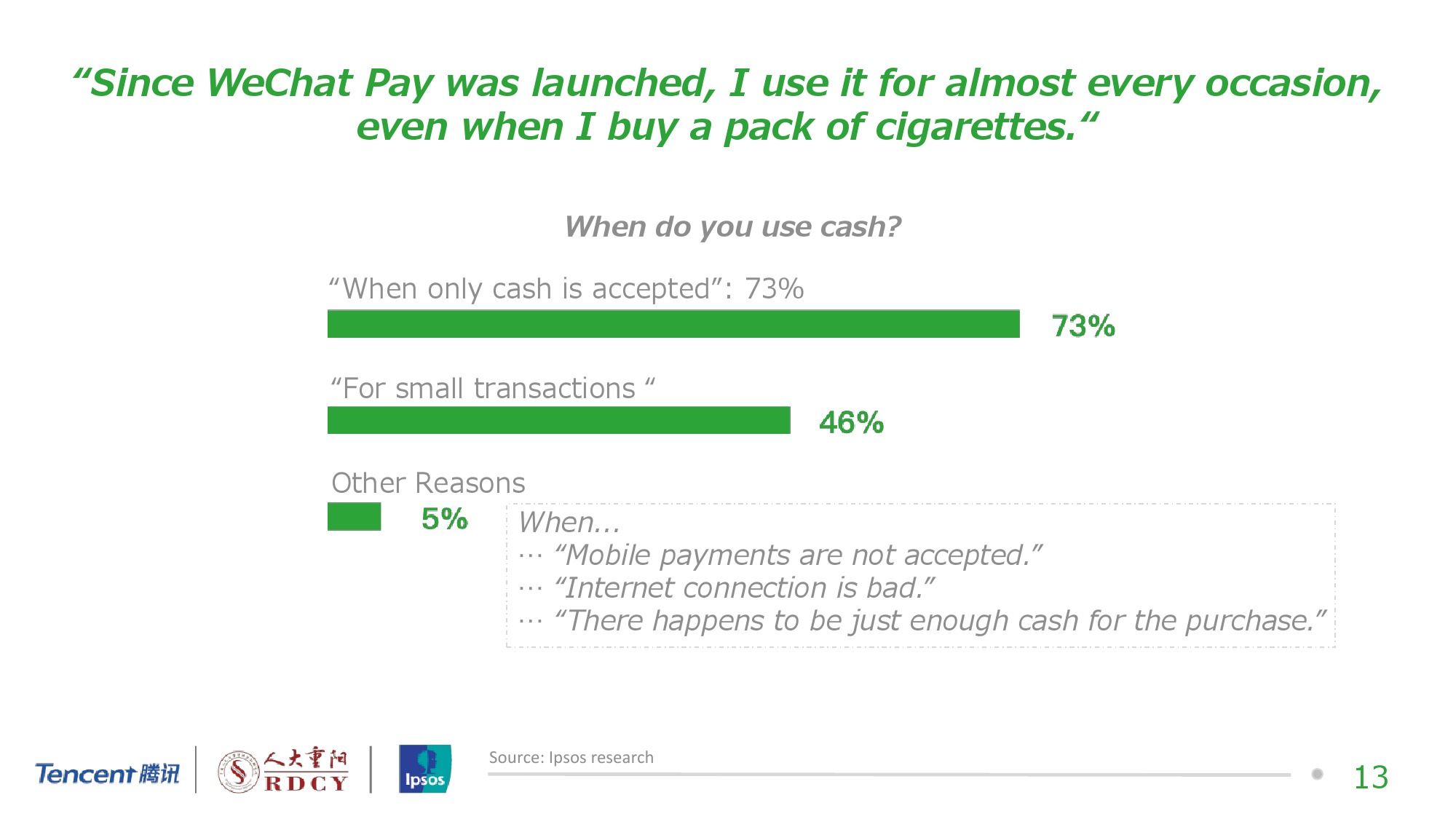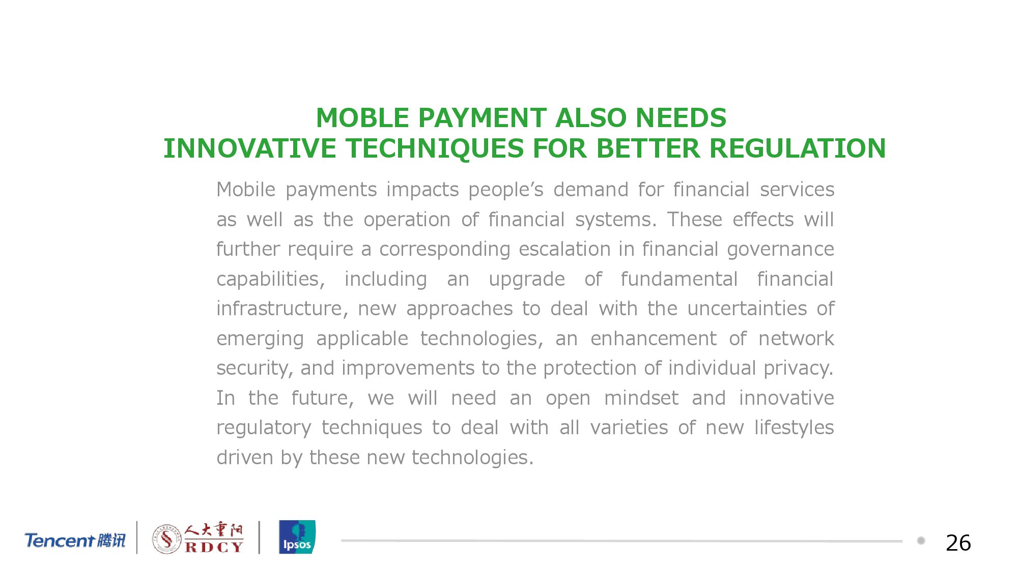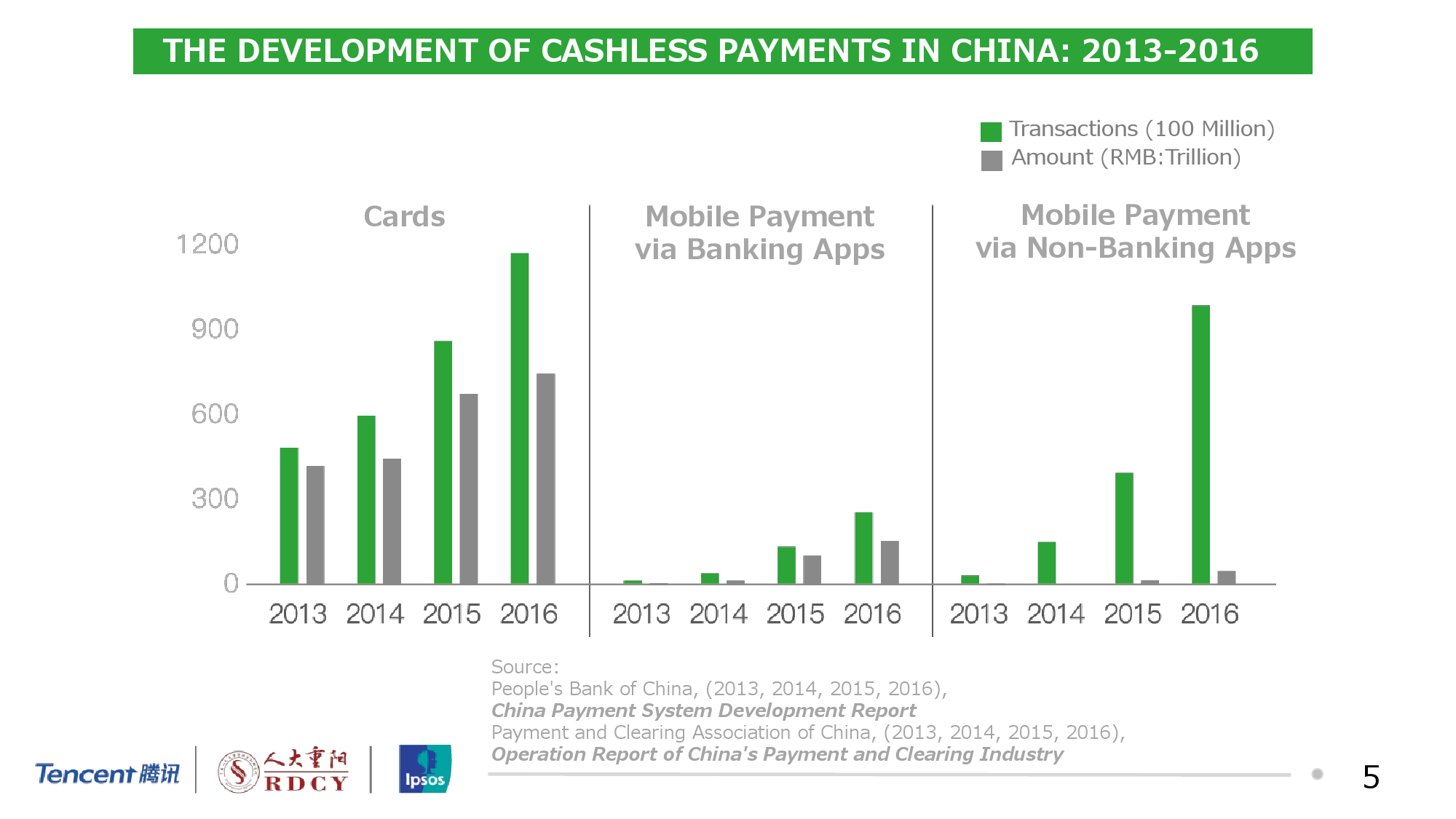 近日,China TechInsights根据中国324个城市的WeChat Pay的样本数据,以及6595个受访者的在线调查结果,发布《2017年中国移动支付调查报告》(2017 Mobile Payment Usage in China)。报告中腾讯研究院,中国人民大学(RDCY),重庆金融研究所和益普索观察了用户行为和消费者使用情况“无现金生活方式”案例,并共同推出了2017年中国“移动支付报告”,以说明中国向无现金社会的演变。